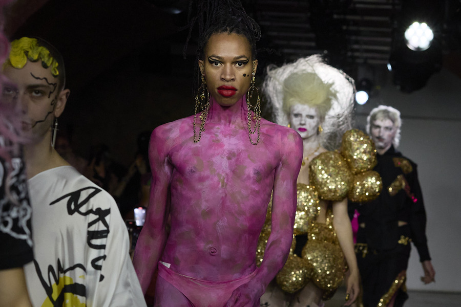 This season Adam has also collaborated with multi-disciplinary artist Olivia Strange on a PVC and plaster dress which features witch-like hand sculptures on each shoulder. It’s aptly titled ‘It Takes Courage to Enjoy It, the Hardcore and the Gentle’, taken from the Björk track ‘Big Time Sensuality’ and is about finding moments of pleasure in seemingly unending chaos and pain. Another notable conceptual look are the gold sequin ‘Bobble Dress’ which takes the idea of ‘couture’ and completely turns it on its head, skewing the wearer’s silhouette and form.