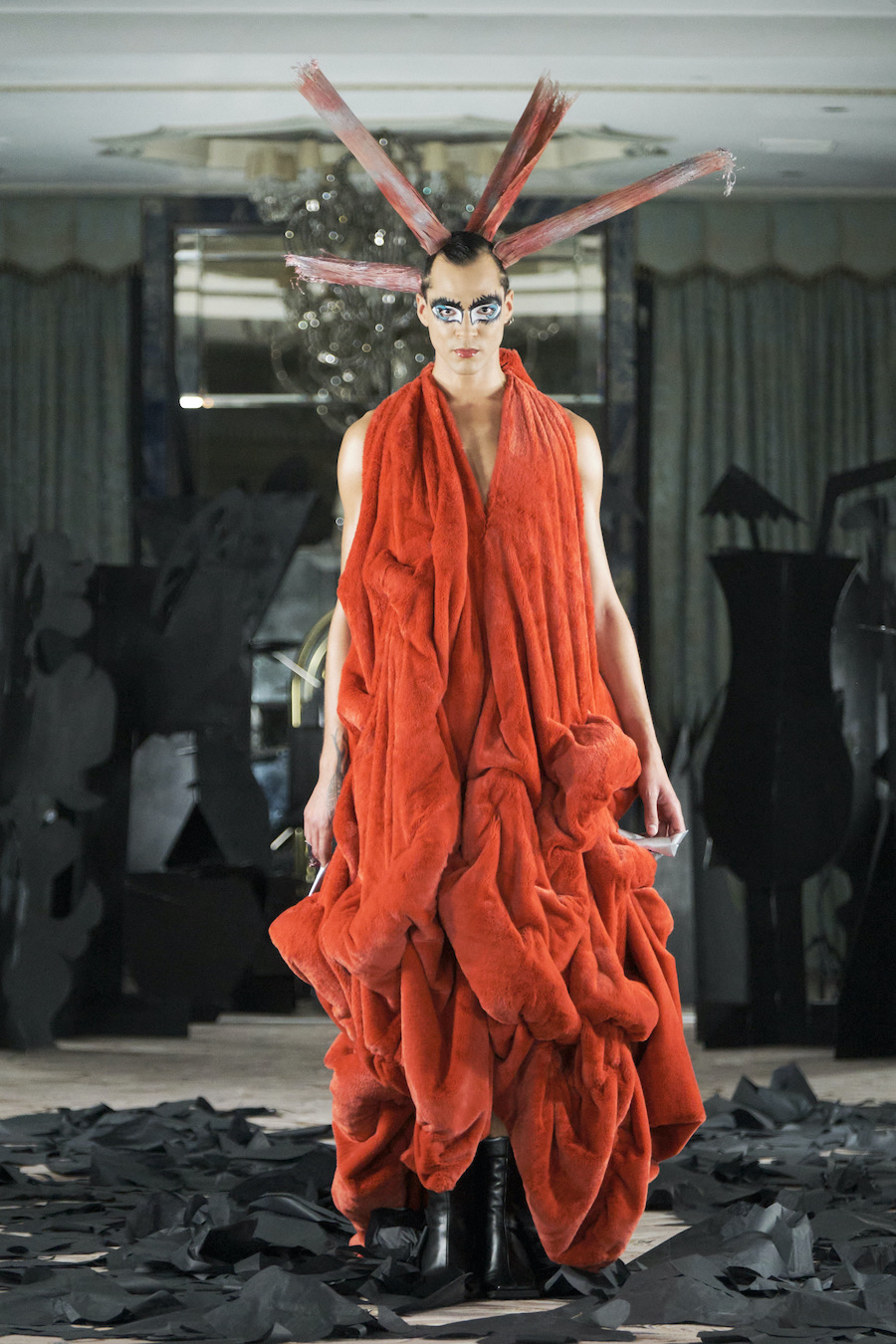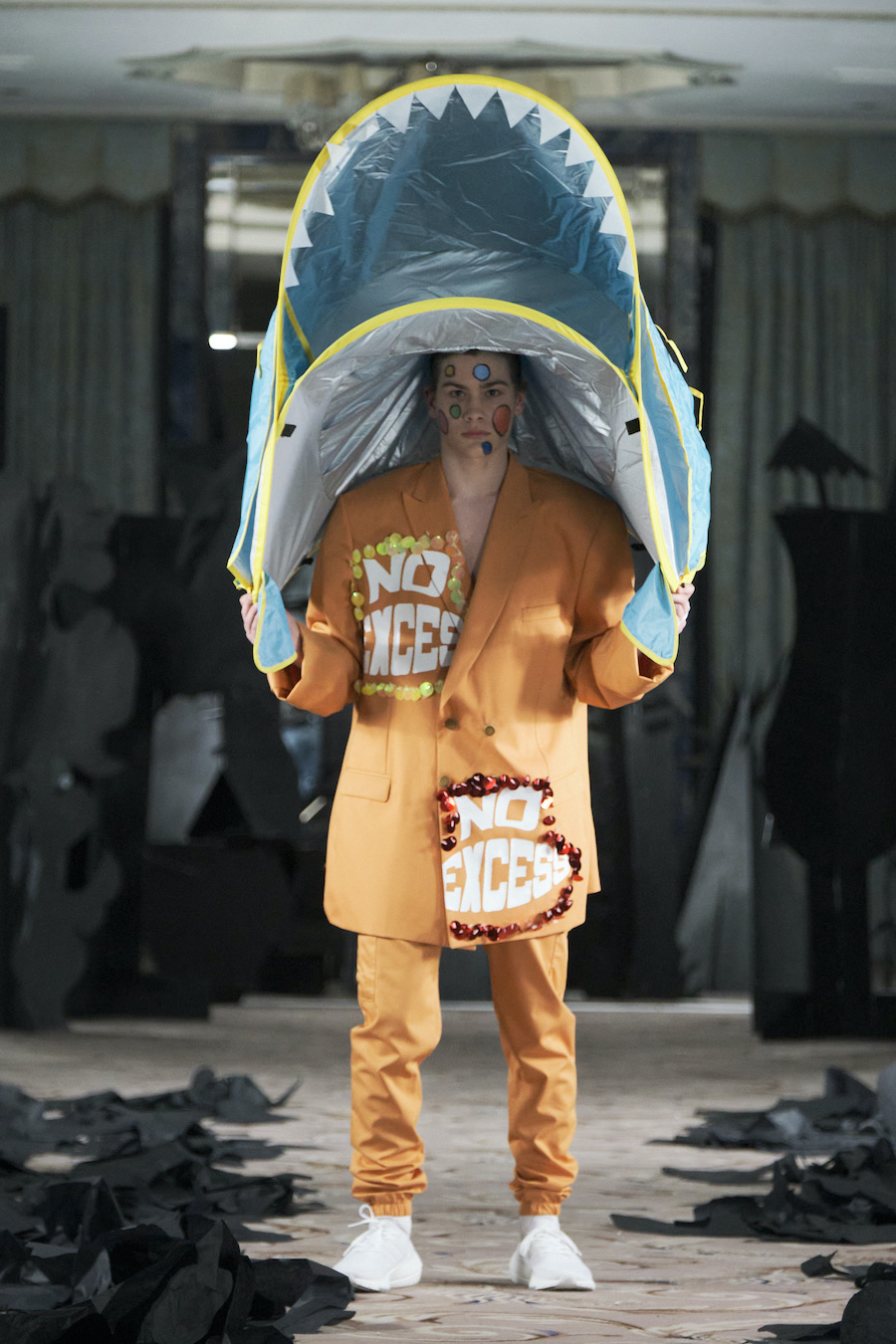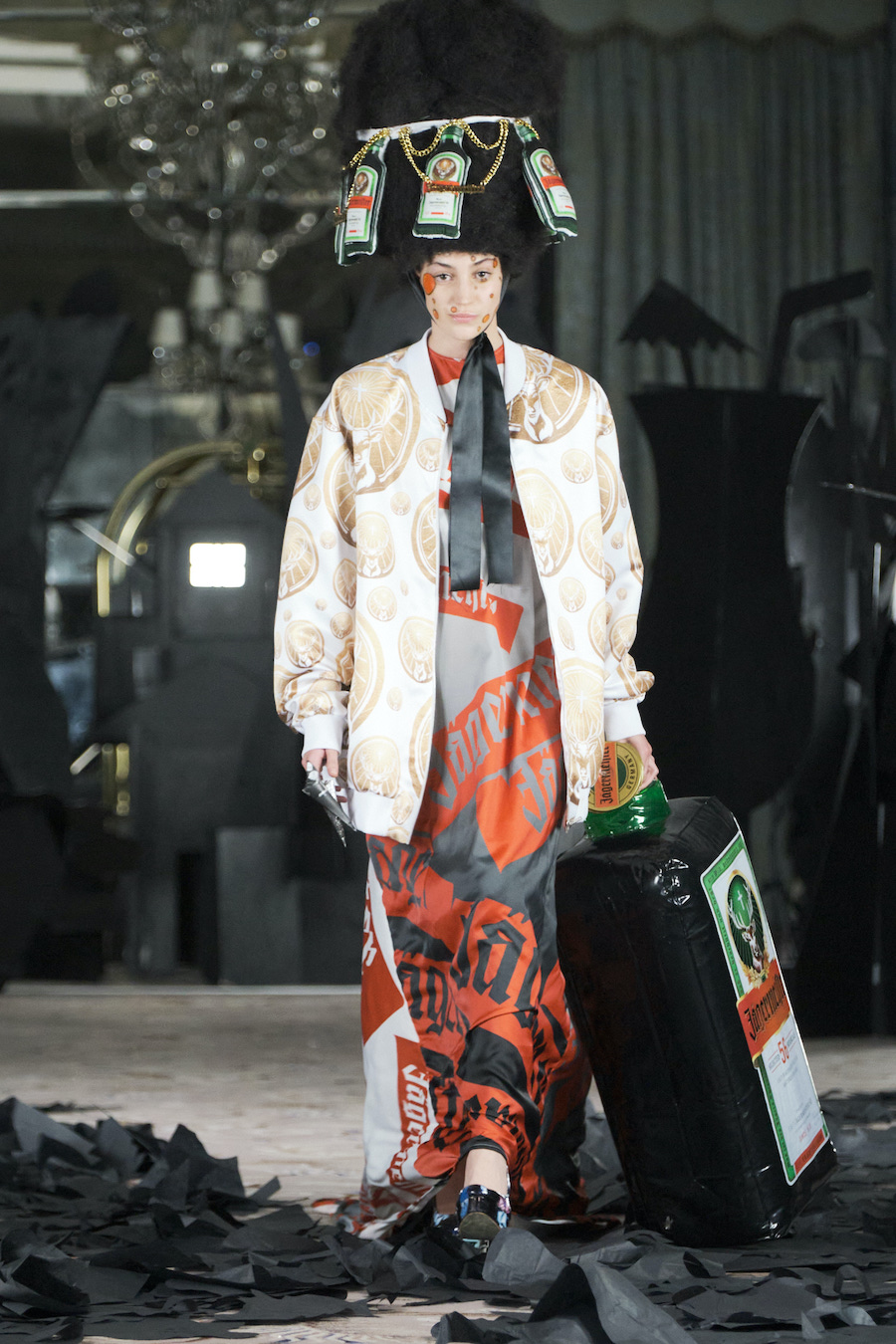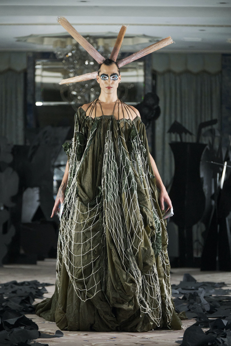 Continuing their on-going collaboration with HRH Prince of Wales to utilise waste in providing sustainable solutions to waste management. Willow rods pruned from the Highgrove estate have been processed into textile, plant pots have been crafted into jewellery and VIN + OMI Nettle fabric made from nettles. Their on-going collaboration with Jagermeister also featured an outfit made from recycled promotional material.