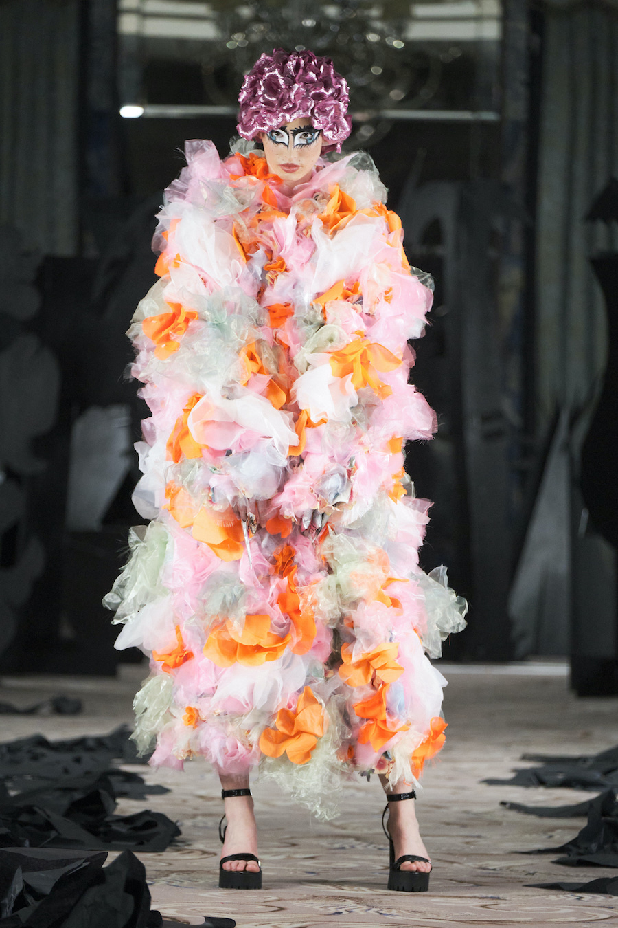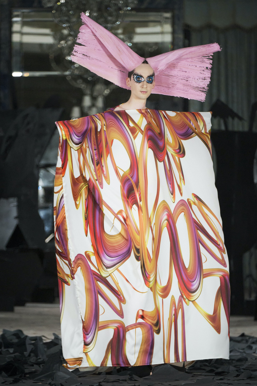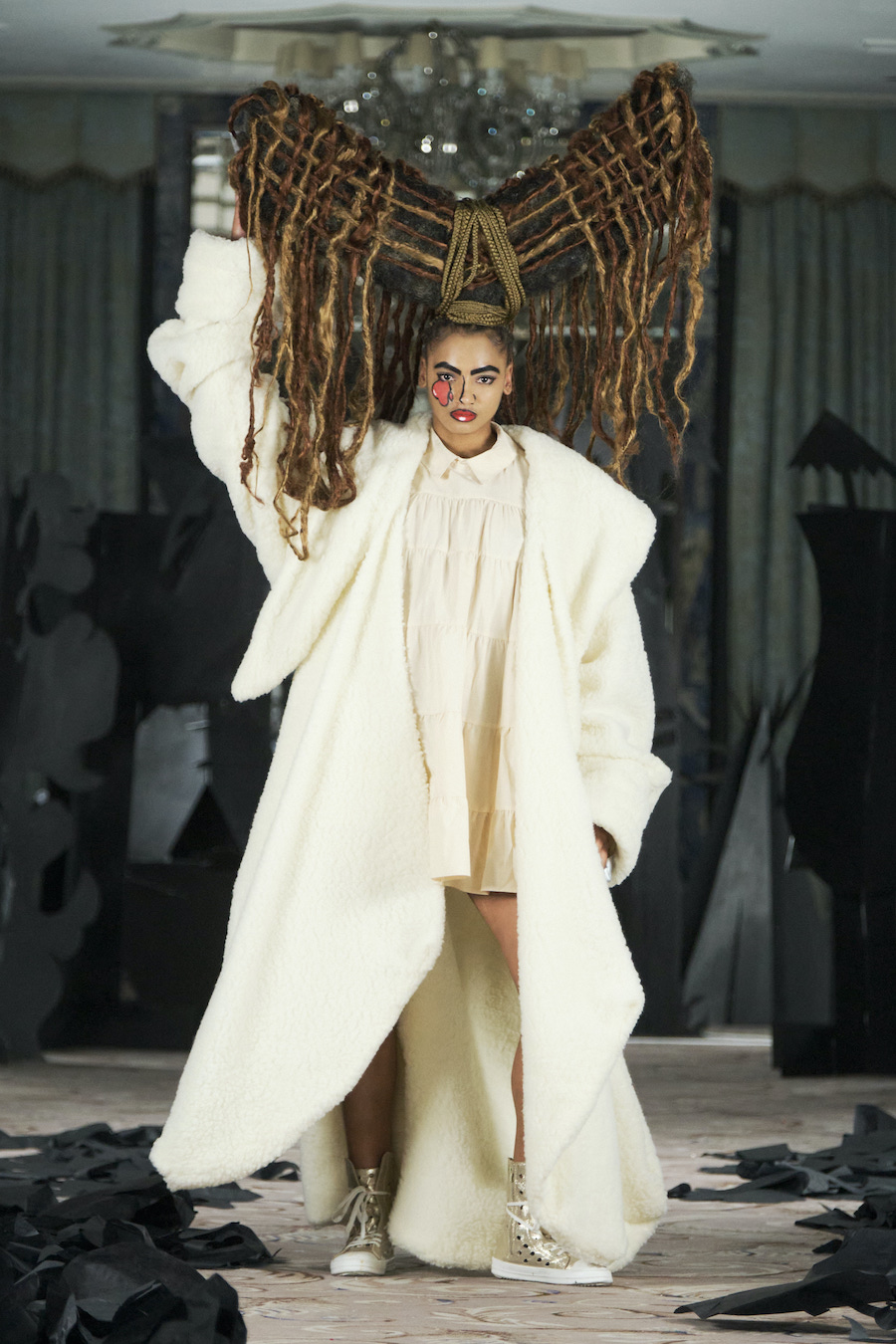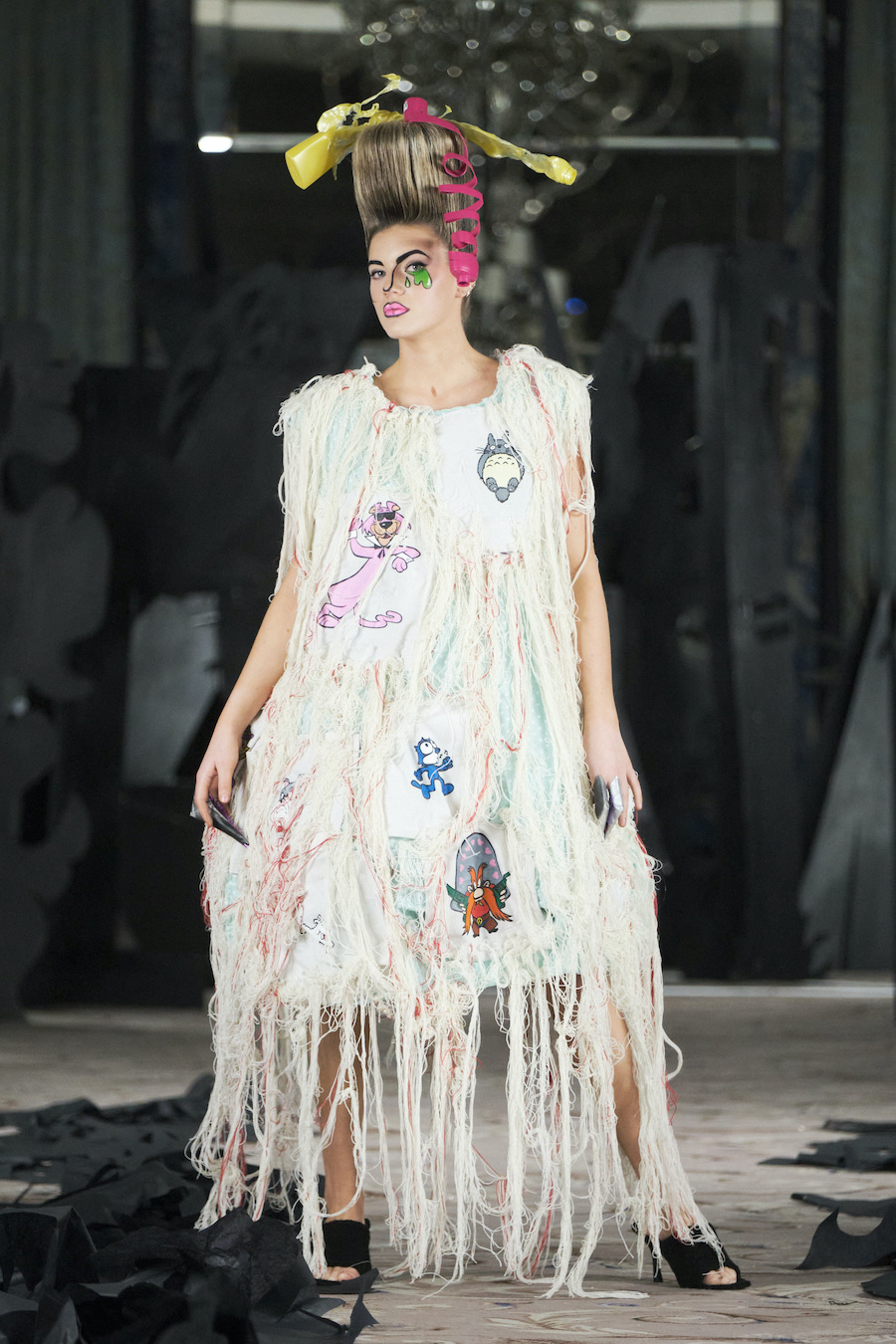 Continuing their on-going collaboration with HRH Prince of Wales to utilise waste in providing sustainable solutions to waste management. Willow rods pruned from the Highgrove estate have been processed into textile, plant pots have been crafted into jewellery and VIN + OMI Nettle fabric made from nettles. Their on-going collaboration with Jagermeister also featured an outfit made from recycled promotional material.