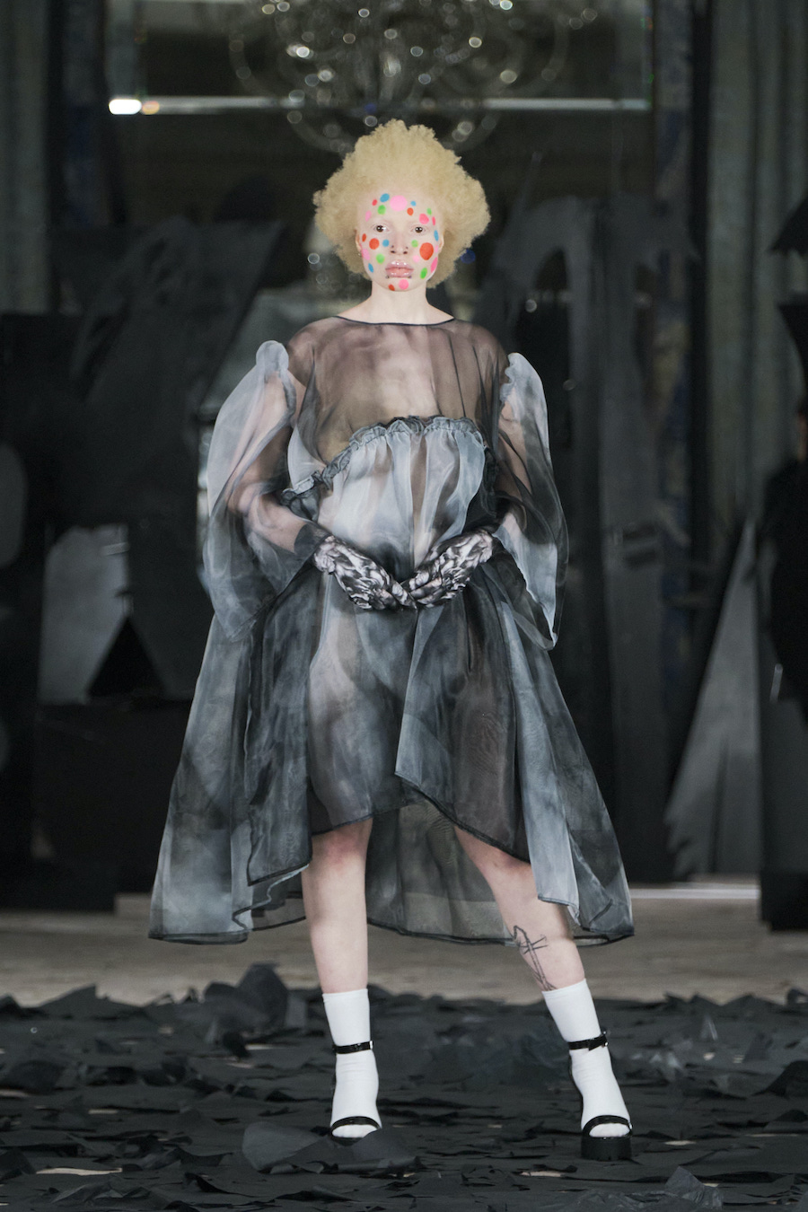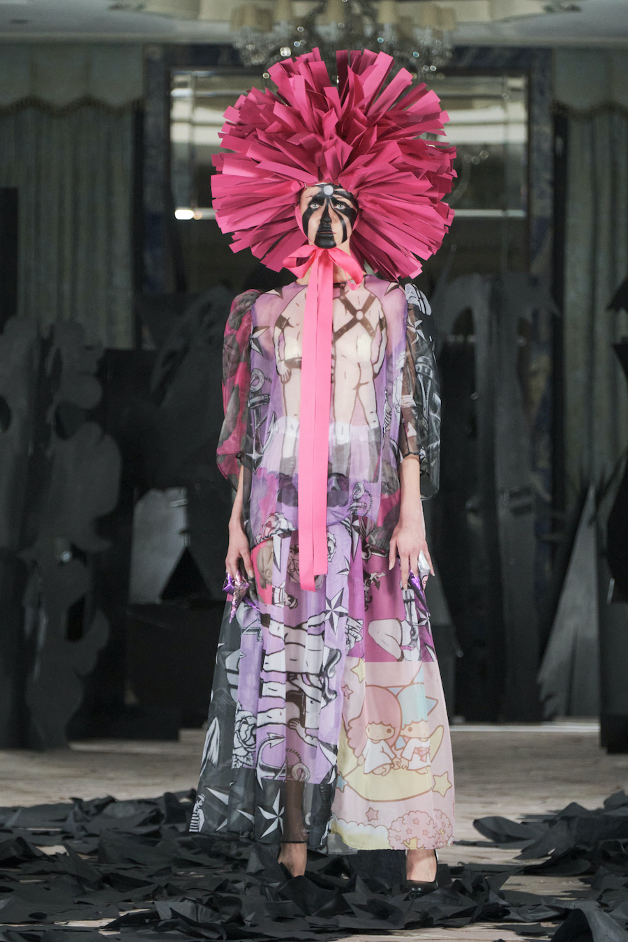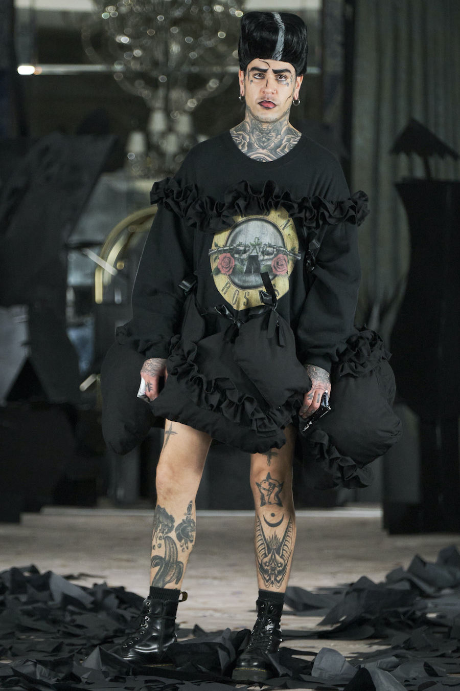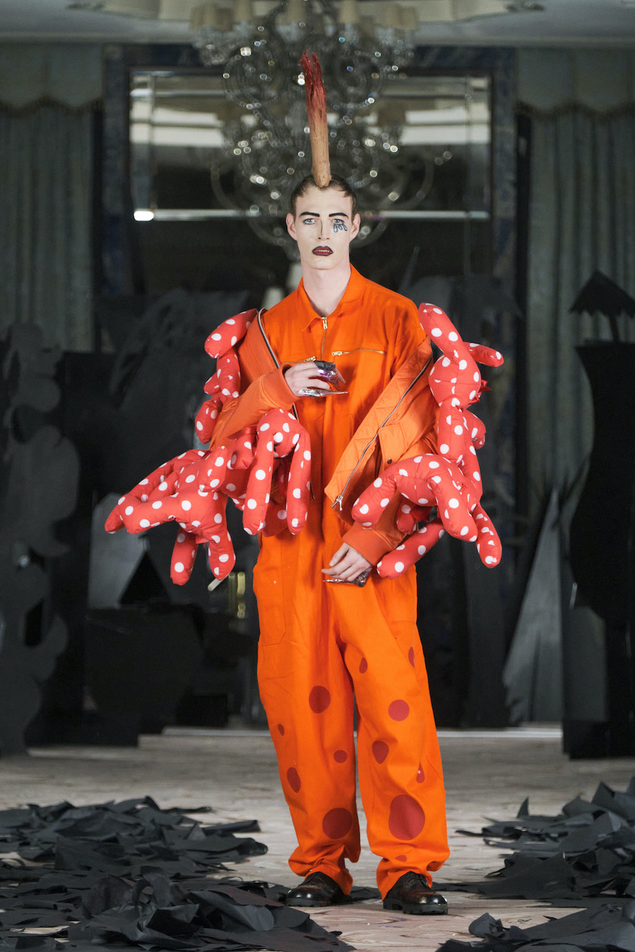 Continuing their on-going collaboration with HRH Prince of Wales to utilise waste in providing sustainable solutions to waste management. Willow rods pruned from the Highgrove estate have been processed into textile, plant pots have been crafted into jewellery and VIN + OMI Nettle fabric made from nettles. Their on-going collaboration with Jagermeister also featured an outfit made from recycled promotional material.
