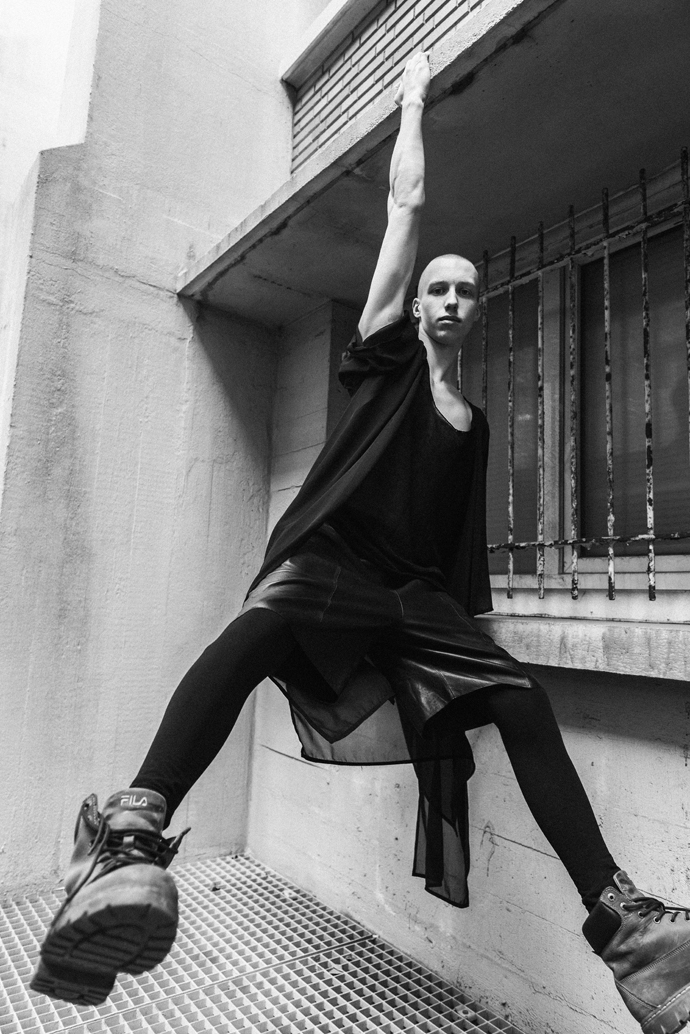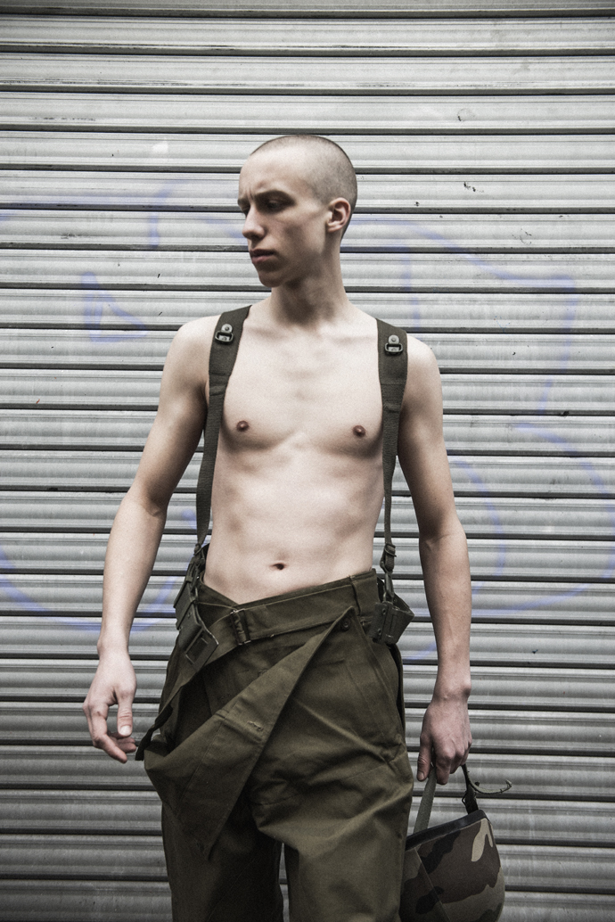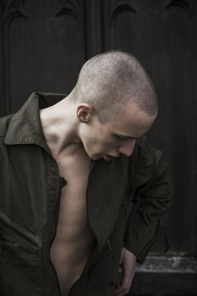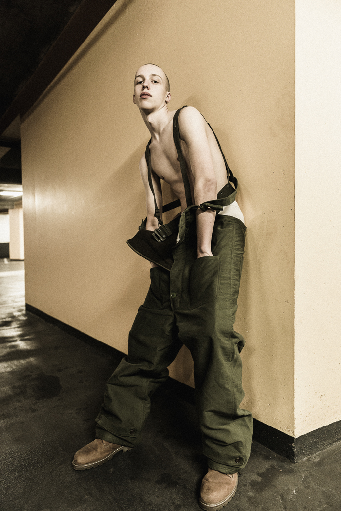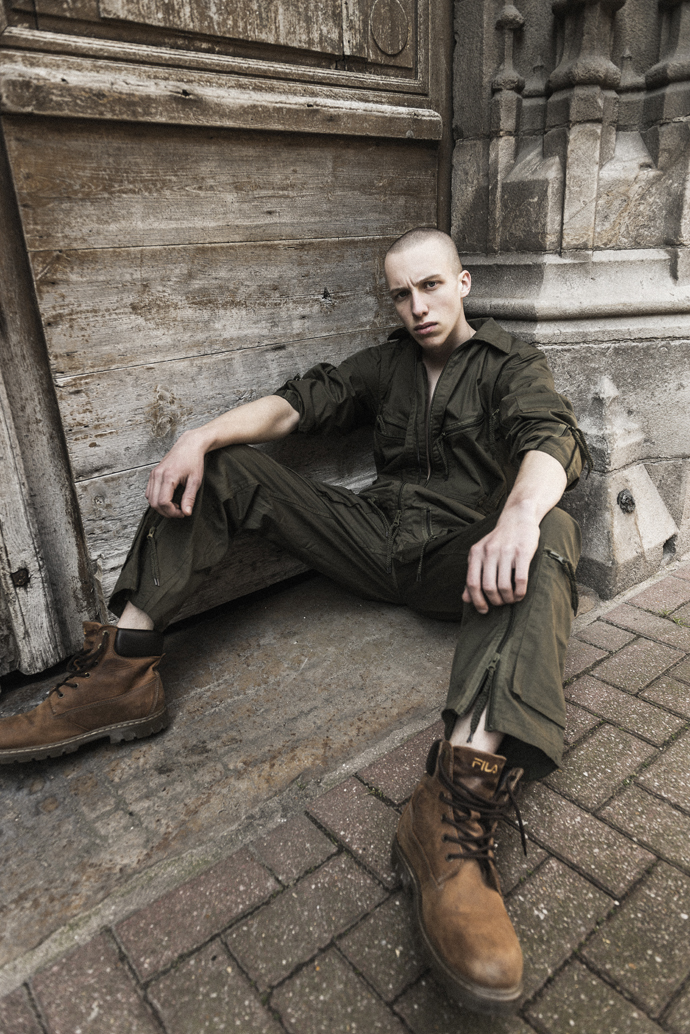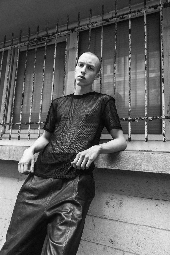 A KALTBLUT exclusive menswear editorial. Photography by Clément Decoster. Model is new face Arthur B. Styling by Geoffrey Delchambre. A designer of haute couture and make everyday classics clothes, he created all the look & on others he bought used clothes that he modified on his side, there is no brand of clothing these are all these personal creations. “My name is Clément Decoster, I live in Lille, in the north of France, near Lille. I am freelance photographer for 5 years. I have an artistic school career in drawing, painting, art history, the entire graphic chain leading from image to print. it’s a common set that serves me in my work. I find my inspirations through different worlds such as fashion, skateboarding, streetwear, rap, sports, cinema and music. My photo activity is the image of my inspirations, I have the chance to live my hobby and my passions every day. I have always had an attraction for originality, through less common styles such as medium hardcore, which is my source of inspiration and motivation to date. With time, the fashion picture is my favorite activity, it appeared to me and I find a source of inspiration, a creativity constantly that allows me to have fun. I also enjoy the lifestyle with models and concert photography. These different environments meet, each environment has its audience and it allows me to continually meet new people, new heads to fill my pokedex.”