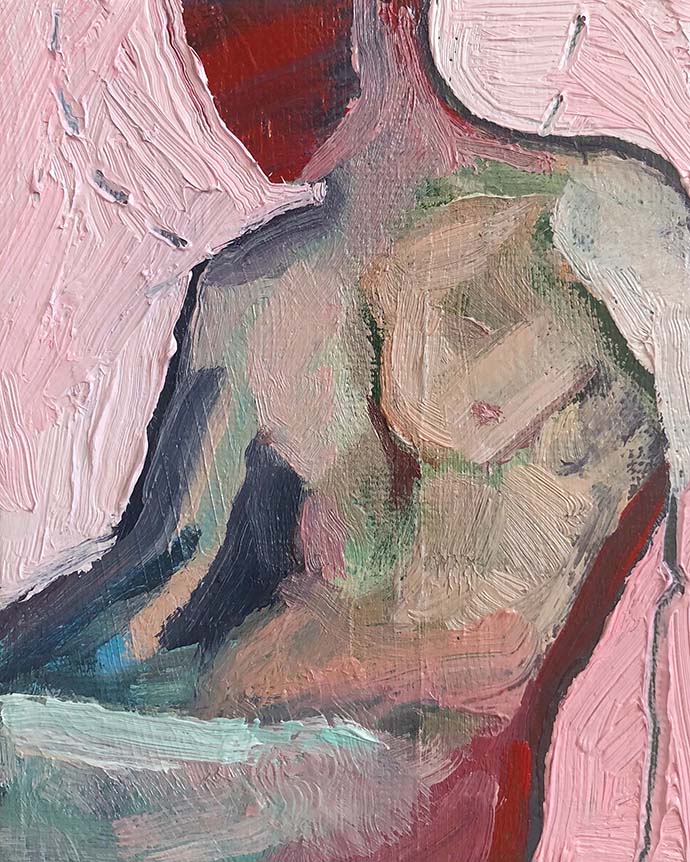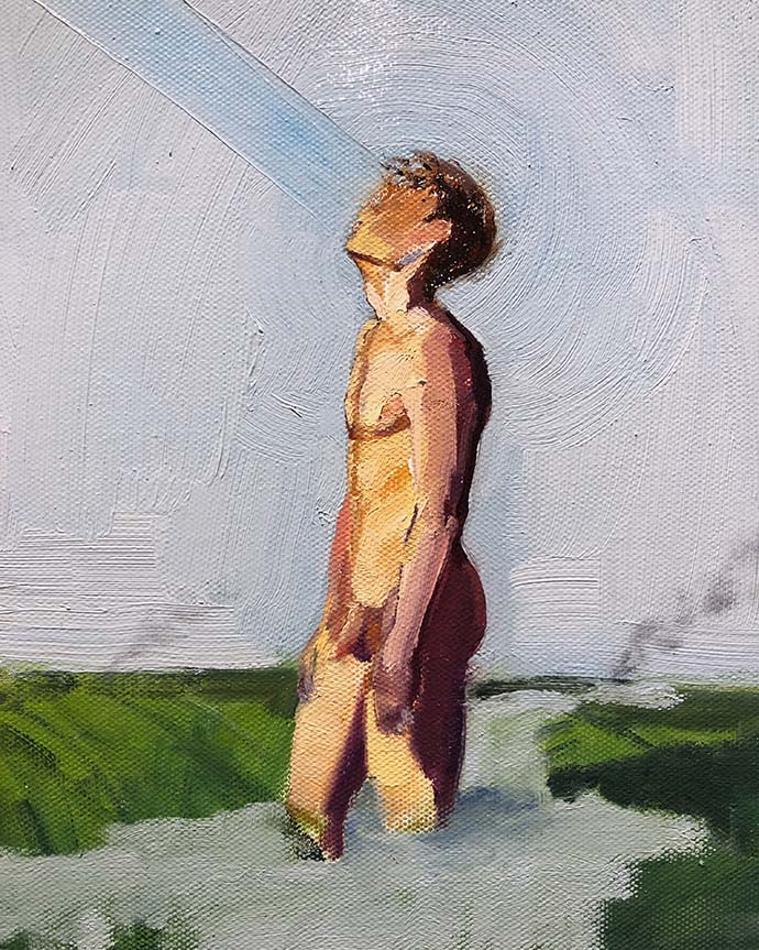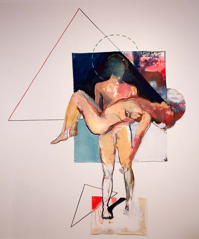 Yes, I have noticed that it is now a trend in the art world to work in these ways though. Many artists are working on the walls and going off the canvas. These ideas really interested me in undergrad. I was thinking about how to communicate feeling like an outsider to the larger Christian community that I grew up in. I started to work in the white space of the gallery walls as a way of saying that sometimes we limit our understanding to traditional ways and trying to break that. I cut out the figures in my paintings and allowed them to exist in the white space without any environment to support them. This to me was a way of freeing myself to exist in uncertainty. A new sacred space for me. These are not new or groundbreaking ideas, but they were my way of creating a space for myself. As far as the unfinished moments, I think of Cézanne’s Still Life with Apples that is hanging in the Museum of Modern Art in New York. I think of Michelangelo’s Slave sculptures that were left in the marble. Those are examples of artwork that allowed the tension and uncertainty that I feel about God or existing as a queer person. The process of those pieces leaves the viewer with mystery, uncertainty, and ways to complete the artwork in their own minds. I am crazy about that idea. There is so much we do not know or understand. Art should reflect that. I have tried to use the moments in my work, but I think it will take a whole lifetime to make something that speaks in ways that Cézanne and Michelangelo speak to me.