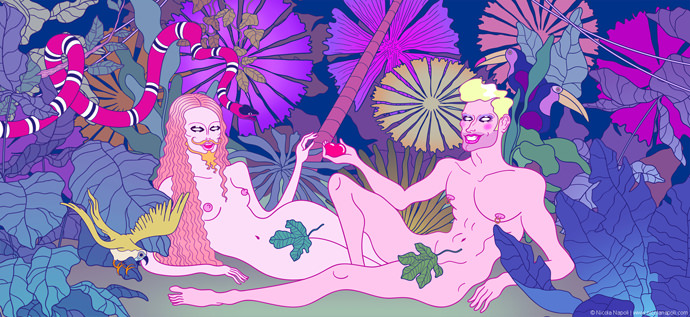 Nicola: Yeah from an artistic point of view I would say that each one’s inspirational process starts from the concrete things that surround and attract us most. Berlin nightlife is indeed a very powerful visual element, it’s at the same time wild, sexy, bizarre, hardcore, poetic, funny, dramatic, playful. People see these parties as a temporary escape from every day’s grayness. It reminds me a bit Roger Rabbit’s Toontown, do you remember that movie? A grotesque cartoon world on the other side of a road tunnel in L.A.
