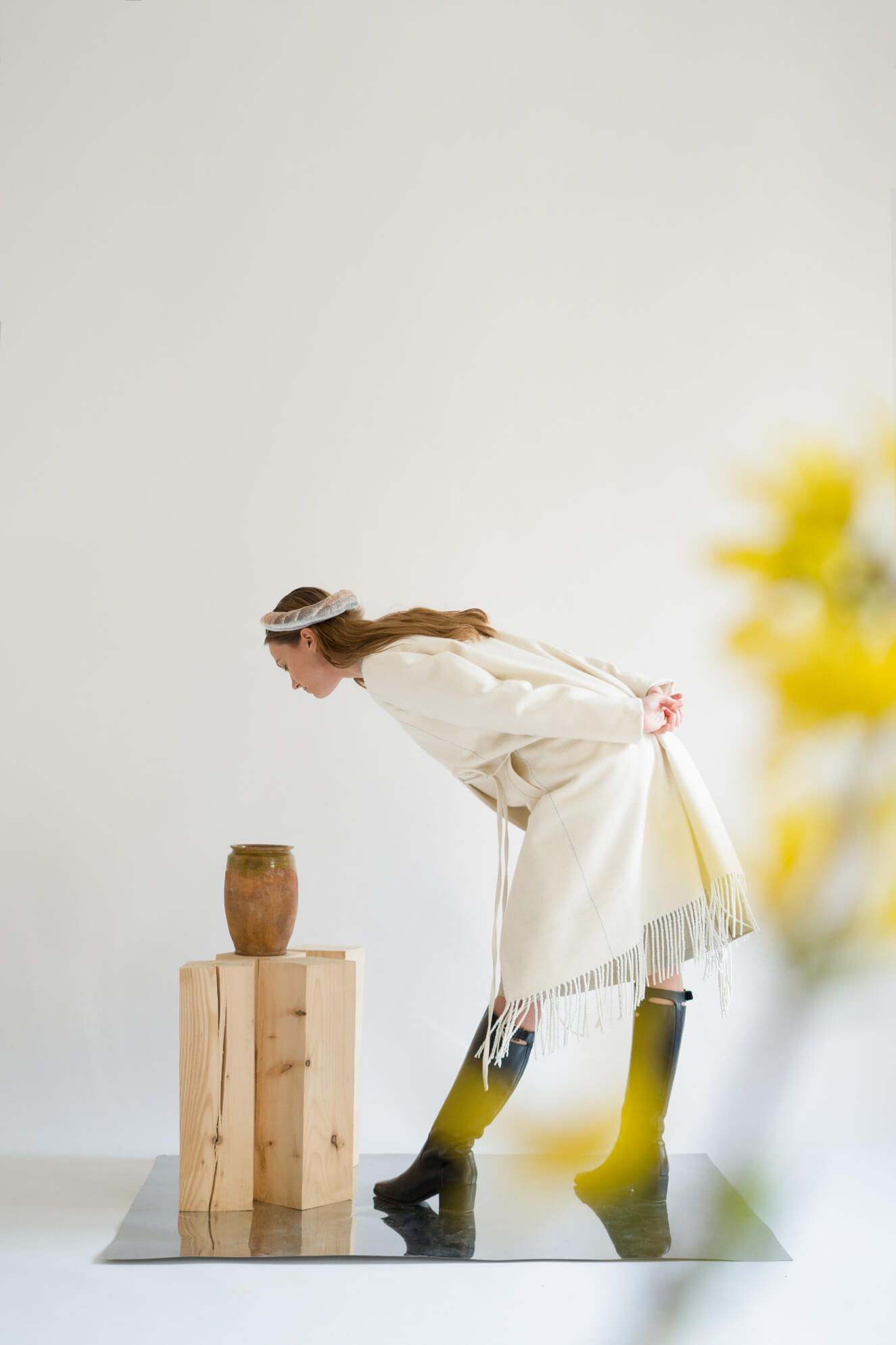 Glass beads embroidery, inspired by the works of Constantin Brancusi. The warm wood texture of the side table. Shirt Dress from a linen tablecloth – a sense of homeliness.