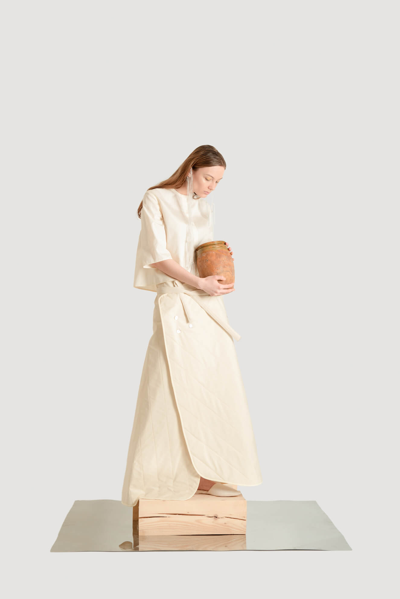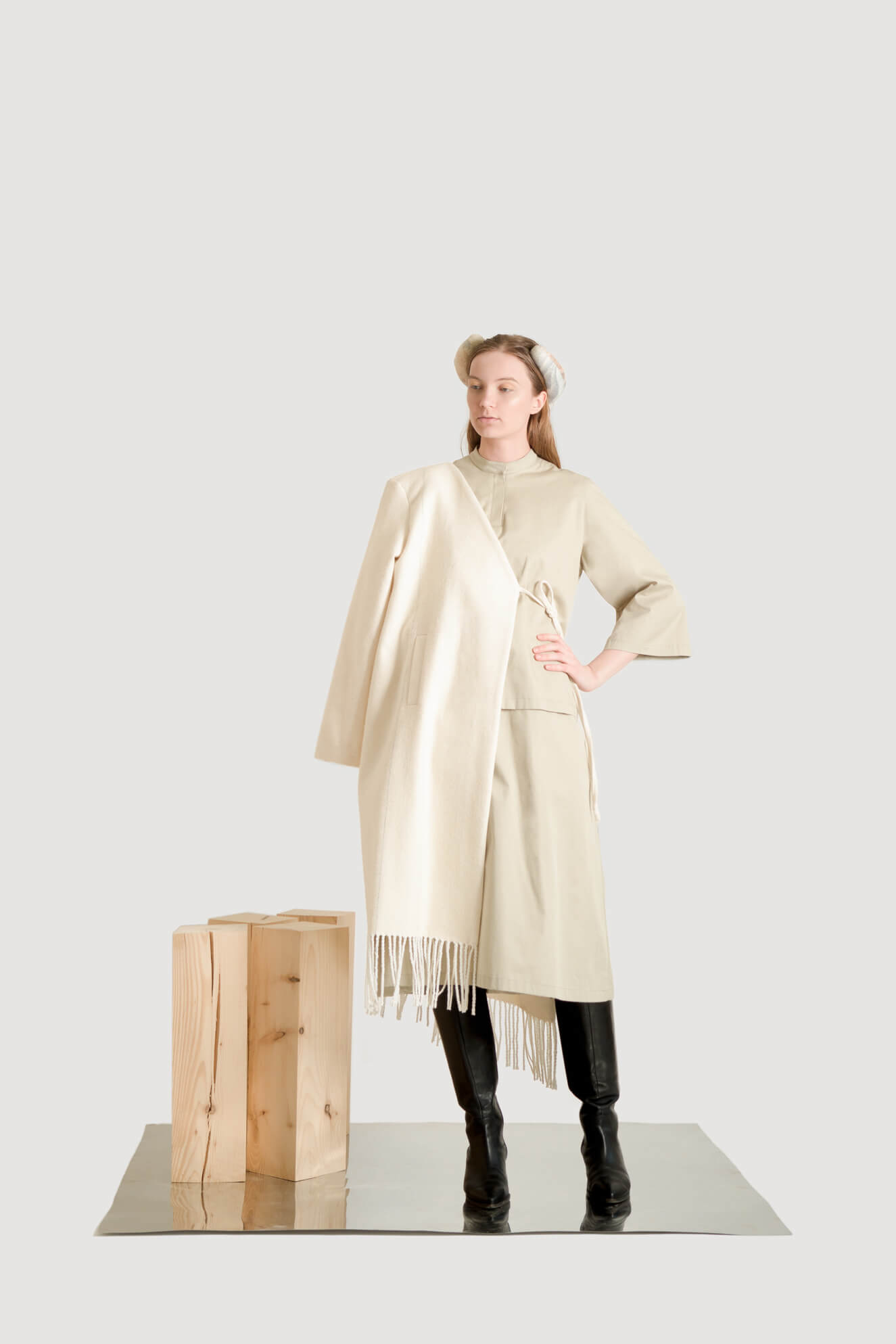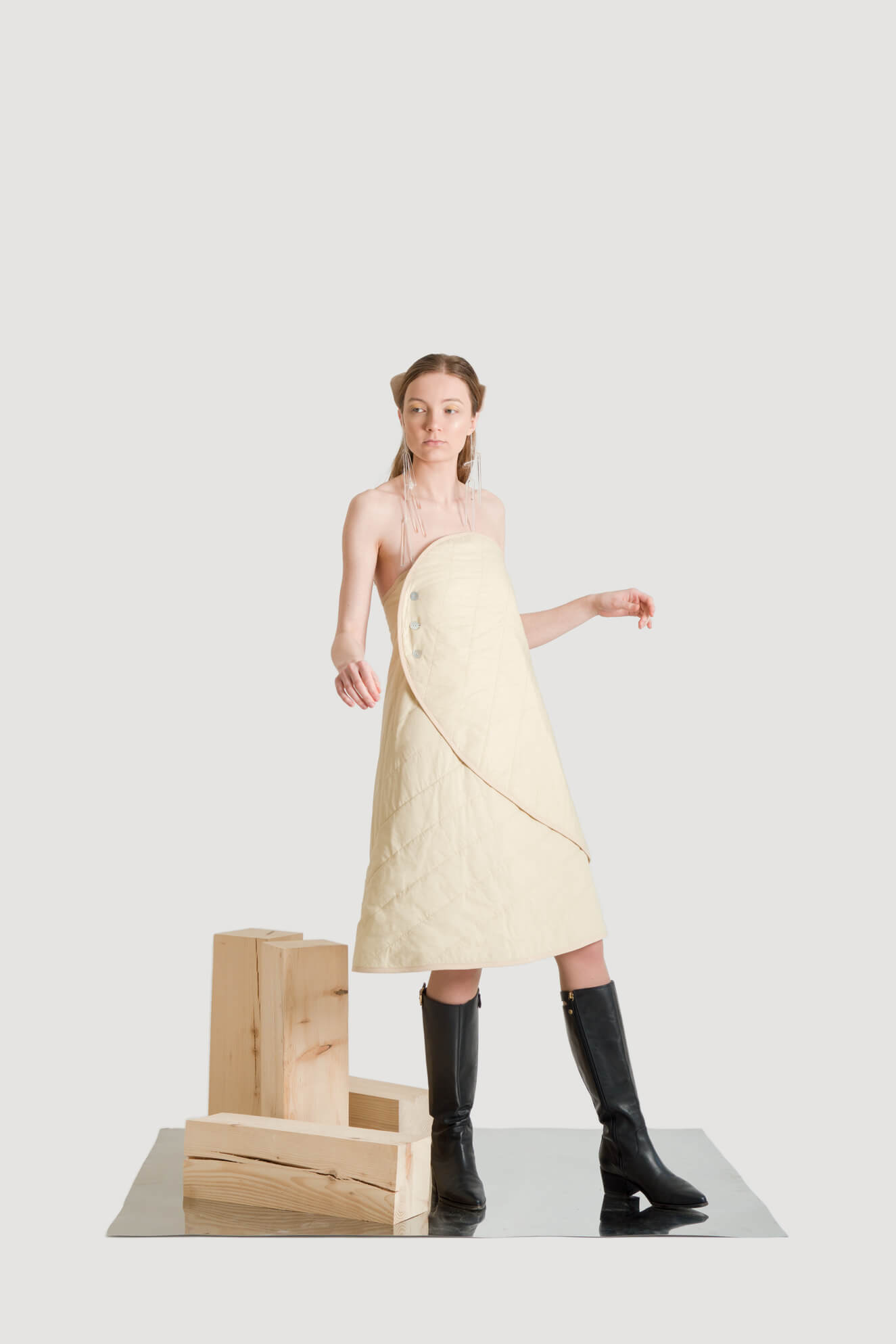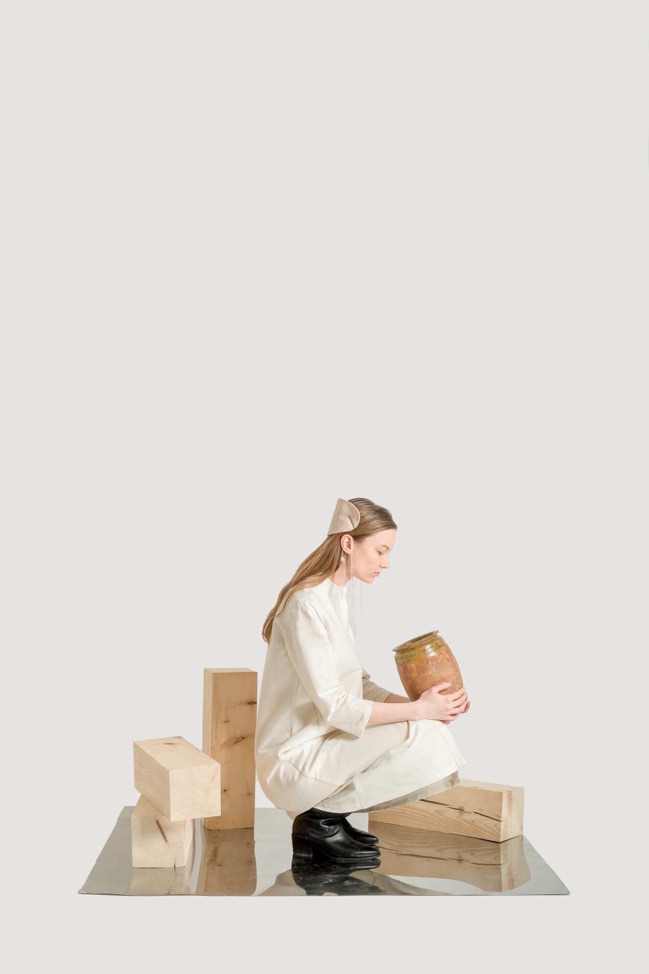 Glass beads embroidery, inspired by the works of Constantin Brancusi. The warm wood texture of the side table. Shirt Dress from a linen tablecloth – a sense of homeliness.