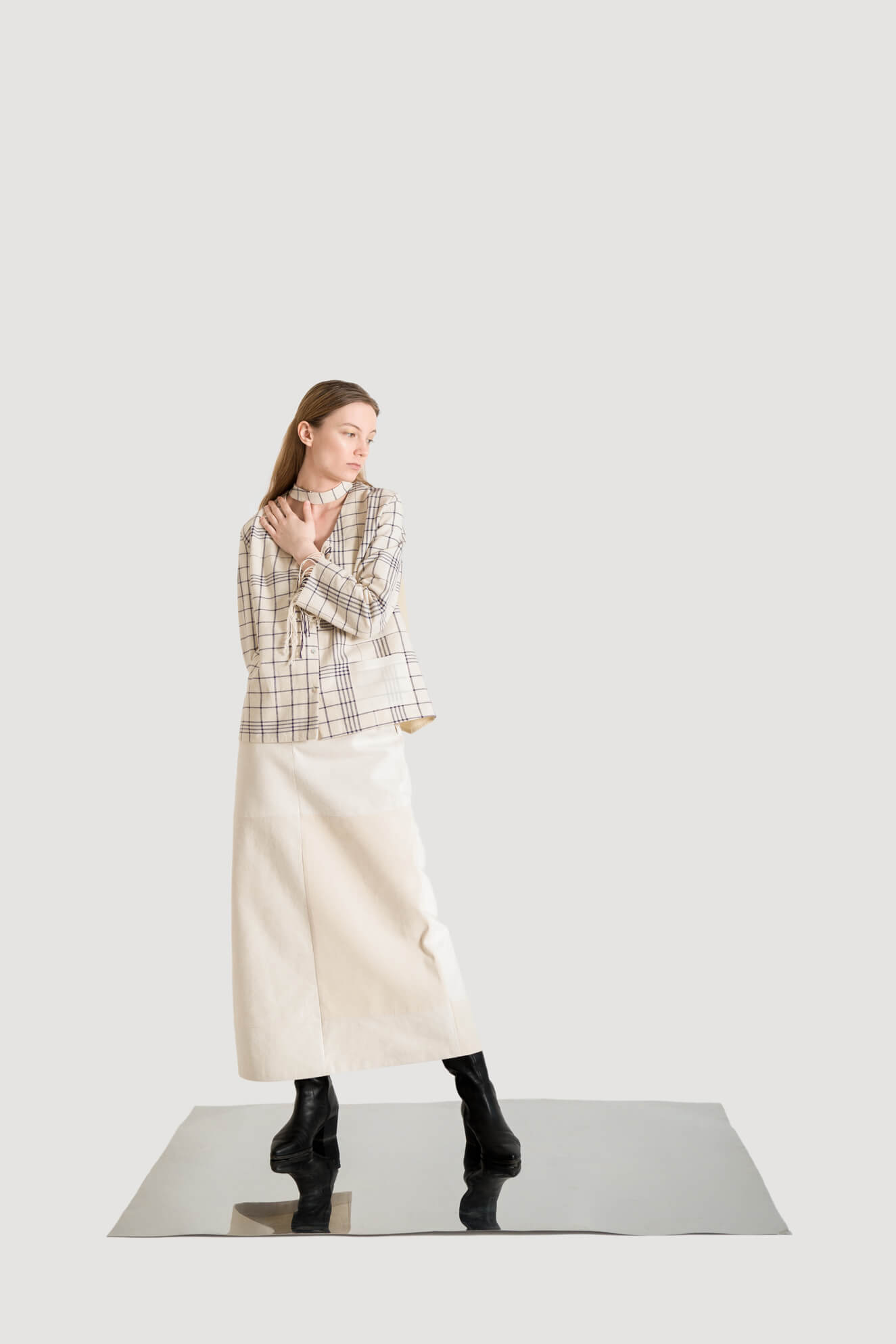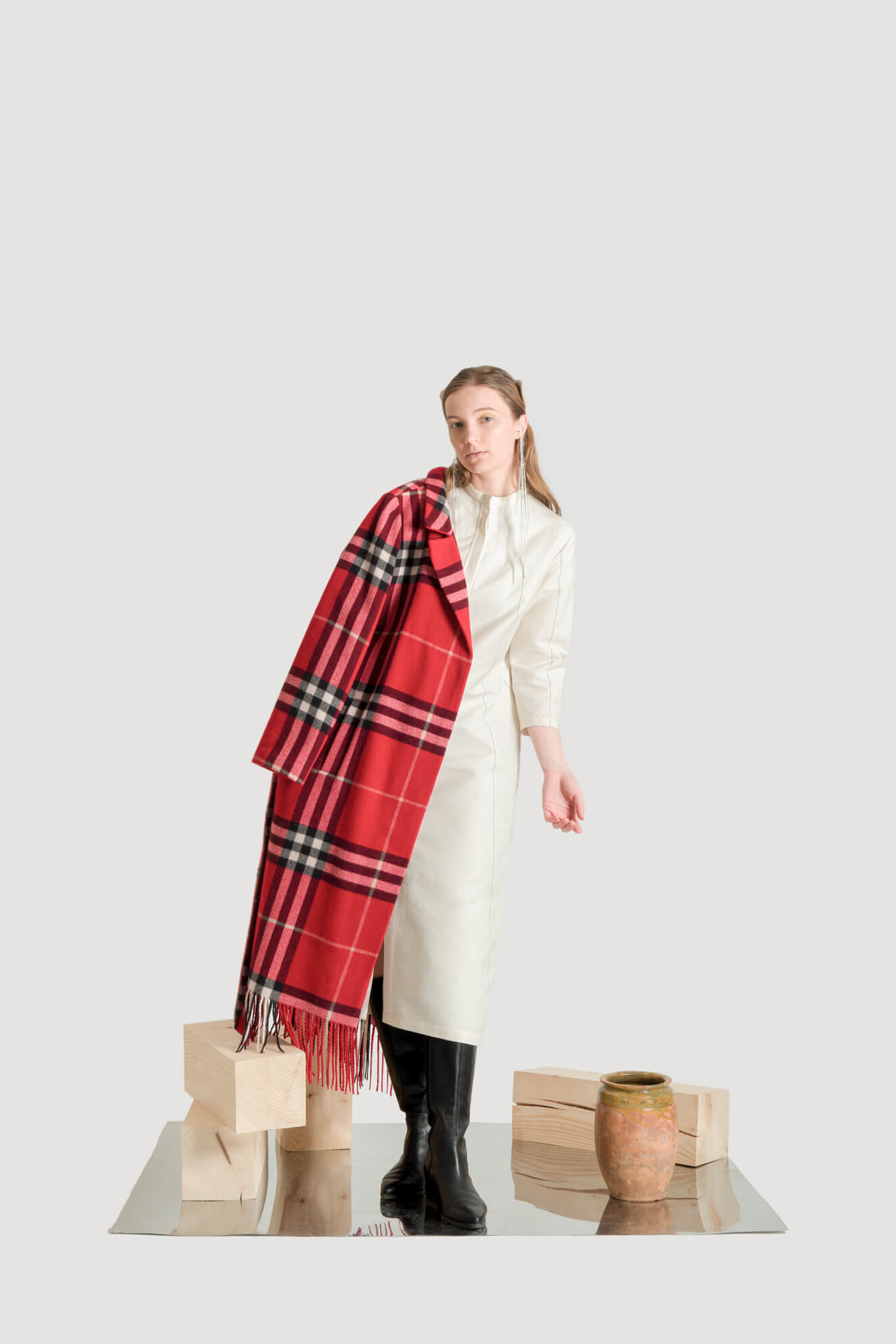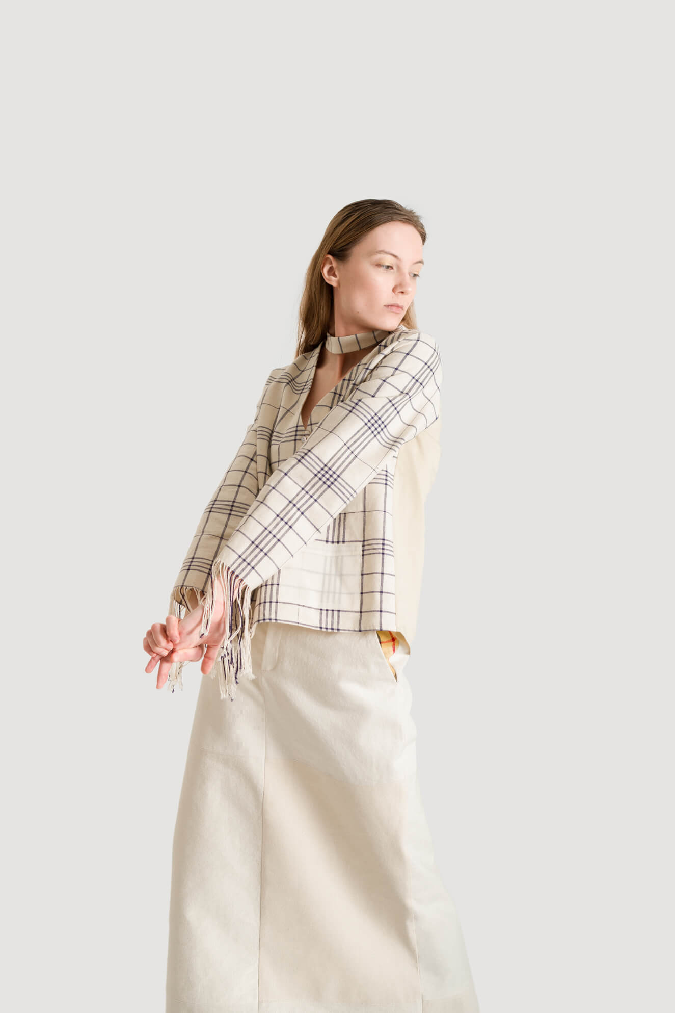 The cosy checkered wool and theatricality characters. A trip out of town during the holidays. Ringing and reflective glare glass earrings. Knitted fringe as on a homey blanket.