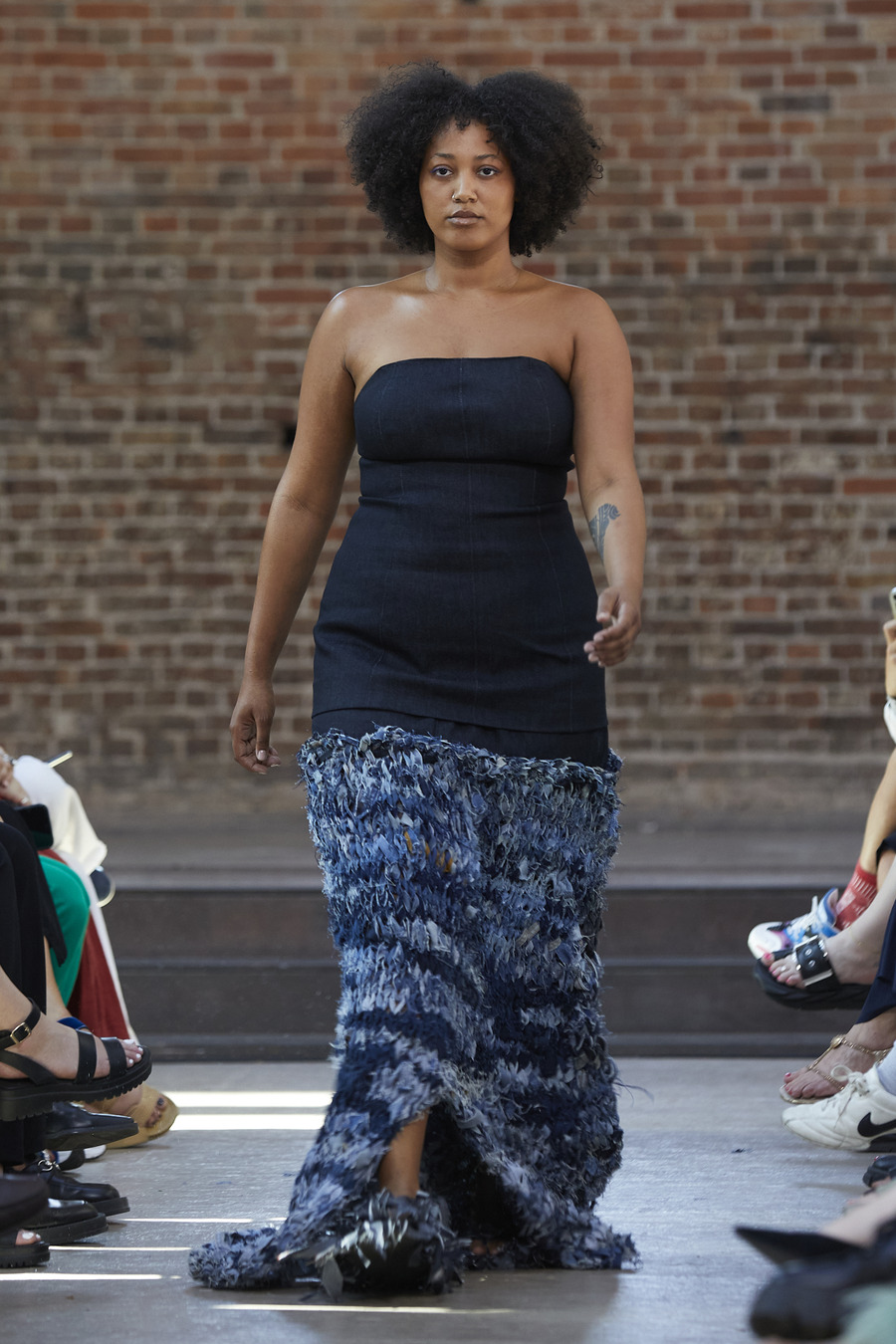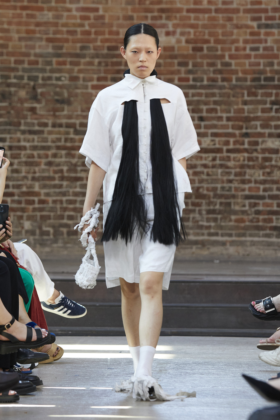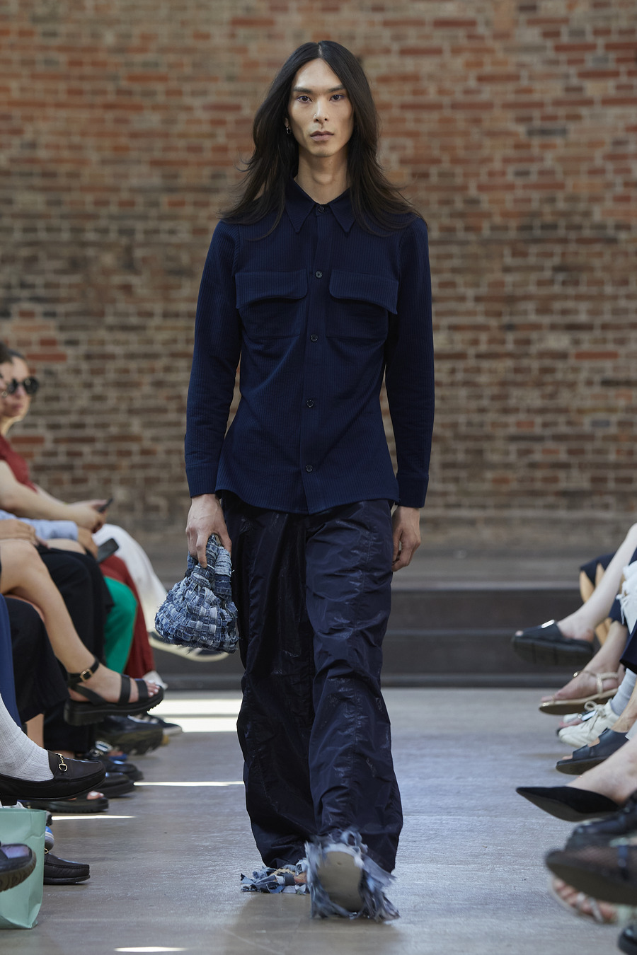 The collection breathes new life into classic tailoring, skillfully challenging patriarchal archetypes of masculinity. Organic forms disrupt rigid norms, casting historic silhouettes in a fresh light. Intricate denim sets and accessories mesmerize with hypnotic details, while jackets and outerwear embrace intertwined and knotted elements. Denim, a material steeped in feminist symbolism since its revolutionary adoption by women’s rights activists, takes center stage, amplifying the collection’s feminist undertones. Recycled suit fabrics, shirting, and knitwear evoke a dissonant echo, united by the show’s leitmotif: hair. Symbolically, “body hair” plays a vital role in each garment, emphasizing the autonomy, agency, and uniqueness of every individual who views or wears them.