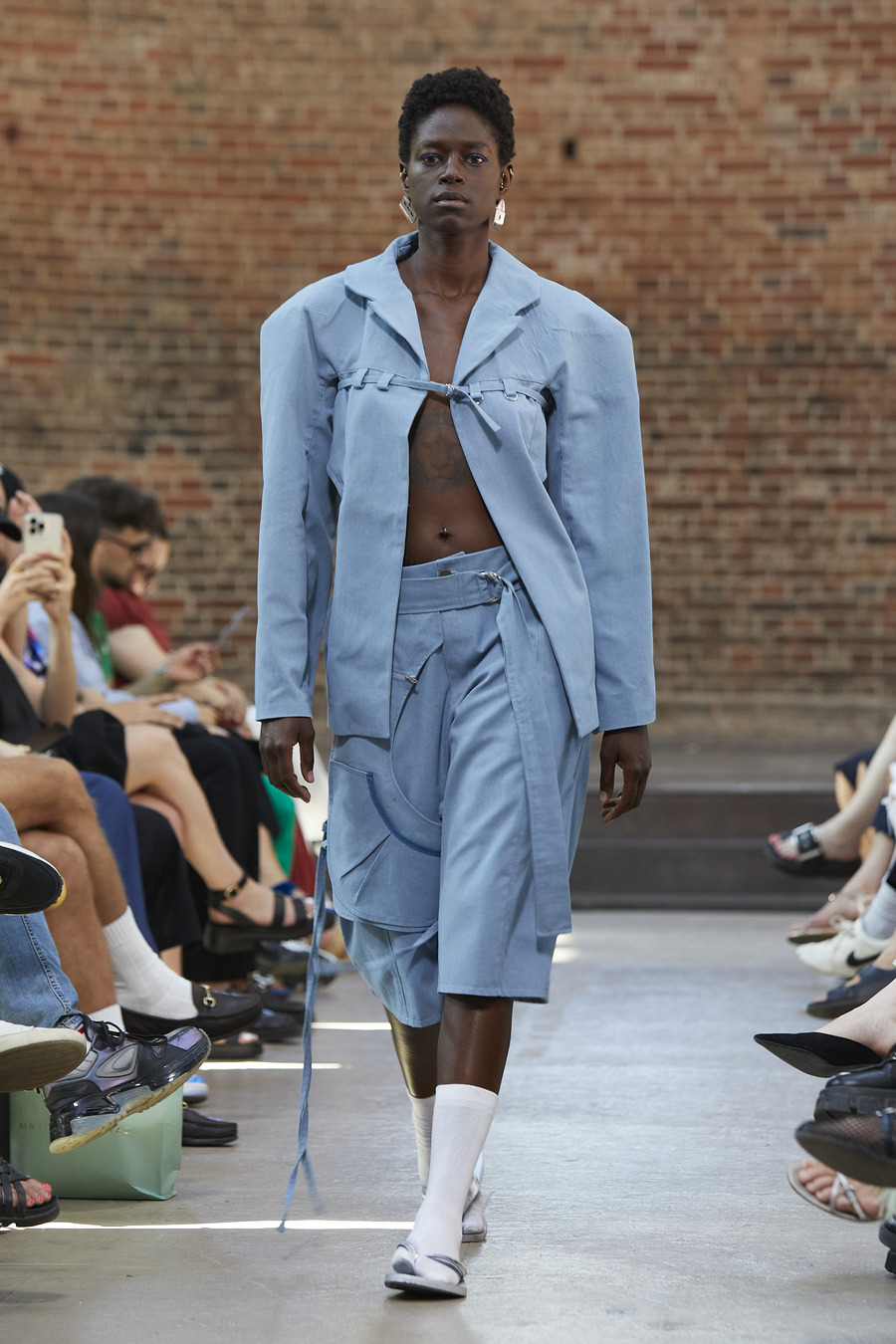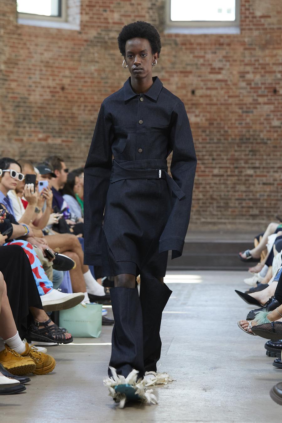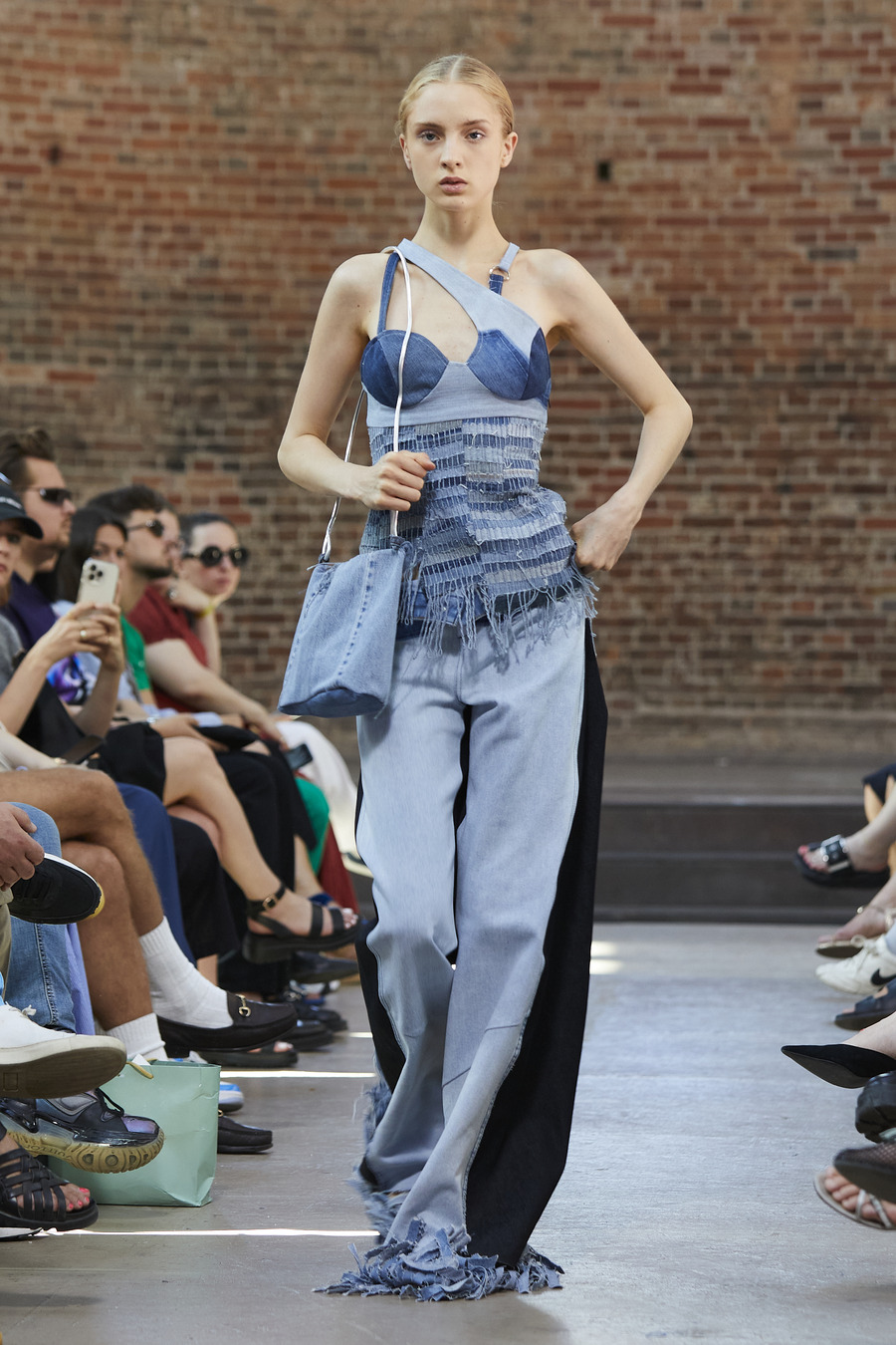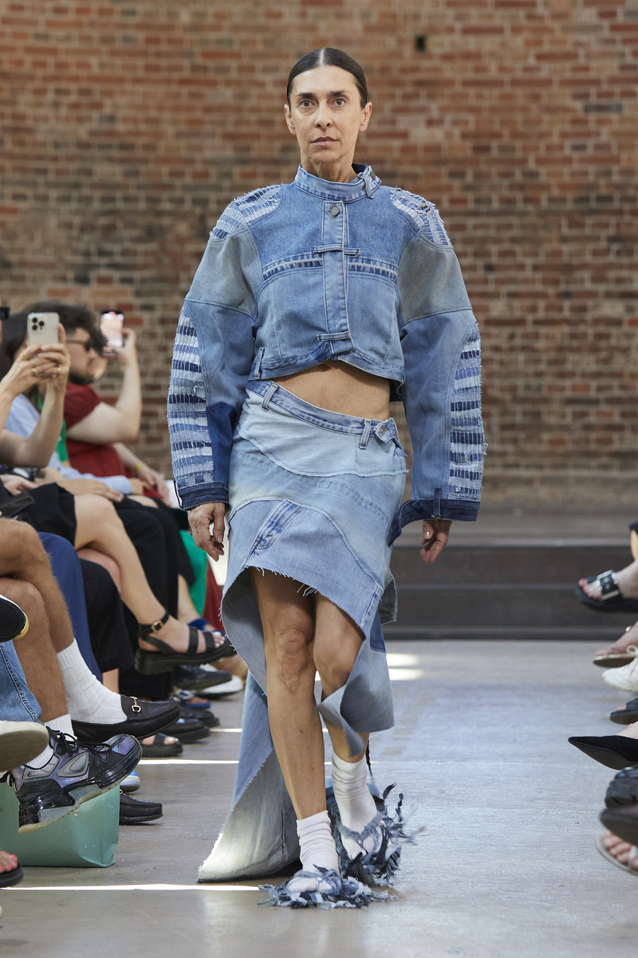 The collection breathes new life into classic tailoring, skillfully challenging patriarchal archetypes of masculinity. Organic forms disrupt rigid norms, casting historic silhouettes in a fresh light. Intricate denim sets and accessories mesmerize with hypnotic details, while jackets and outerwear embrace intertwined and knotted elements. Denim, a material steeped in feminist symbolism since its revolutionary adoption by women’s rights activists, takes center stage, amplifying the collection’s feminist undertones. Recycled suit fabrics, shirting, and knitwear evoke a dissonant echo, united by the show’s leitmotif: hair. Symbolically, “body hair” plays a vital role in each garment, emphasizing the autonomy, agency, and uniqueness of every individual who views or wears them.