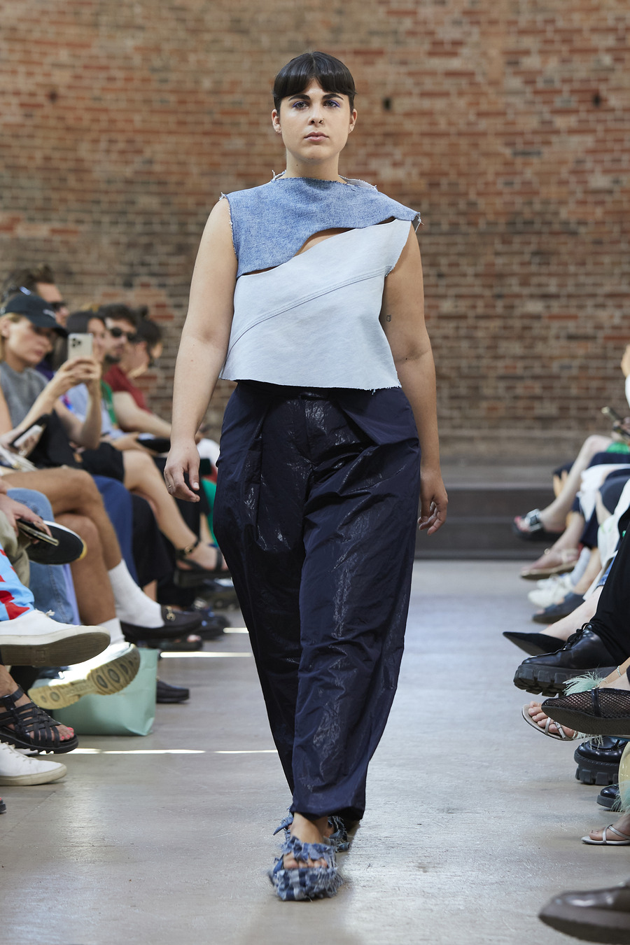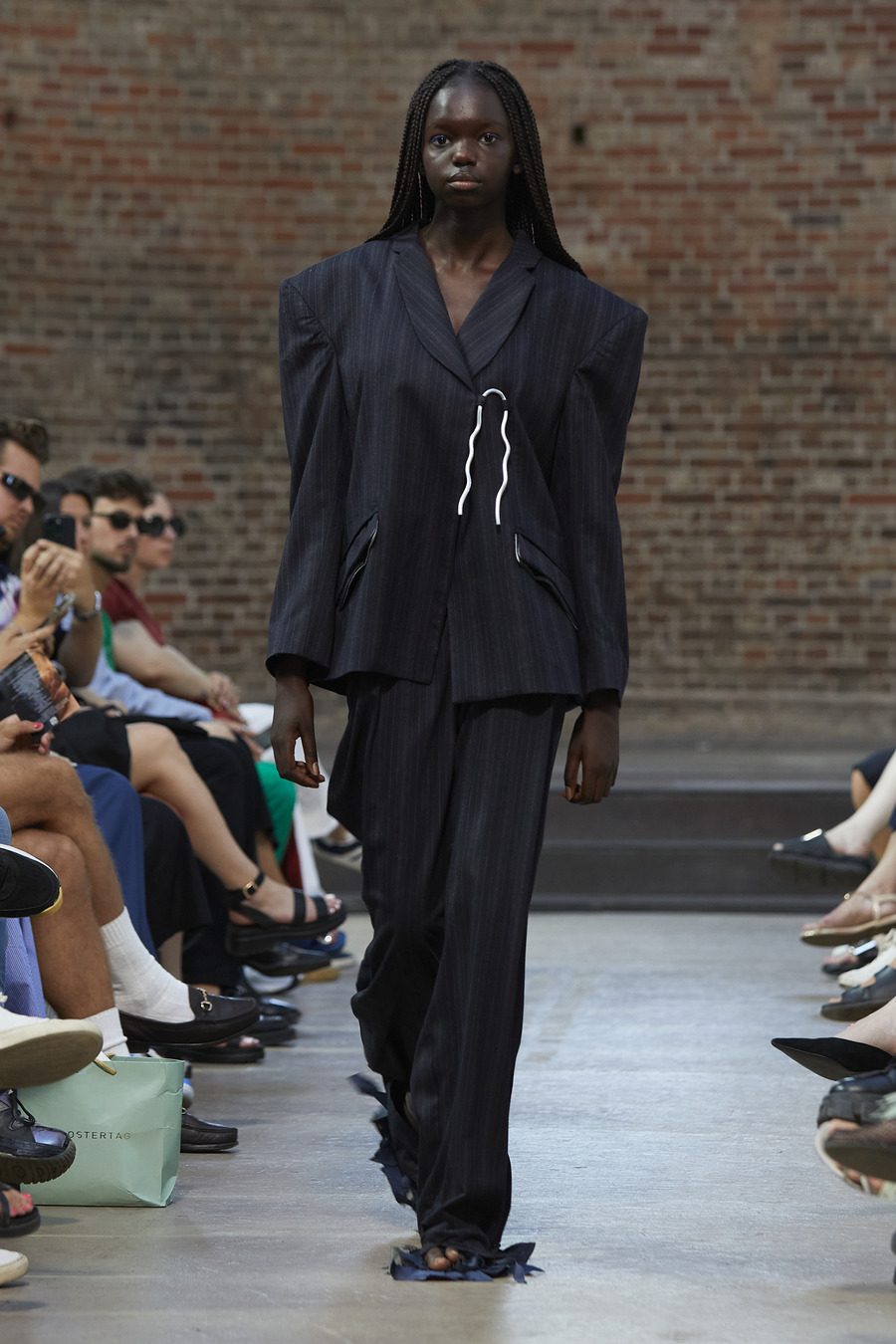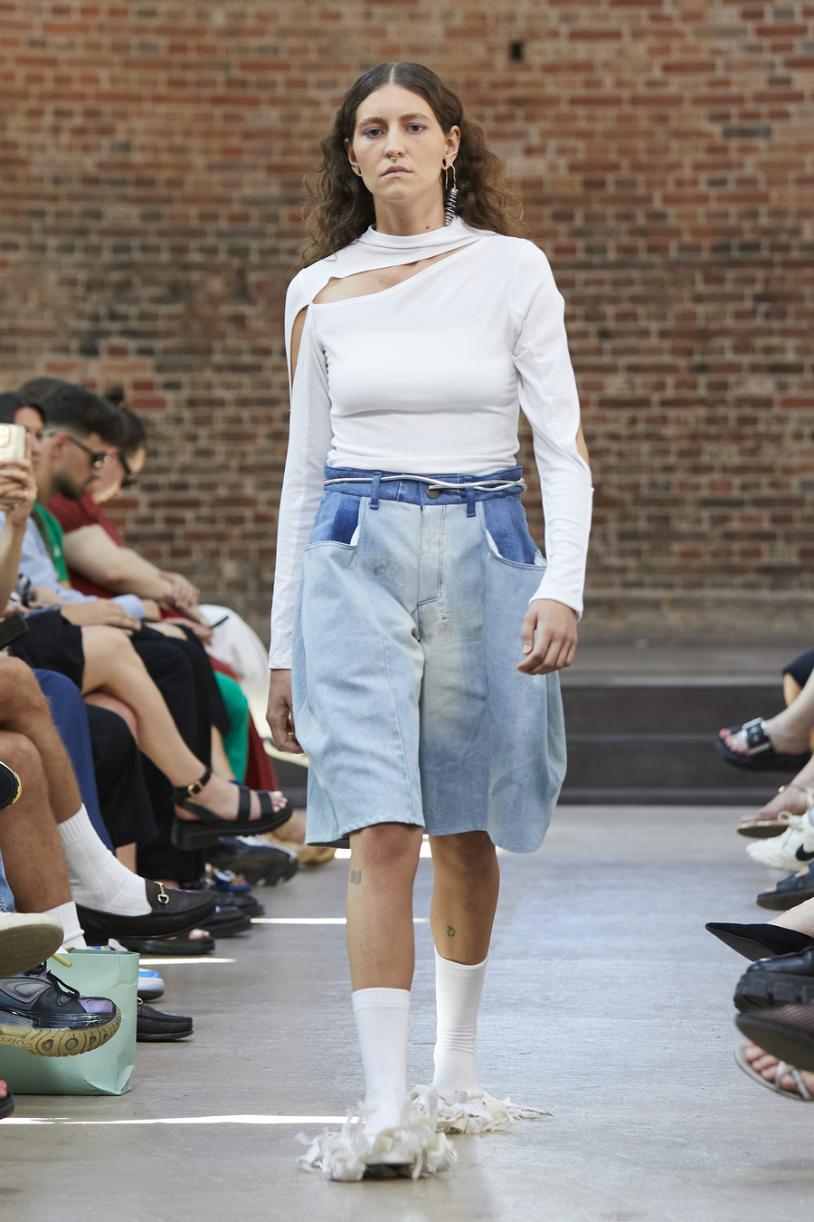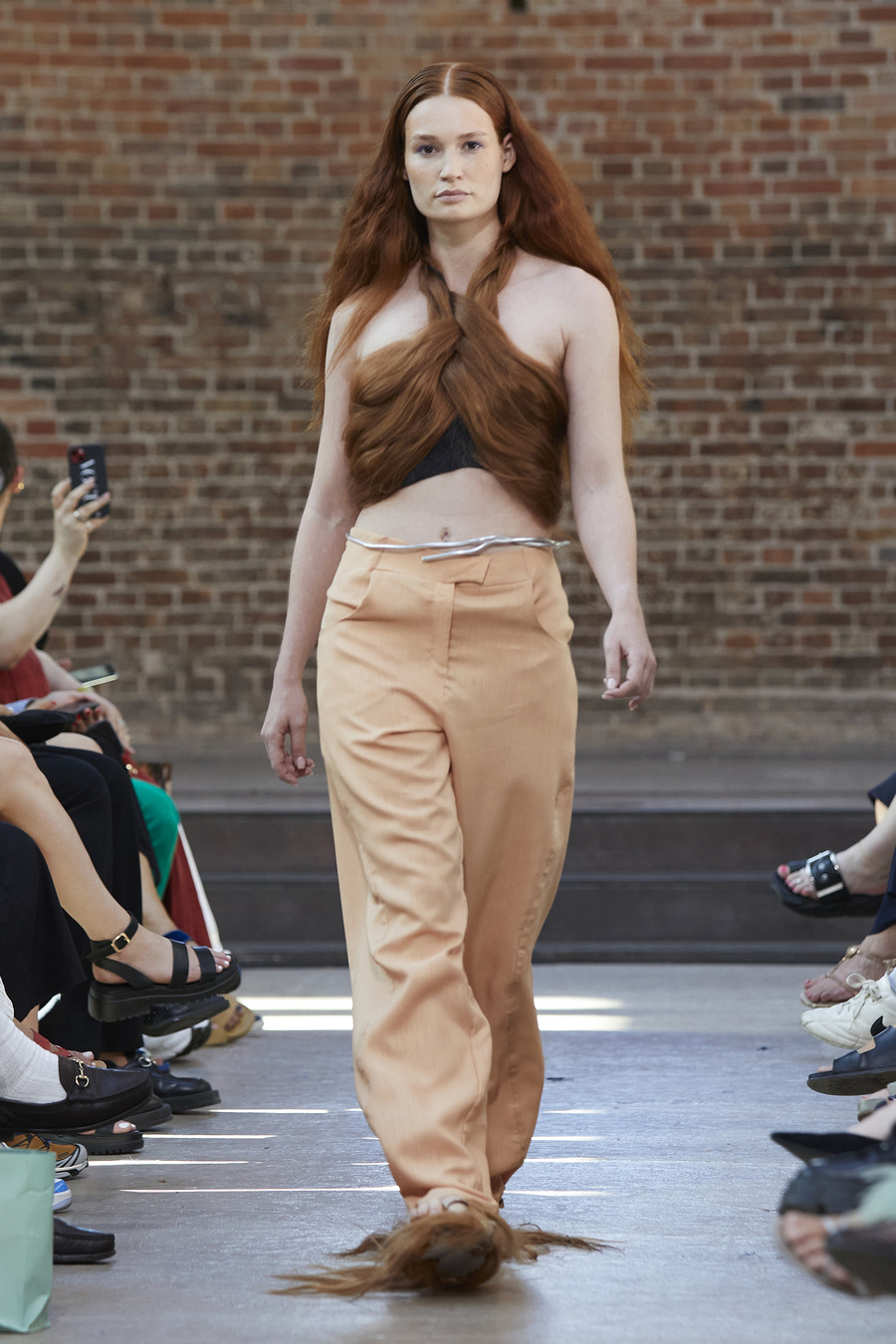 The collection breathes new life into classic tailoring, skillfully challenging patriarchal archetypes of masculinity. Organic forms disrupt rigid norms, casting historic silhouettes in a fresh light. Intricate denim sets and accessories mesmerize with hypnotic details, while jackets and outerwear embrace intertwined and knotted elements. Denim, a material steeped in feminist symbolism since its revolutionary adoption by women’s rights activists, takes center stage, amplifying the collection’s feminist undertones. Recycled suit fabrics, shirting, and knitwear evoke a dissonant echo, united by the show’s leitmotif: hair. Symbolically, “body hair” plays a vital role in each garment, emphasizing the autonomy, agency, and uniqueness of every individual who views or wears them.