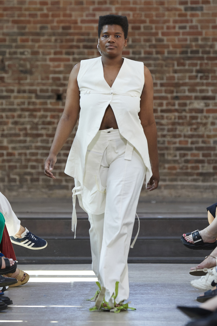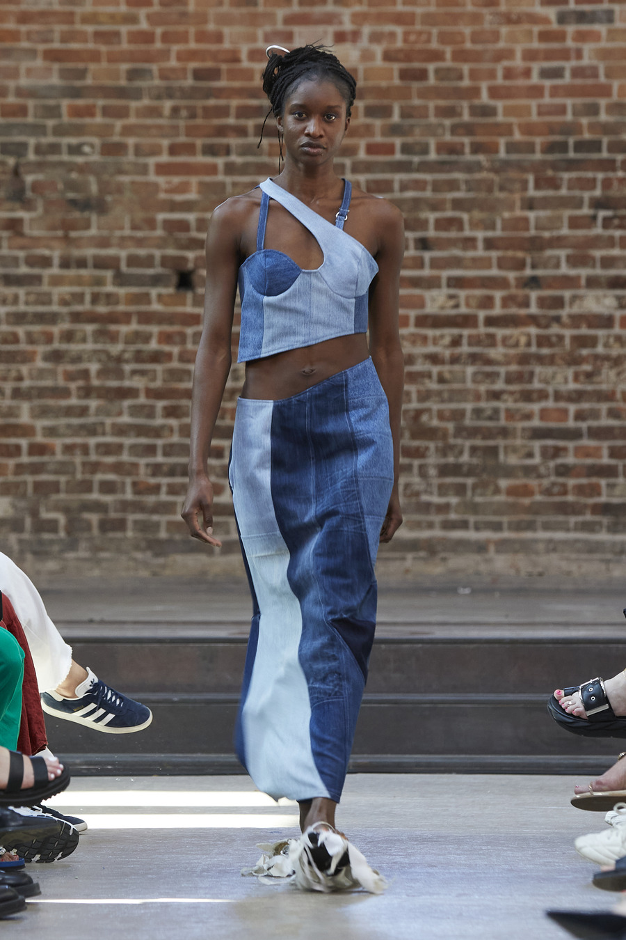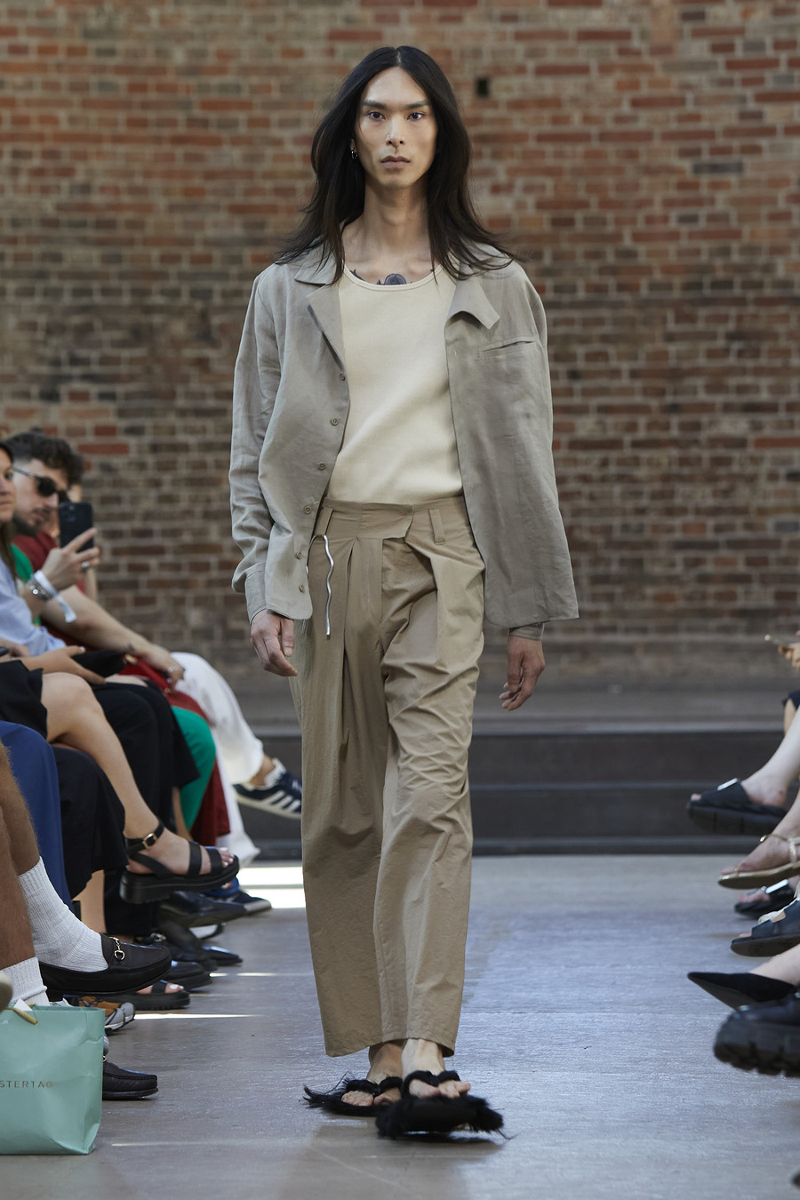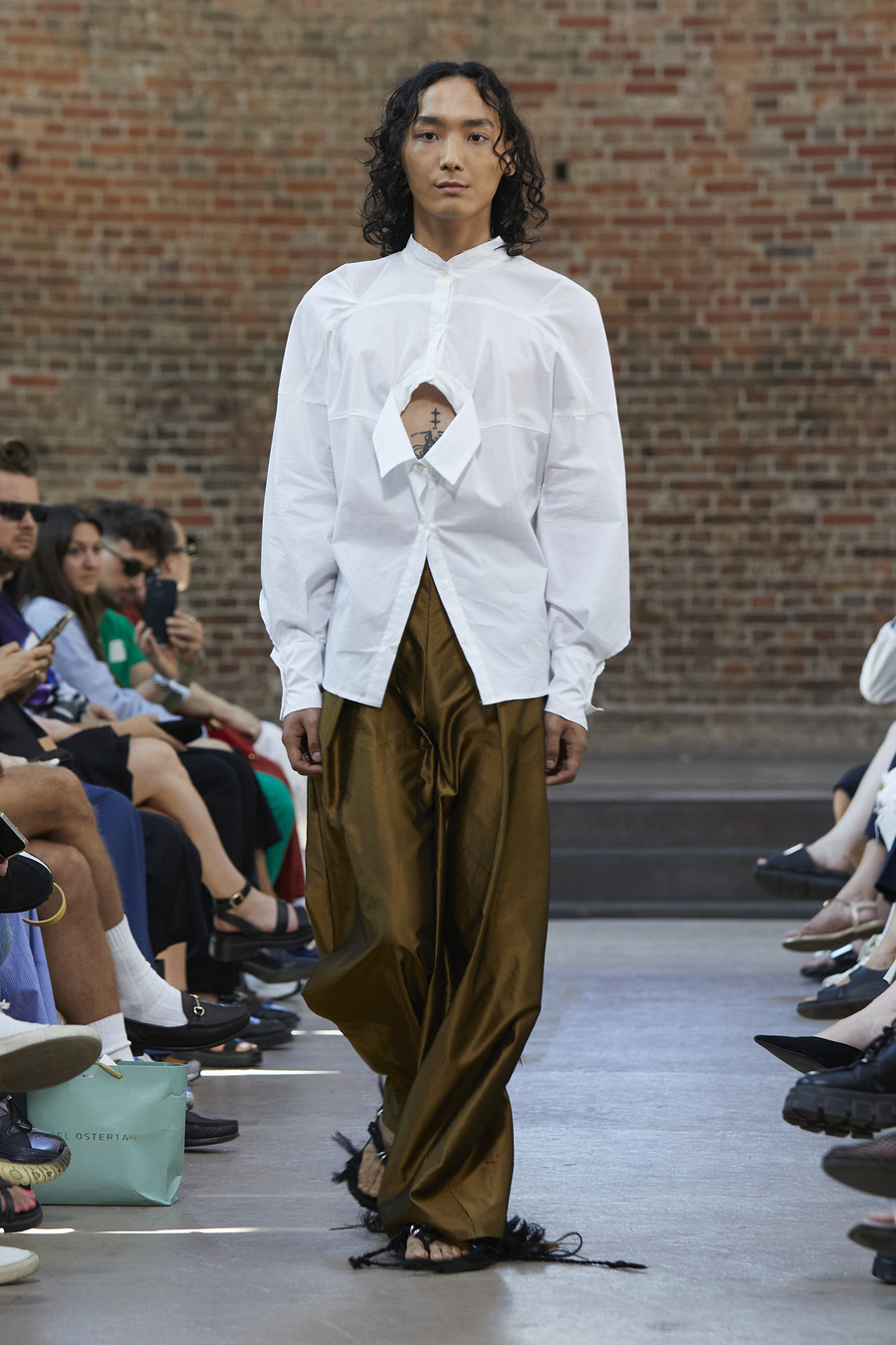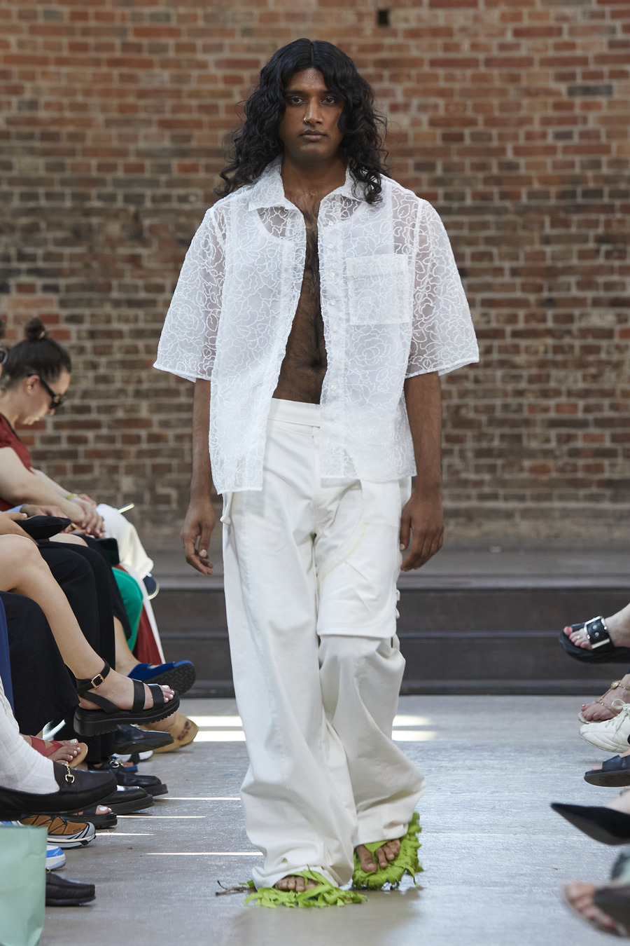The collection breathes new life into classic tailoring, skillfully challenging patriarchal archetypes of masculinity. Organic forms disrupt rigid norms, casting historic silhouettes in a fresh light. Intricate denim sets and accessories mesmerize with hypnotic details, while jackets and outerwear embrace intertwined and knotted elements. Denim, a material steeped in feminist symbolism since its revolutionary adoption by women’s rights activists, takes center stage, amplifying the collection’s feminist undertones. Recycled suit fabrics, shirting, and knitwear evoke a dissonant echo, united by the show’s leitmotif: hair. Symbolically, “body hair” plays a vital role in each garment, emphasizing the autonomy, agency, and uniqueness of every individual who views or wears them.