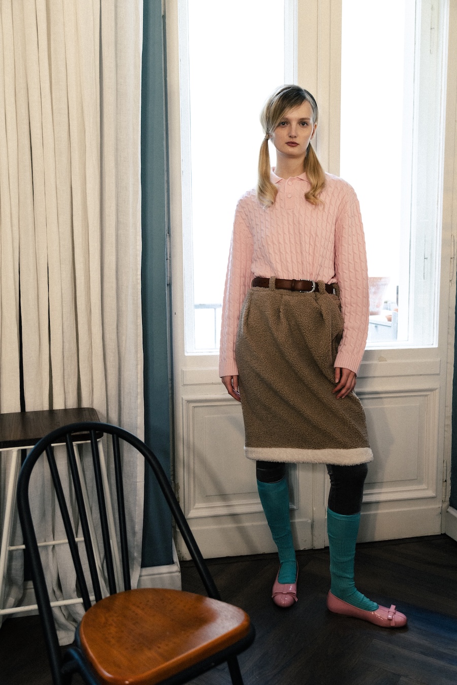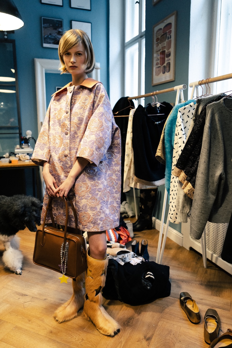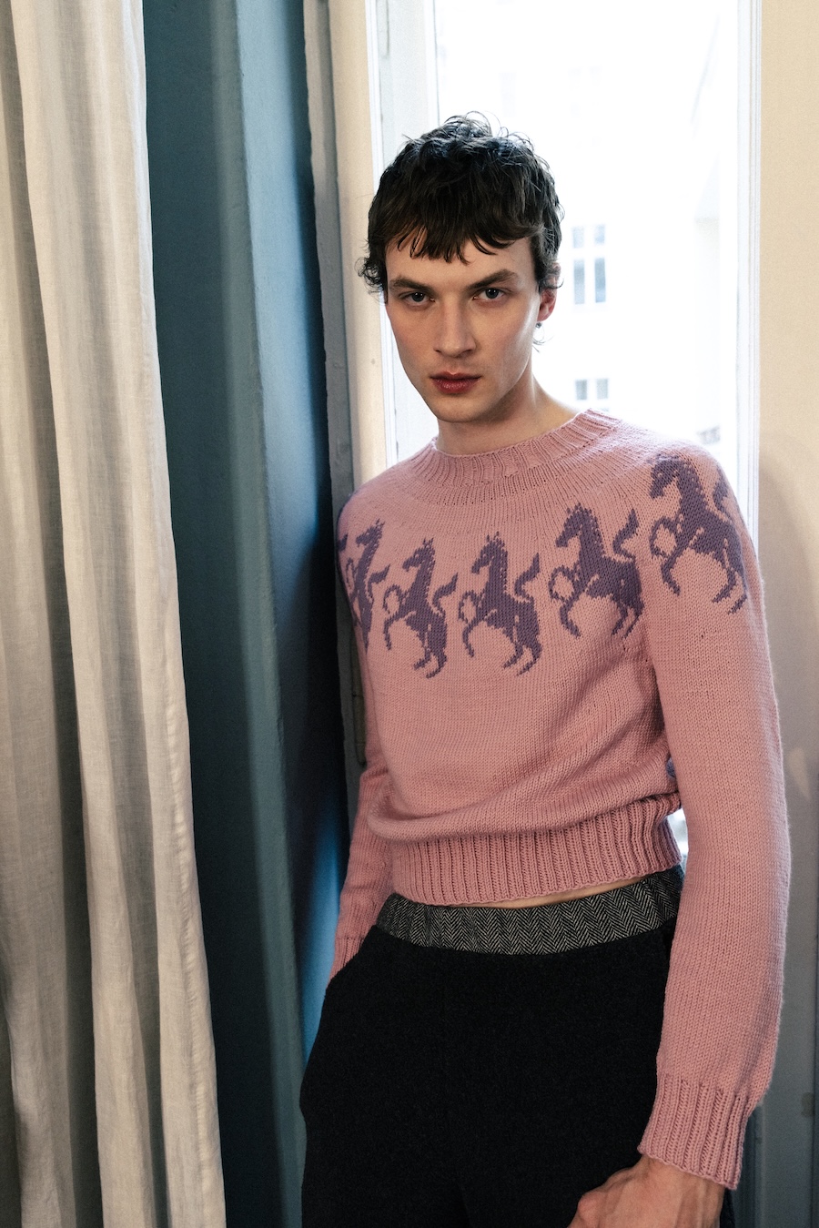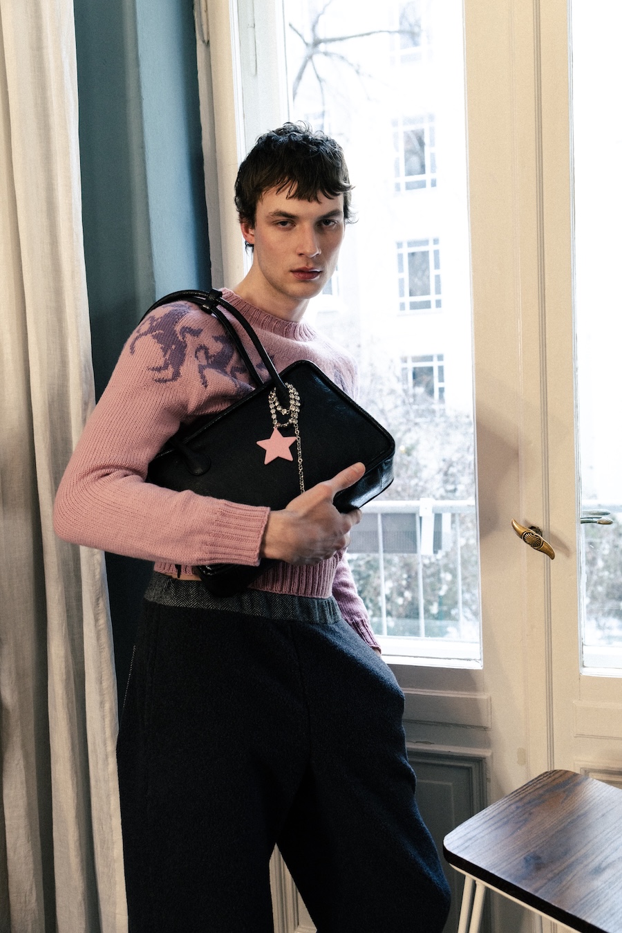 The pieces boldly incorporate household elements, allowing carpets, blankets, and curtains with ornamental patterns to migrate from living rooms into wardrobes. Comfort takes centre stage, with French terry fabric evolving into elongated trousers and sherpa fleece redefining everyday silhouettes. The collection prioritises fabrics typically reserved for moments of rest and softness, making them visible and totally wearable.