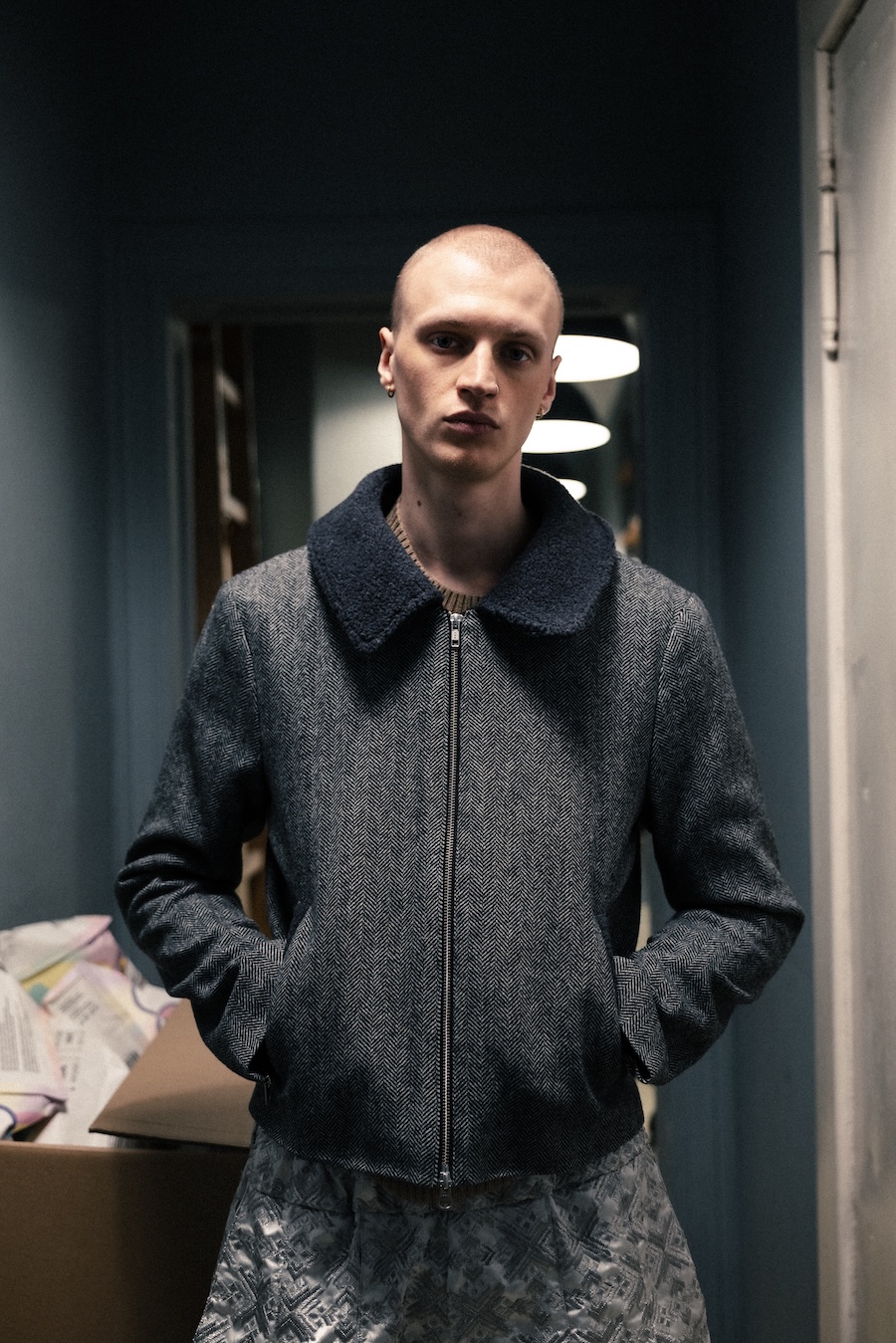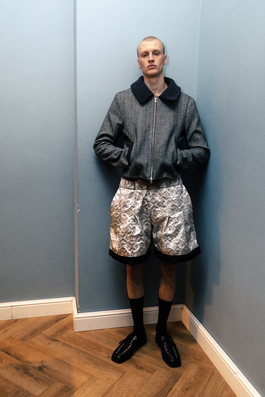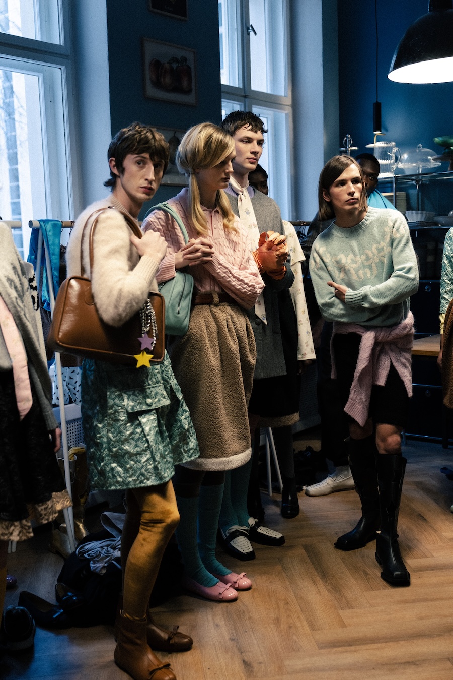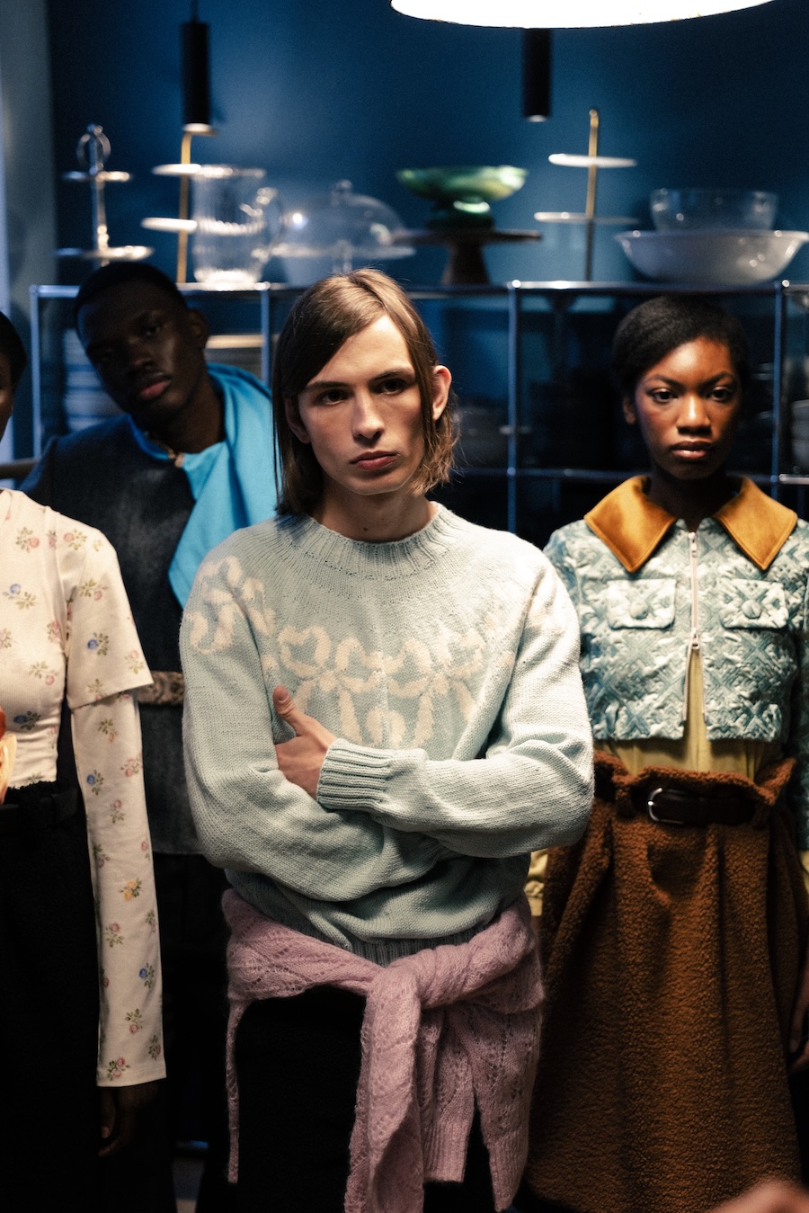 Themes of velour meeting brocade evoke ornamental stucco, with hoodie hoods cascading like drapery. The collection communicates that interior logic can become silhouette, embodying gestures that are serious yet playful. They resonate with Walter Benjamin’s conception of interiors as spaces where traces of self and identity accumulate.