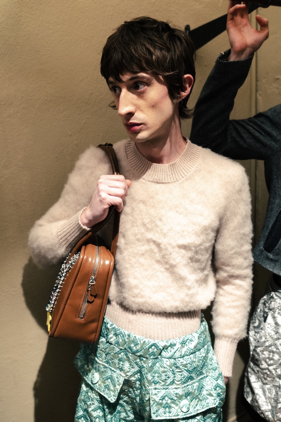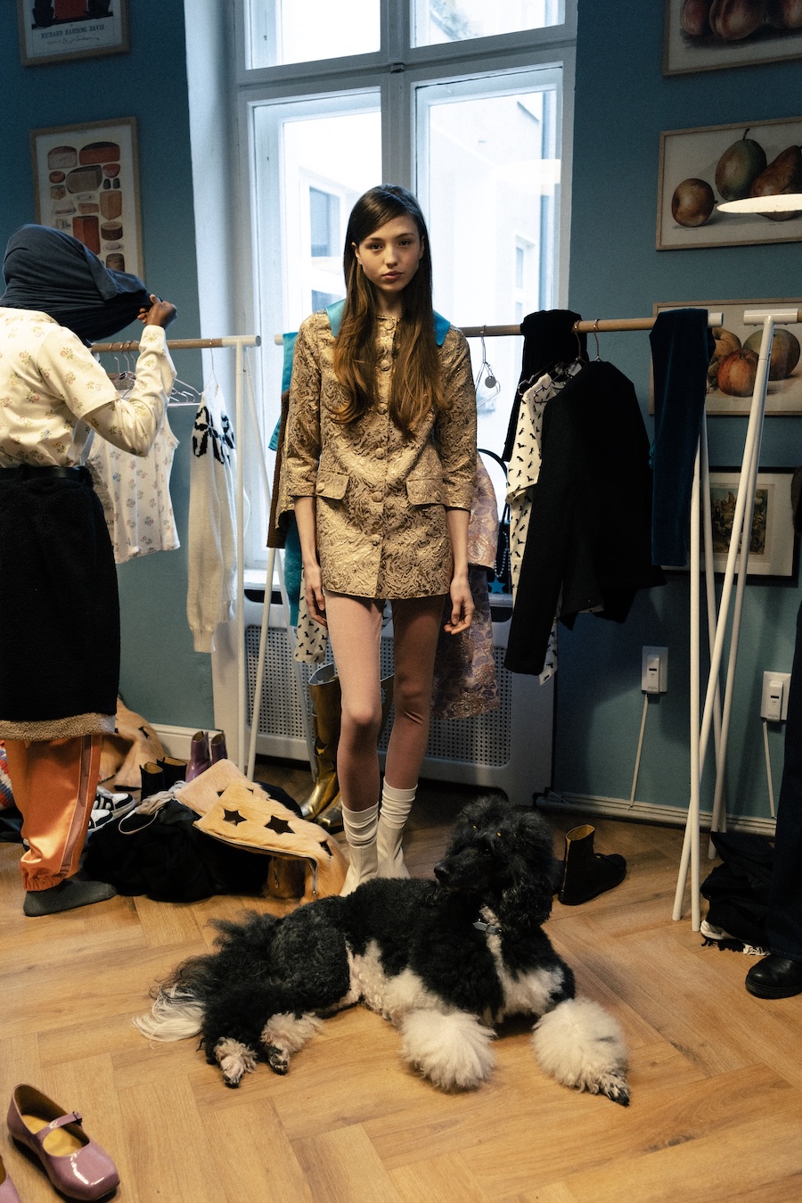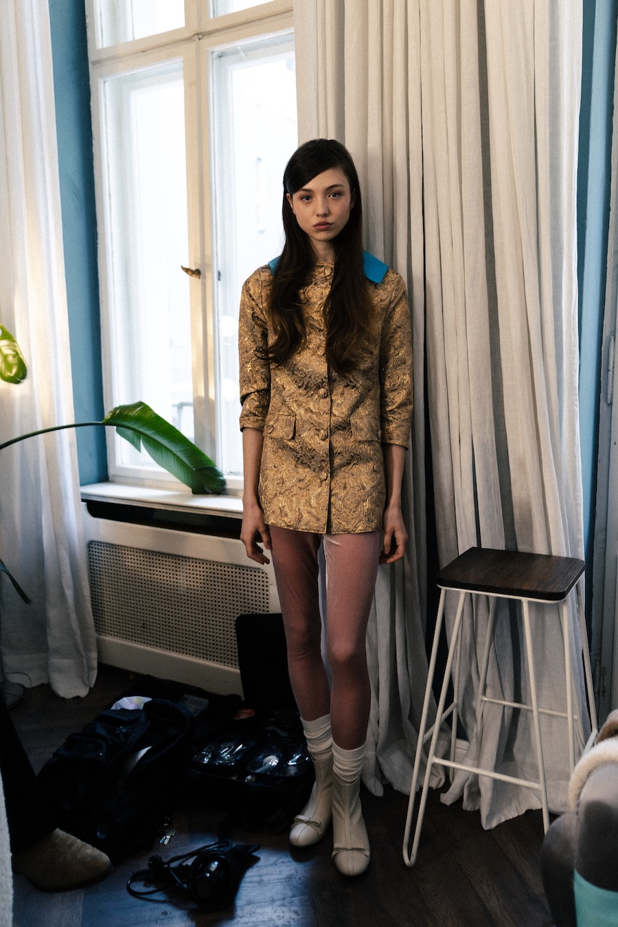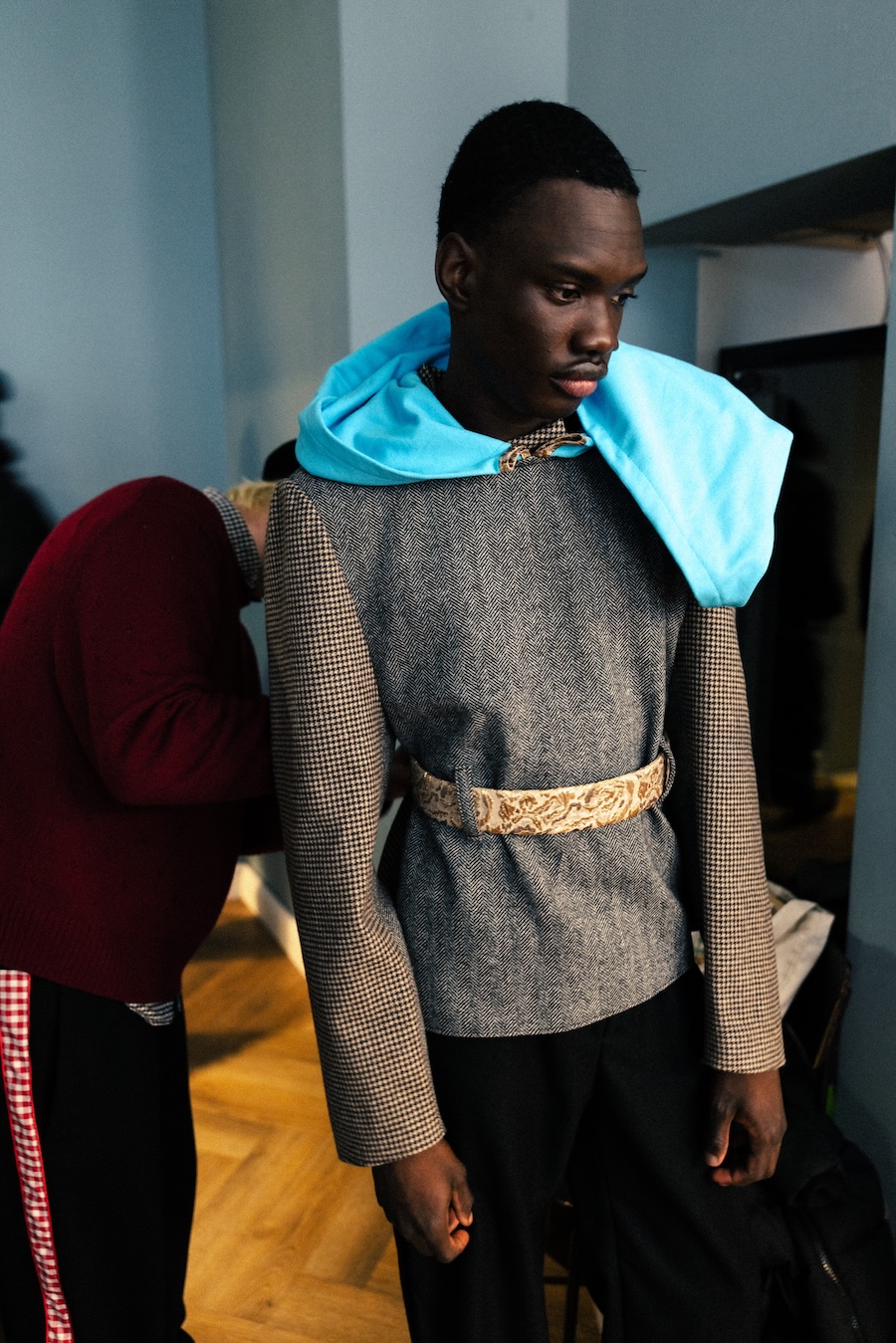 Themes of velour meeting brocade evoke ornamental stucco, with hoodie hoods cascading like drapery. The collection communicates that interior logic can become silhouette, embodying gestures that are serious yet playful. They resonate with Walter Benjamin’s conception of interiors as spaces where traces of self and identity accumulate.