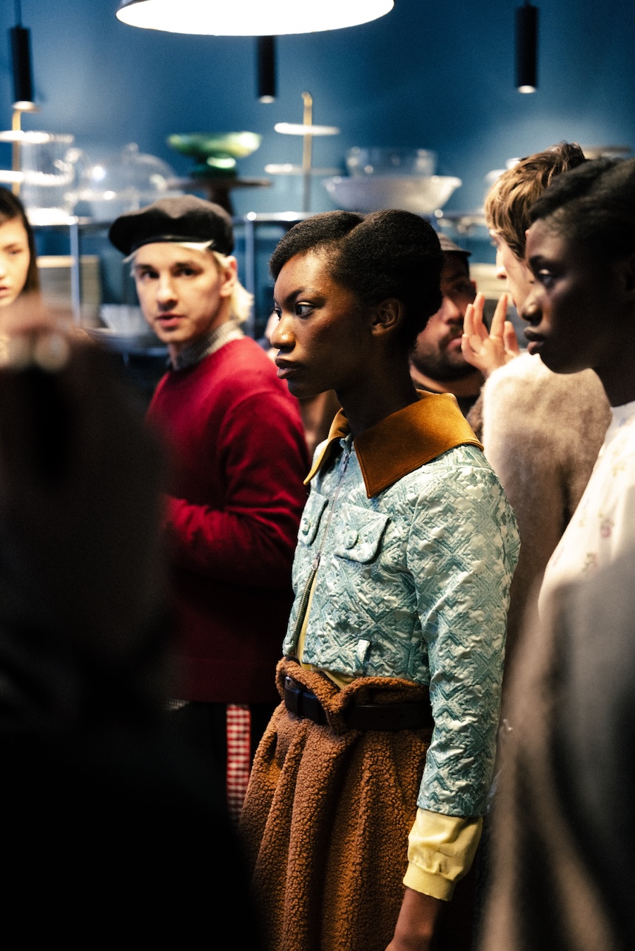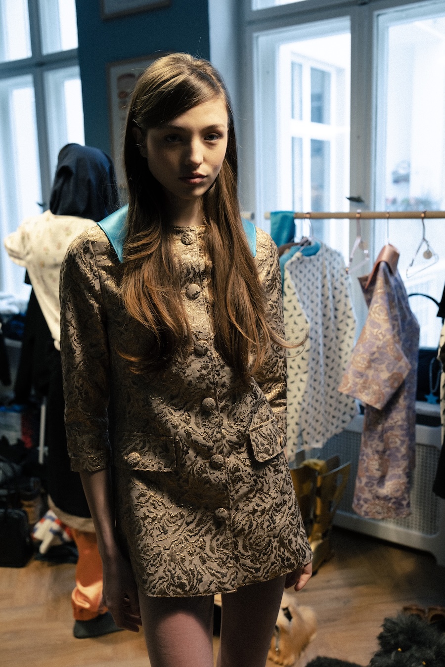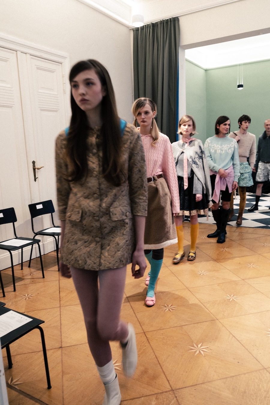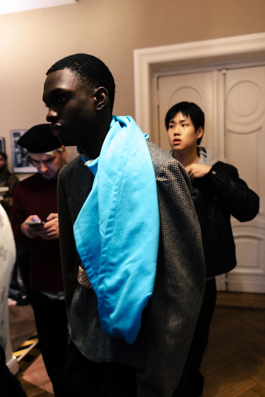 Themes of velour meeting brocade evoke ornamental stucco, with hoodie hoods cascading like drapery. The collection communicates that interior logic can become silhouette, embodying gestures that are serious yet playful. They resonate with Walter Benjamin’s conception of interiors as spaces where traces of self and identity accumulate.