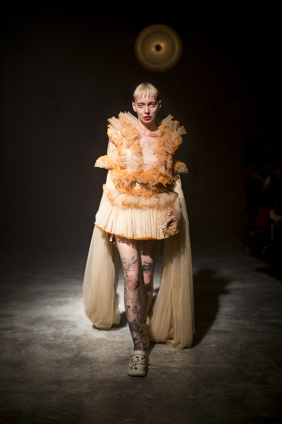 We strive to become the perfect version of ourselves, but the image slowly crumbles, becoming deformed and dystopian. Through the soft beige colours and BONDYS trademark tulle dresses, the collection starts off as unsullied and unexpectedly beautiful. This association quickly dissolves itself through heavy and dark fabrics and bizarre details expressed through unconventional materials, quickly turning the collection-‘s light and pretty starting point into a dystopian scenario.