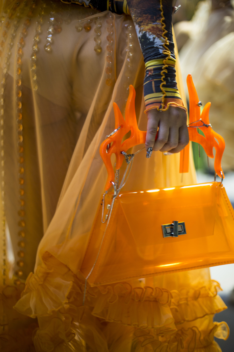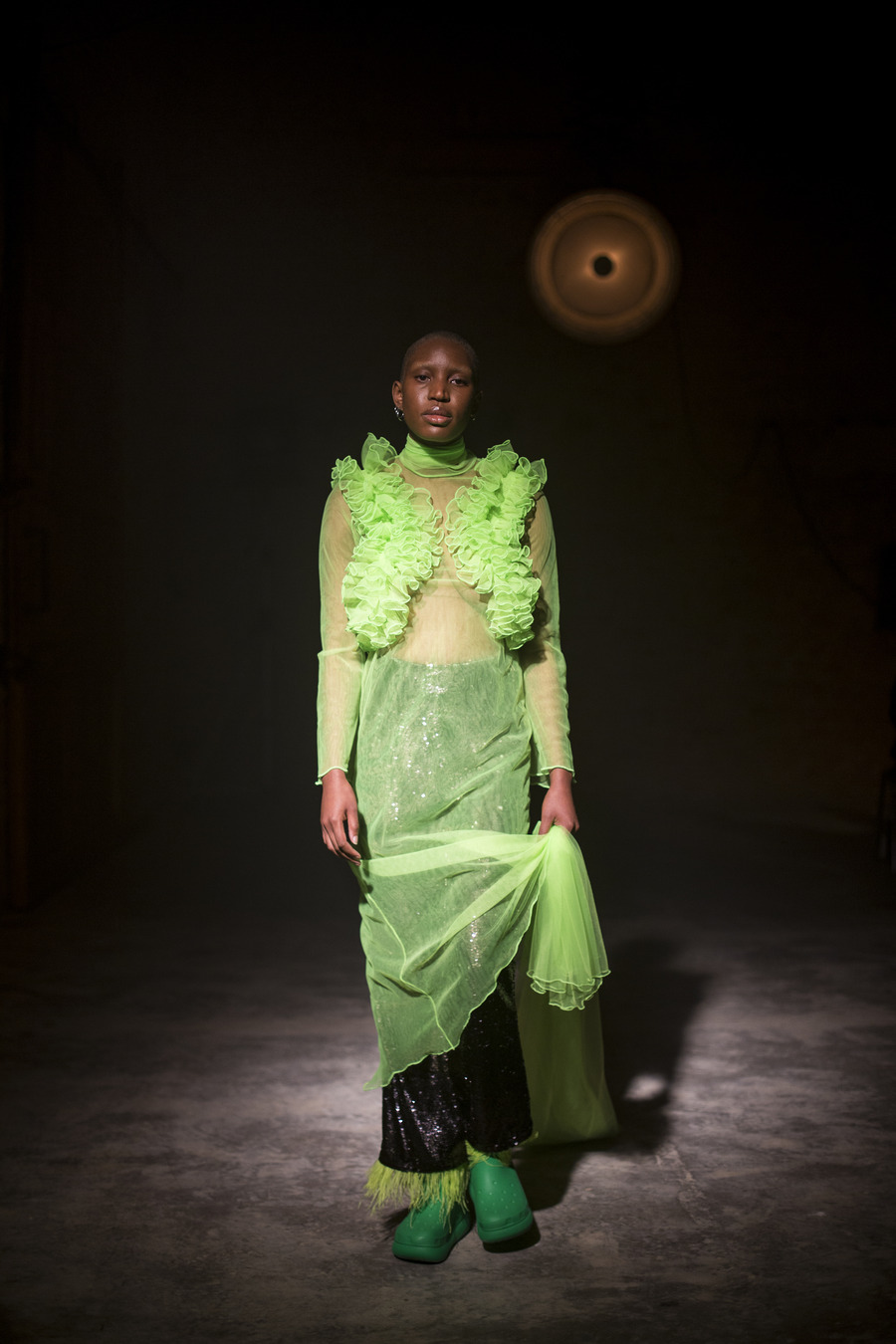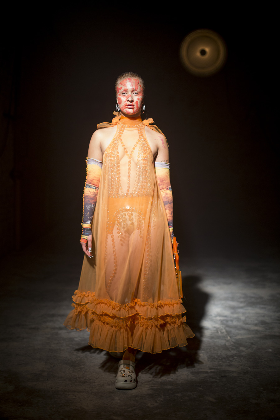We strive to become the perfect version of ourselves, but the image slowly crumbles, becoming deformed and dystopian. Through the soft beige colours and BONDYS trademark tulle dresses, the collection starts off as unsullied and unexpectedly beautiful. This association quickly dissolves itself through heavy and dark fabrics and bizarre details expressed through unconventional materials, quickly turning the collection-‘s light and pretty starting point into a dystopian scenario.