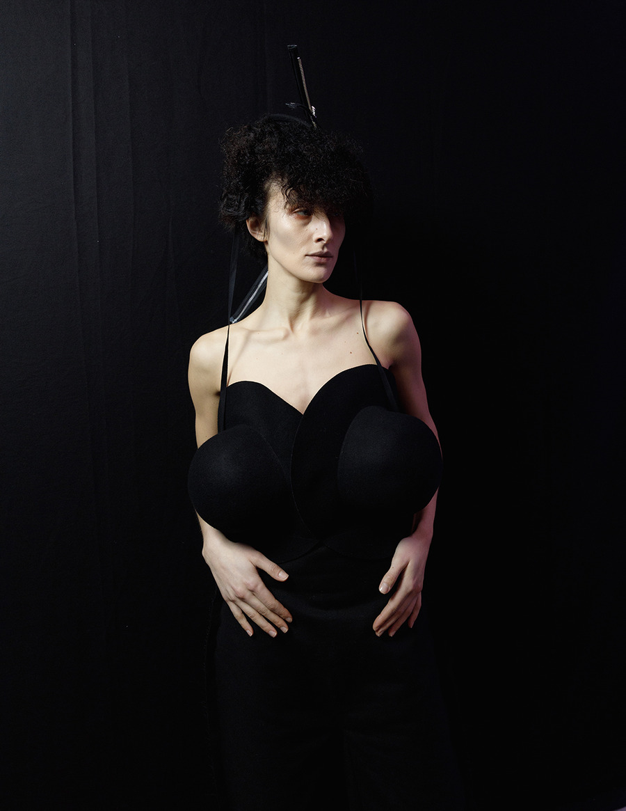 Her design DNA is unmistakable: multipurpose ensembles heavy with existential musings, born from an ‘OCD-driven’ brilliance that flirts with art’s edge. Dzhus revisits her hallmarks — modernist comics, gnostic undertones spliced with socio-gender critique, and objectified symbolism that embarks on a dance of fetish and aversion within the realm of her iconography.
