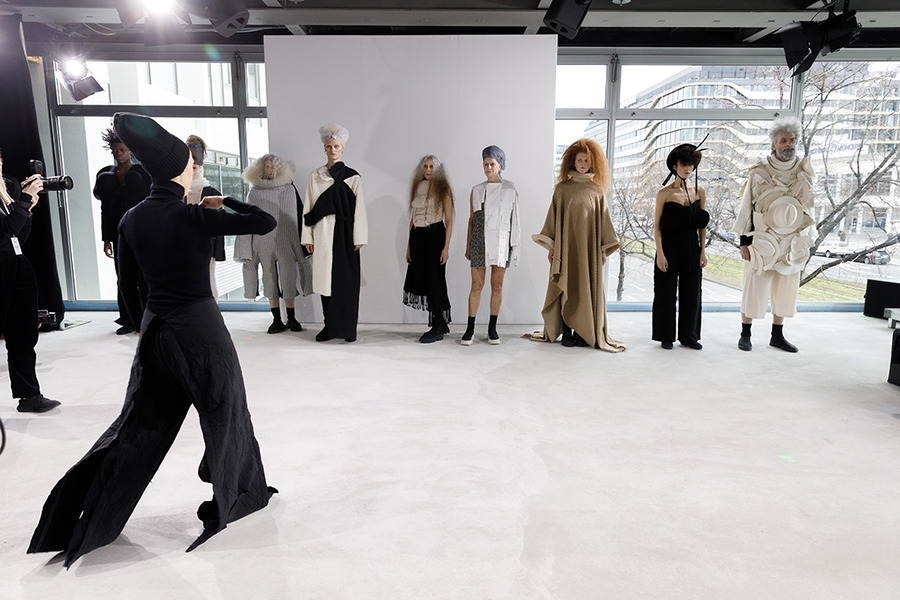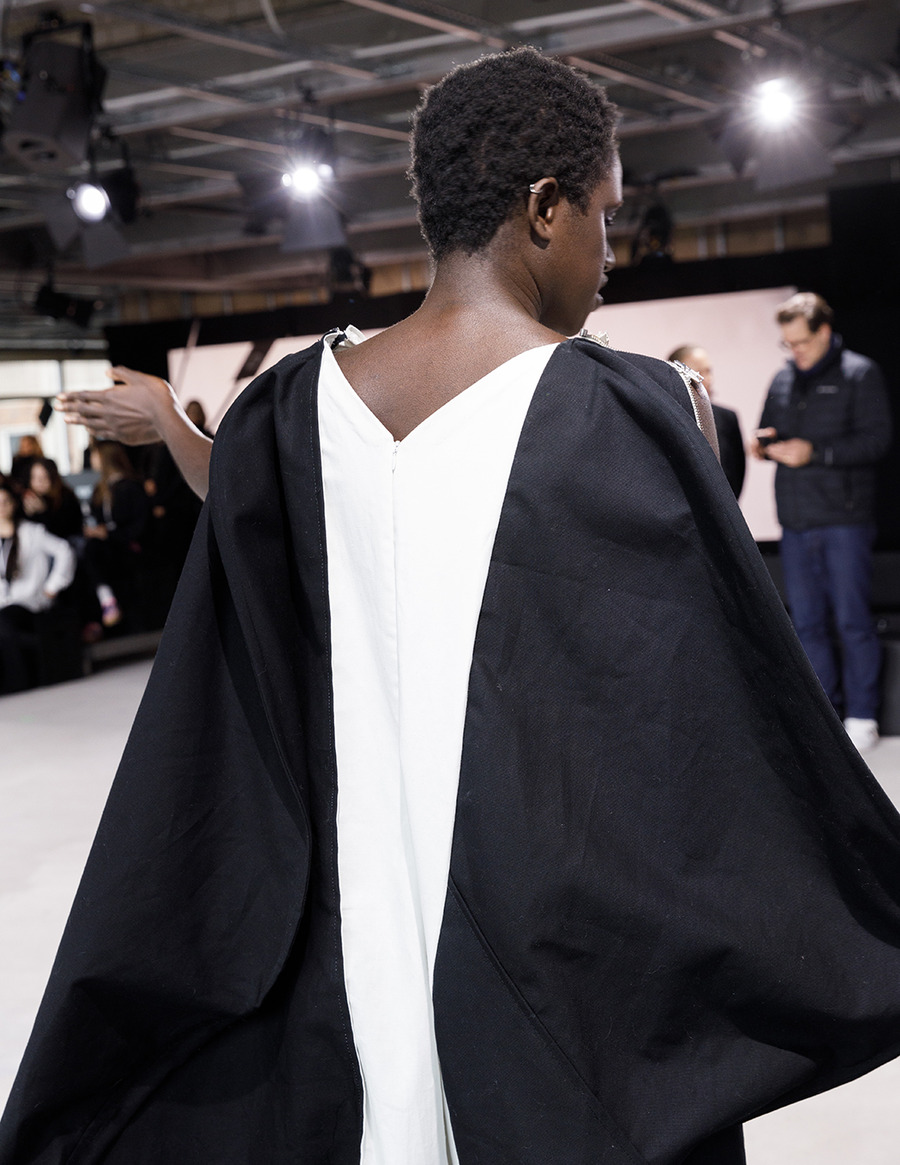 Submerged in the sombre yet dynamic ambience of the NEWEST-Showspace, which momentarily became her canvas and confessional, Dzhus transformed the runway into an intimate auditorium, narrating a tale deeply inked with endurance. As we sipped thoughtfully from the depths of the press café, Yulia Reznikov, our dedicated lens whisperer, slipped behind the scenes to immortalize Dzhus’ testament.