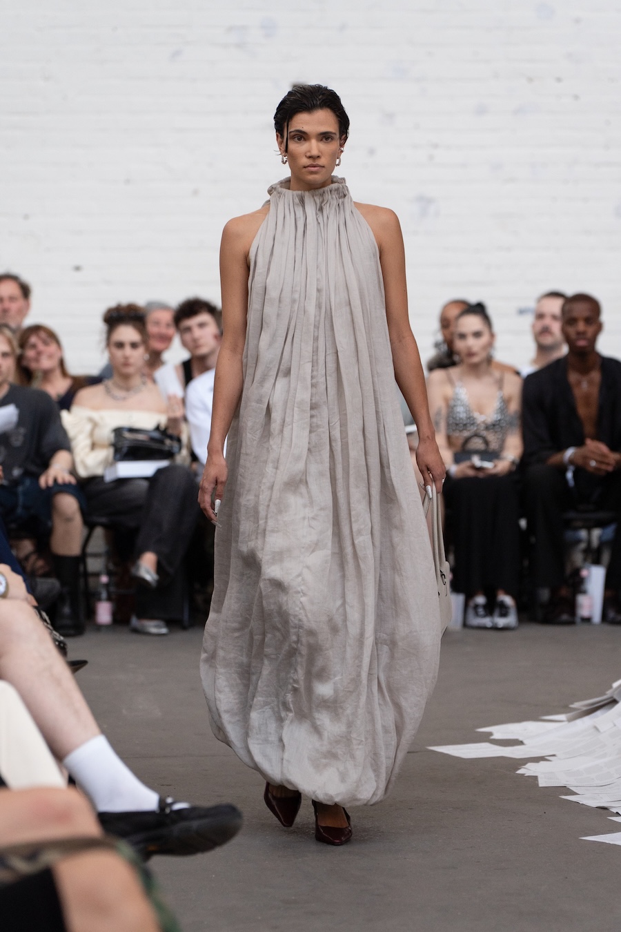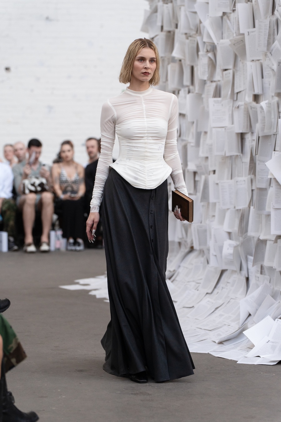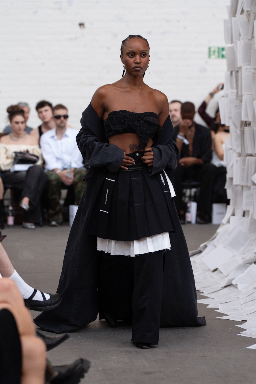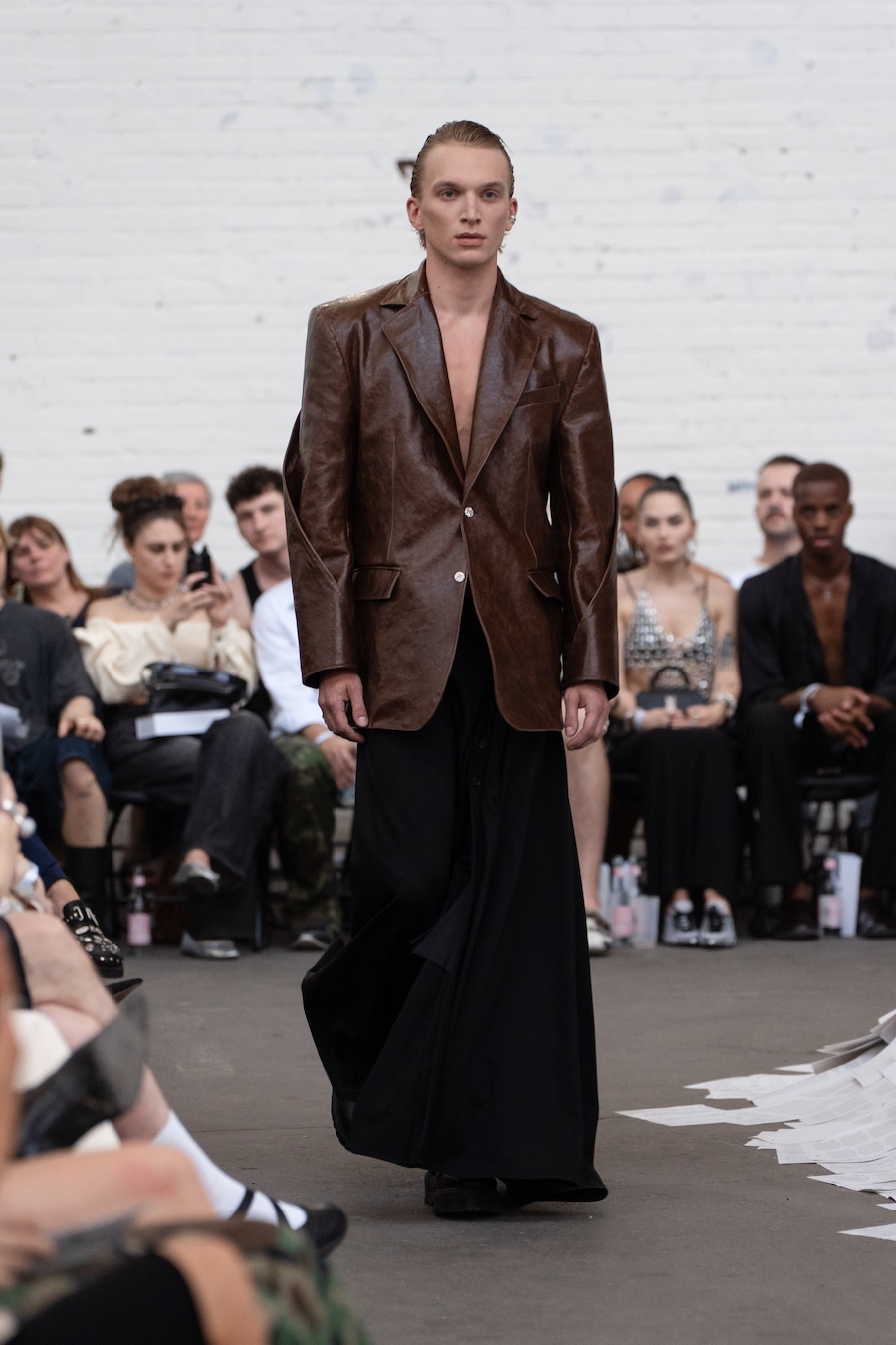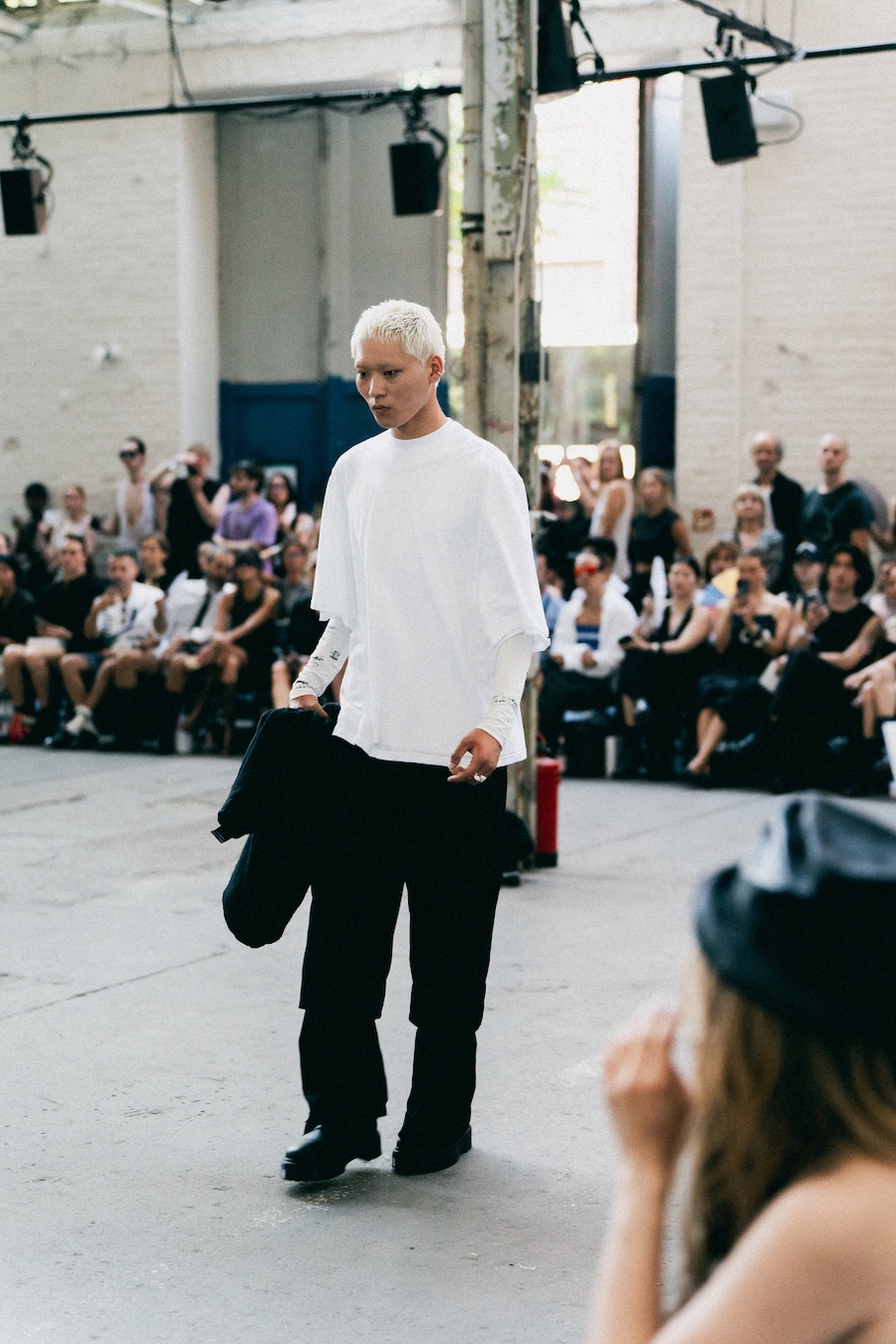 The runway at Haus der Visionäre provided a backdrop of introspective calm. Guests were enveloped in a kinetic soundscape crafted by Chontane, where object-based audio technology adapted in real-time to accompany the models, echoing the collection’s exploration of presence and identity. The thoughtfully selected model cast, curated in partnership with Joy Livia, underscores HADERLUMP’s unwavering commitment to authenticity and representation.