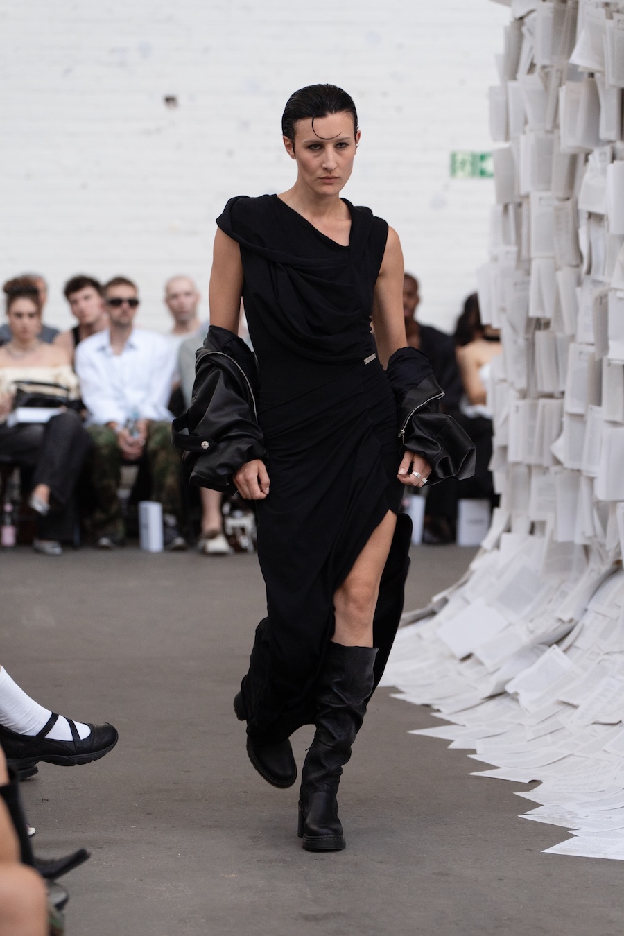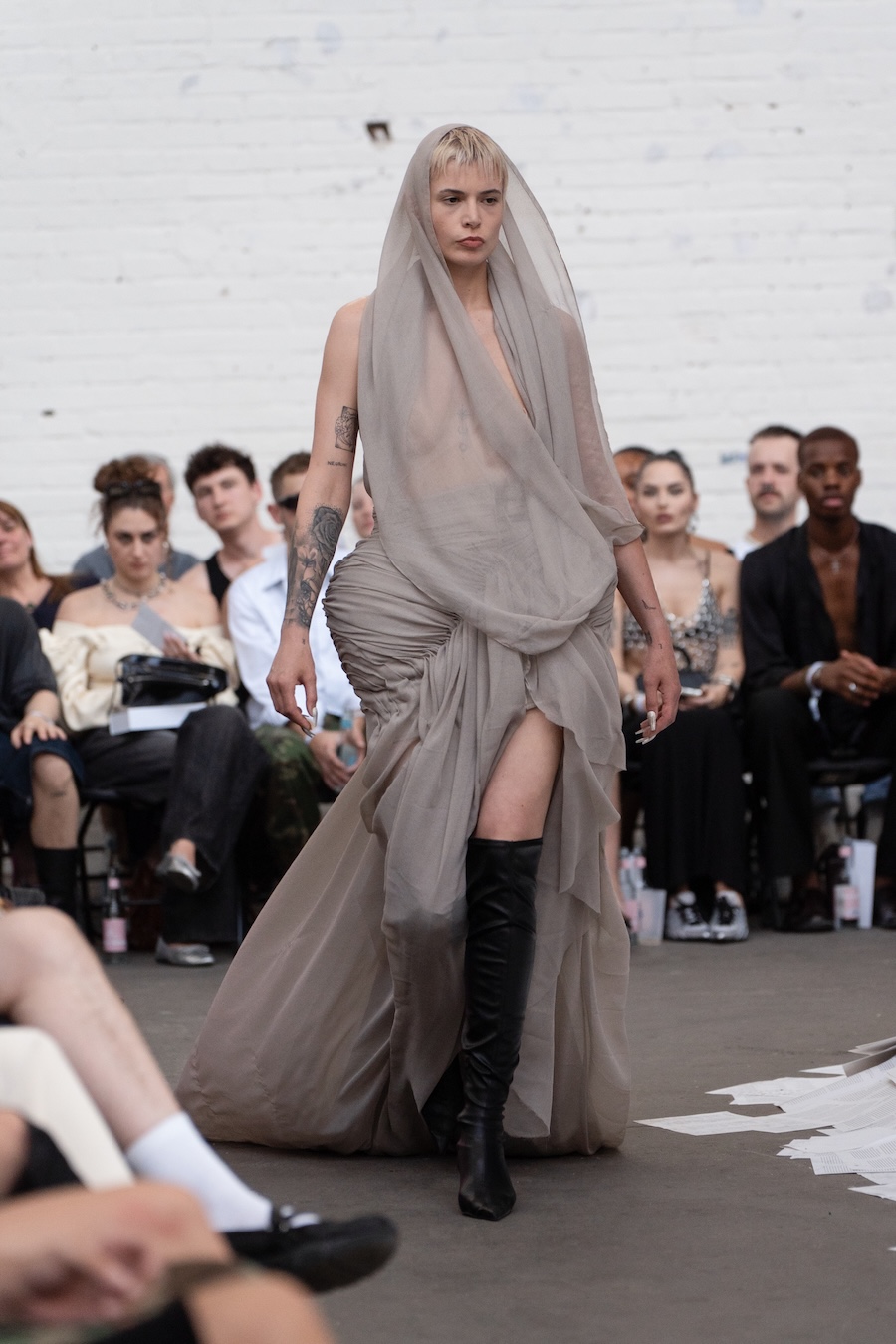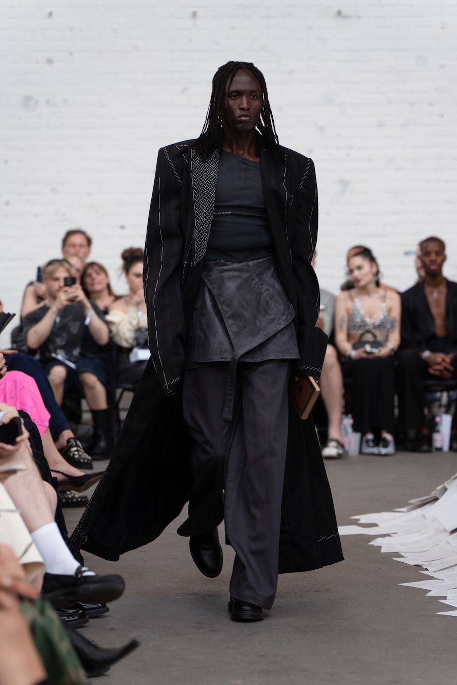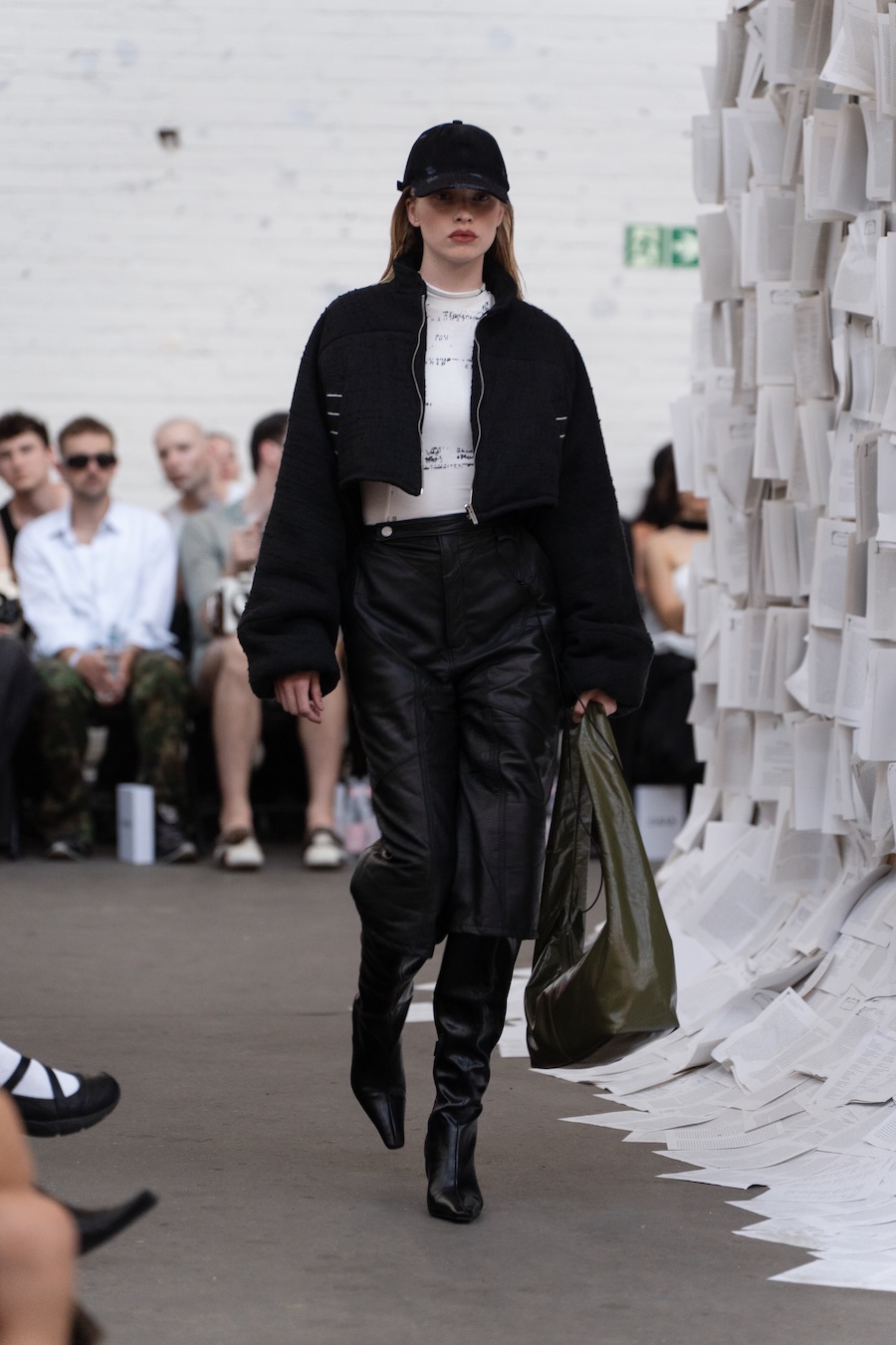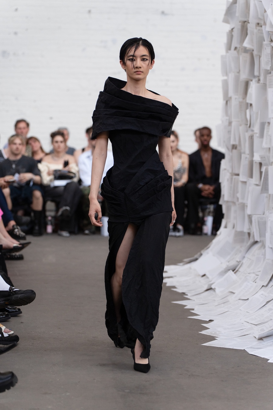 The runway at Haus der Visionäre provided a backdrop of introspective calm. Guests were enveloped in a kinetic soundscape crafted by Chontane, where object-based audio technology adapted in real-time to accompany the models, echoing the collection’s exploration of presence and identity. The thoughtfully selected model cast, curated in partnership with Joy Livia, underscores HADERLUMP’s unwavering commitment to authenticity and representation.