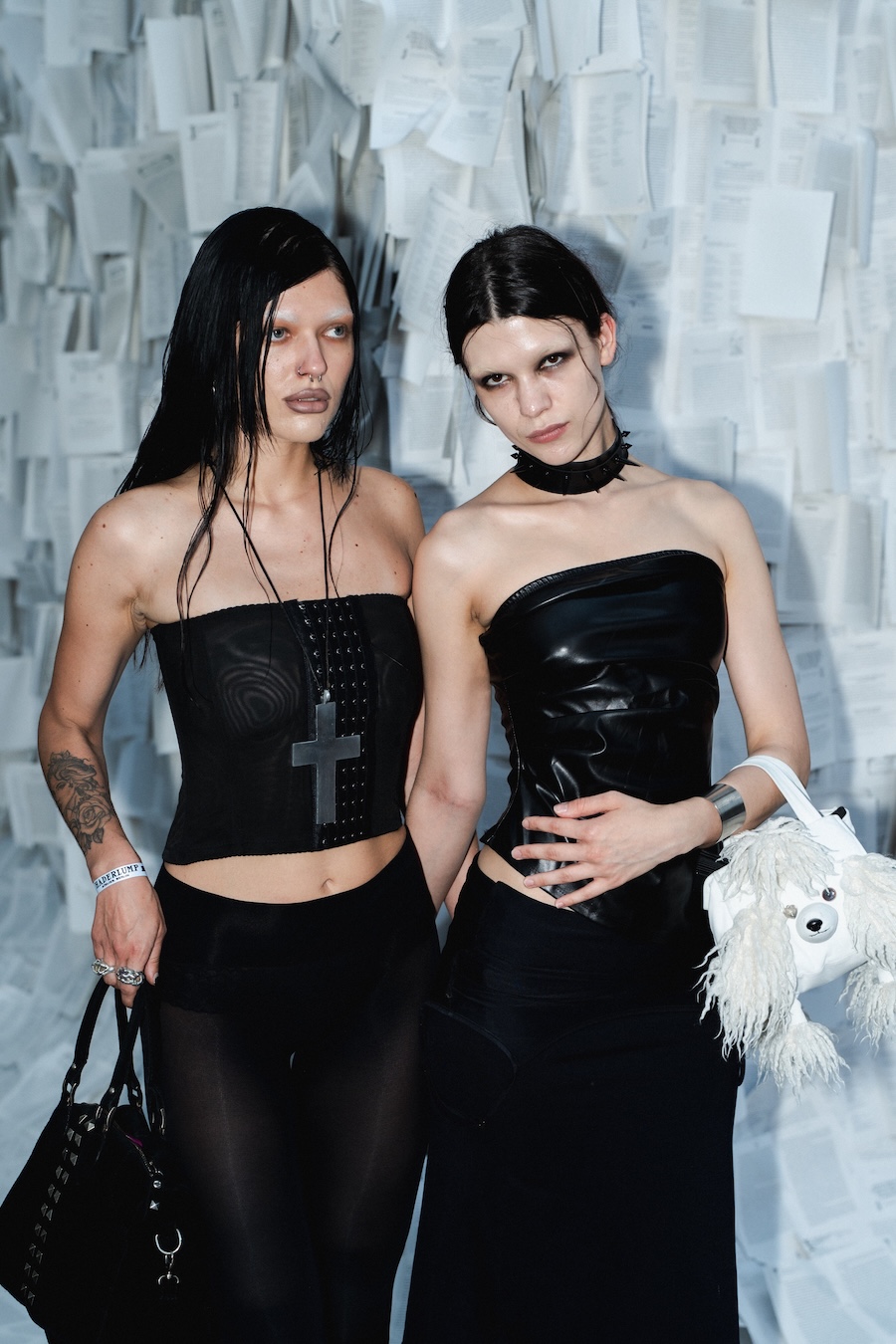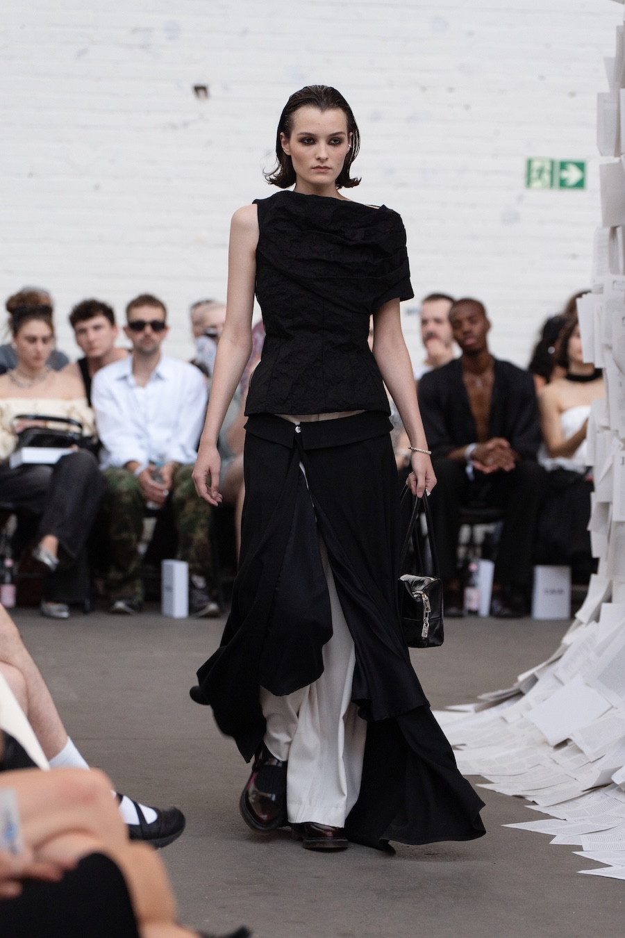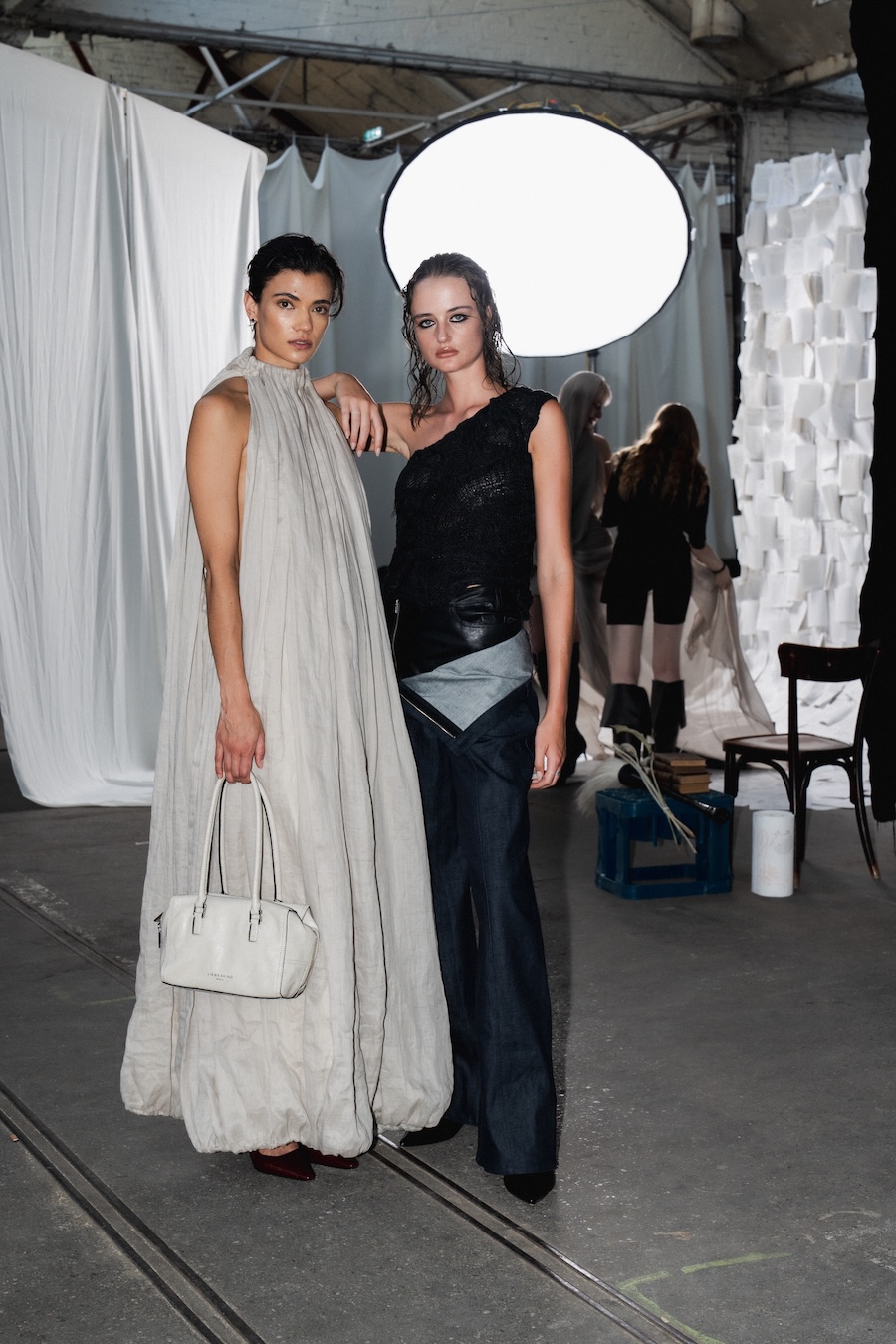 Collaboration remains at the heart of HADERLUMP’s philosophy. For EXLIBRIS, they joined forces with Berlin-based accessories powerhouse Liebeskind to transform archival bag styles into modern expressions of exlibris symbols, each piece redefining ownership through a contemporary lens. Hair and makeup were meticulously orchestrated by Caia Cosmetics, enhancing the intricate interplay of structure and movement throughout the looks.