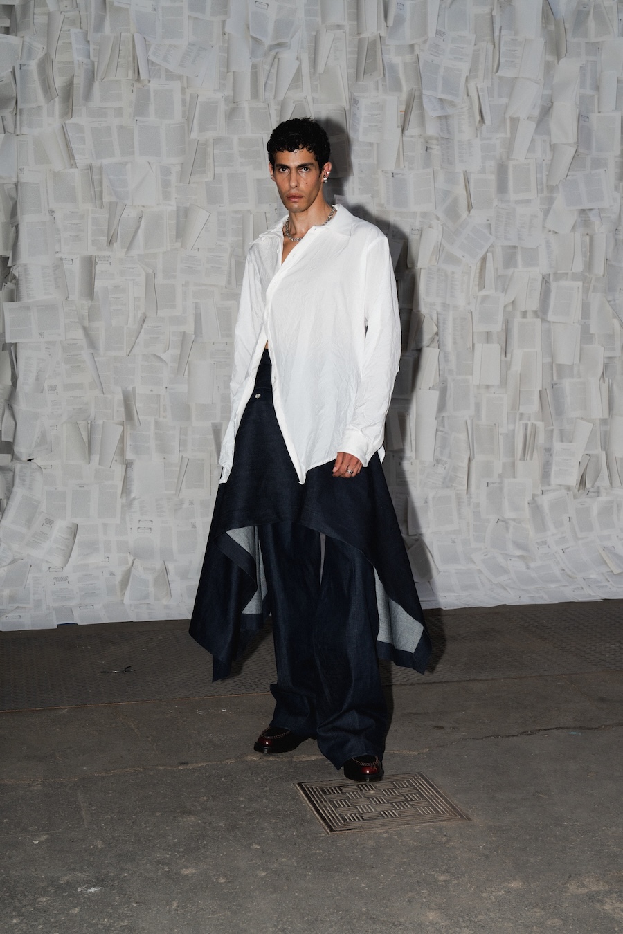 Materials and textures evoke the tactile experience of aged books: the coarse linen of antiquated pages, the polished grain of vintage leather, the crisp folds of pressed paper. Denim, leather, and responsibly sourced deadstock linen create a fabric lexicon that mirrors the wear and complexity of treasured relics. The colour palette, with its muted hues of faded ink, weathered parchment, and charcoal, invites an intimate, atmospheric experience, rich yet restrained.