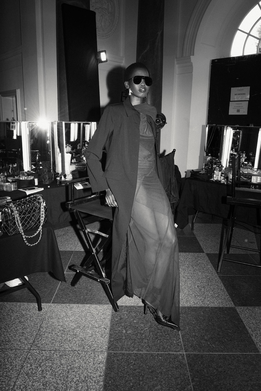 The colour story is equally captivating, showcasing a blend of soothing neutrals, such as sand, beige, and blush, against a backdrop of richer, darker shades, including ganache brown and deep olive. Dominated by black, the collection deftly turns the focus from overt embellishment to the mastery of cut and silhouette.
