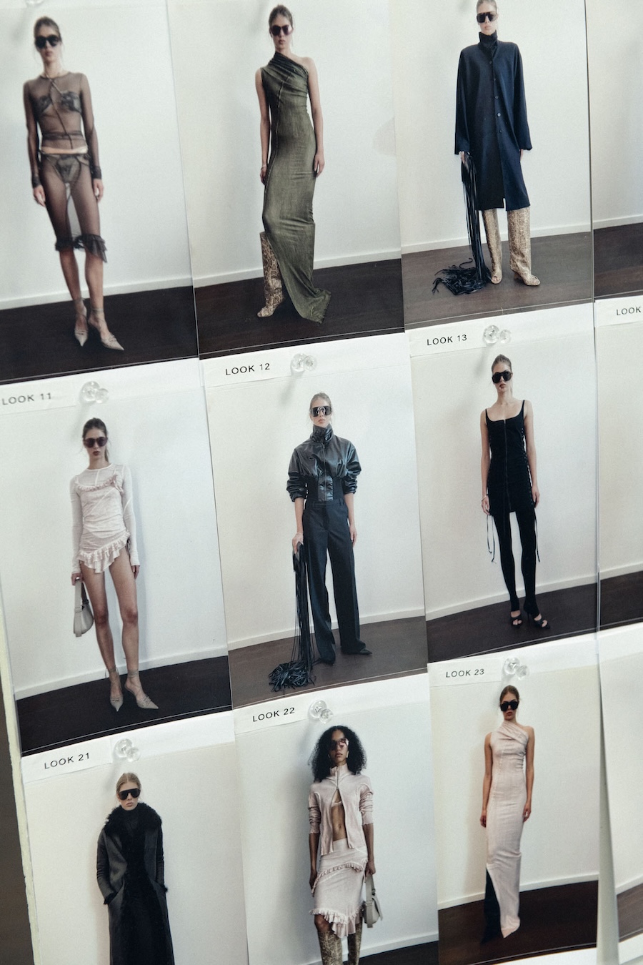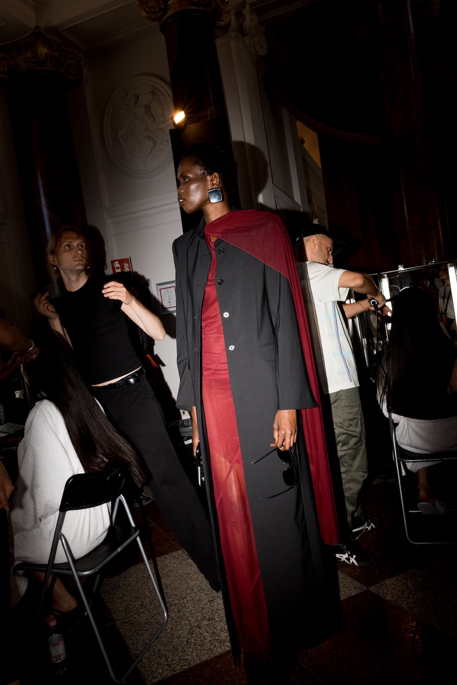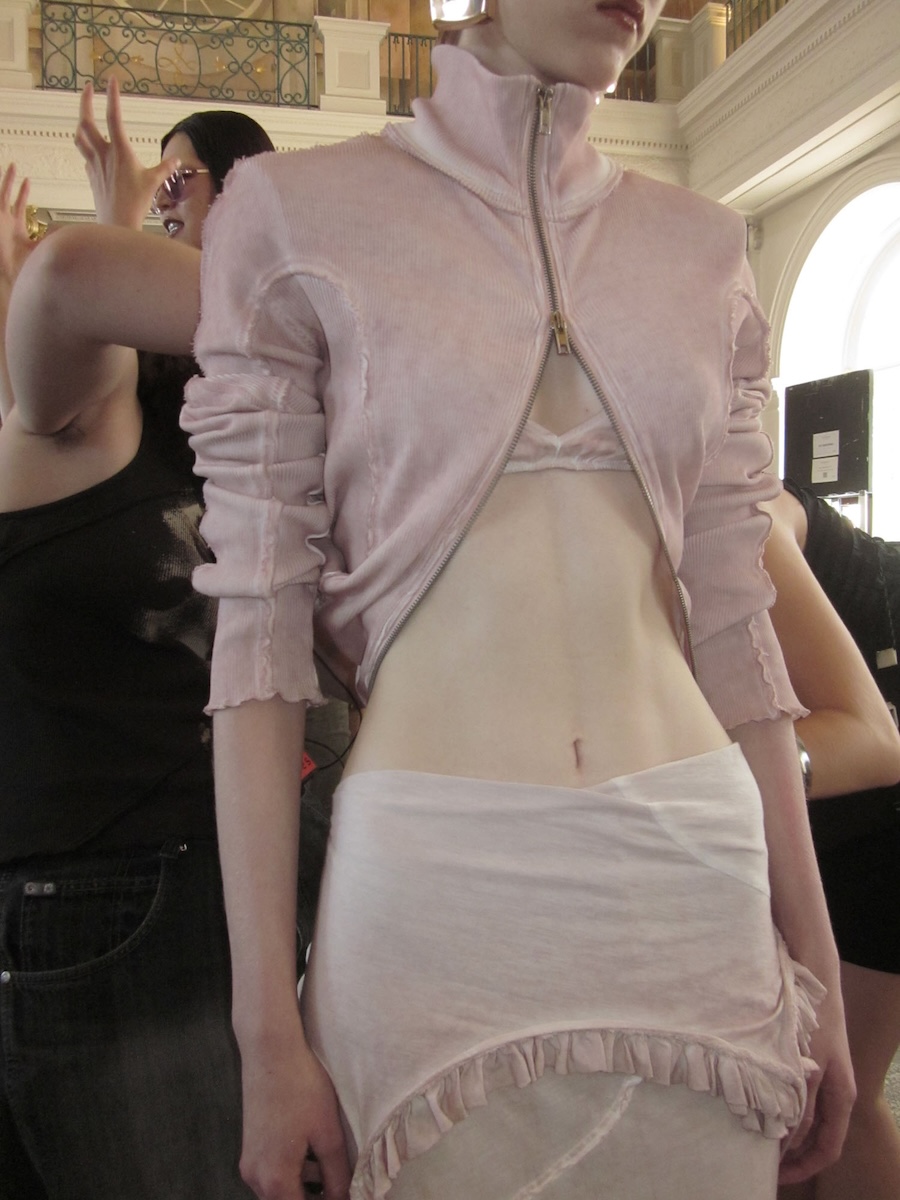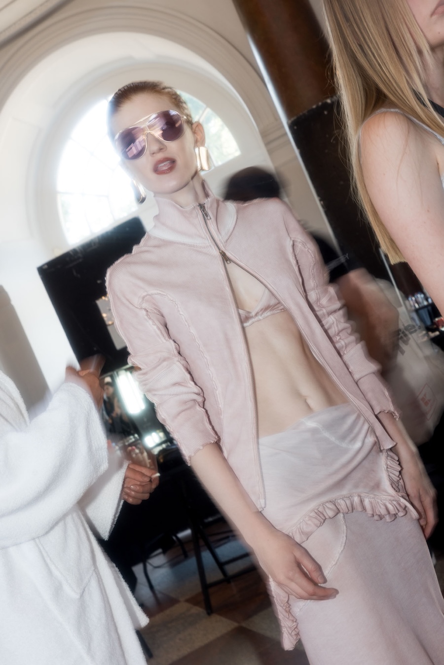 At the core of this collection lies a mixture of lightweight mesh, luxurious Supima cotton, and ethereal vegetable-dyed ruffles that convey an airy elegance. However, it’s the juxtaposition of these textiles with raw hems, sculptural outerwear, and structured cuts that creates an electrifying tactile tension. Transformative pieces—those that are adjustable and purposefully unfinished speak to a ritualistic quality that underscores self-care and the ongoing journey of self-discovery.