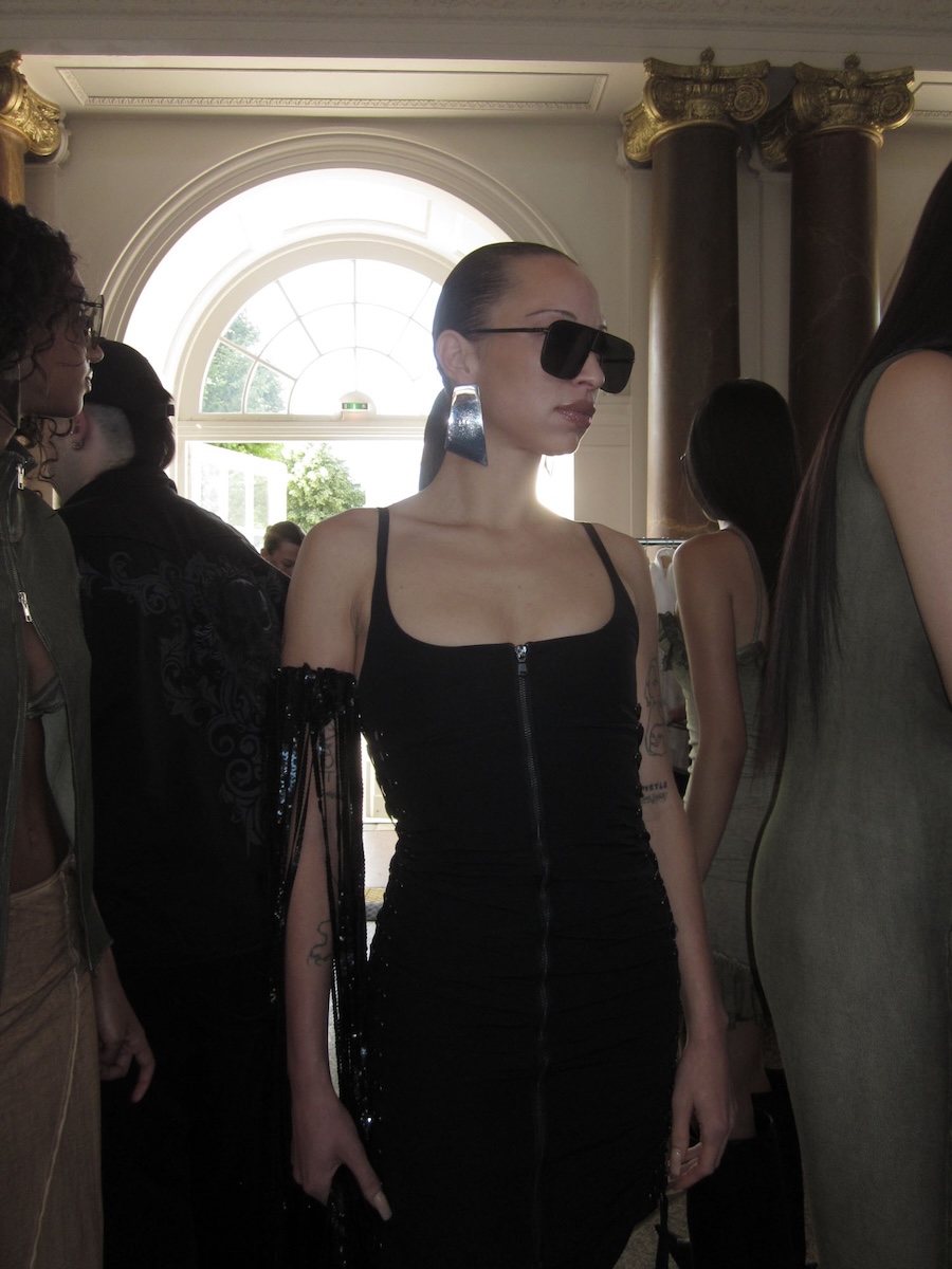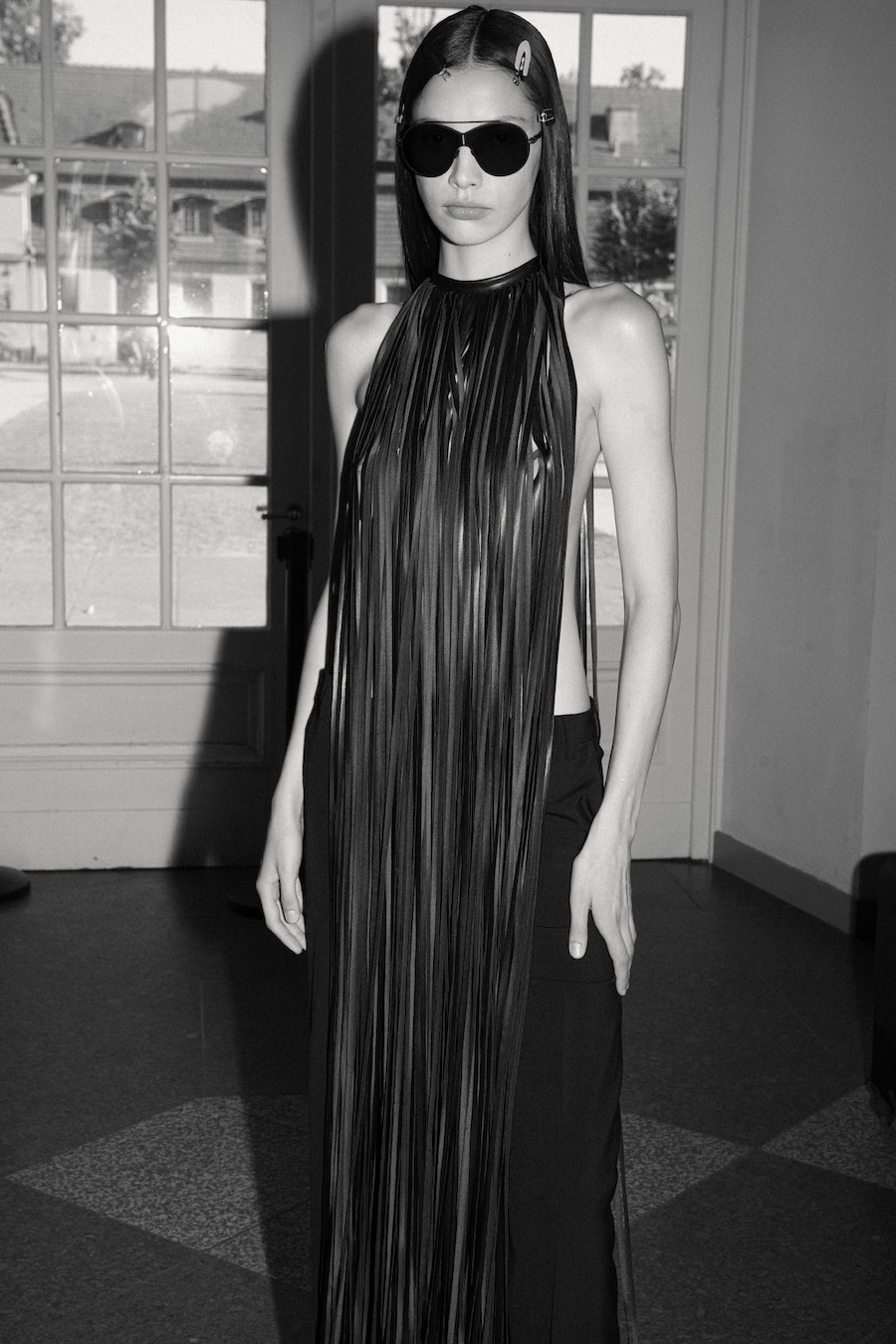 Drawing inspiration from the delicate interplay between protection and exposure, IOANNES encourages wearers to eschew emotional armour in favour of embracing their unique, nuanced beauty. The designer’s approach uncovers a compelling duality, where softness meets sharpness through a sophisticated fusion of sheer, flowing fabrics, figure-hugging silhouettes, and sharp tailoring, all accented with playful accessories.