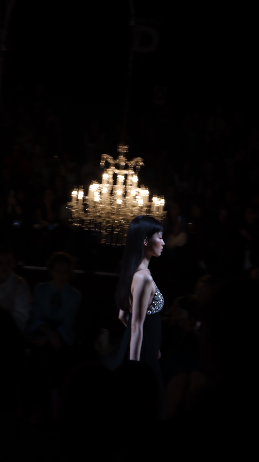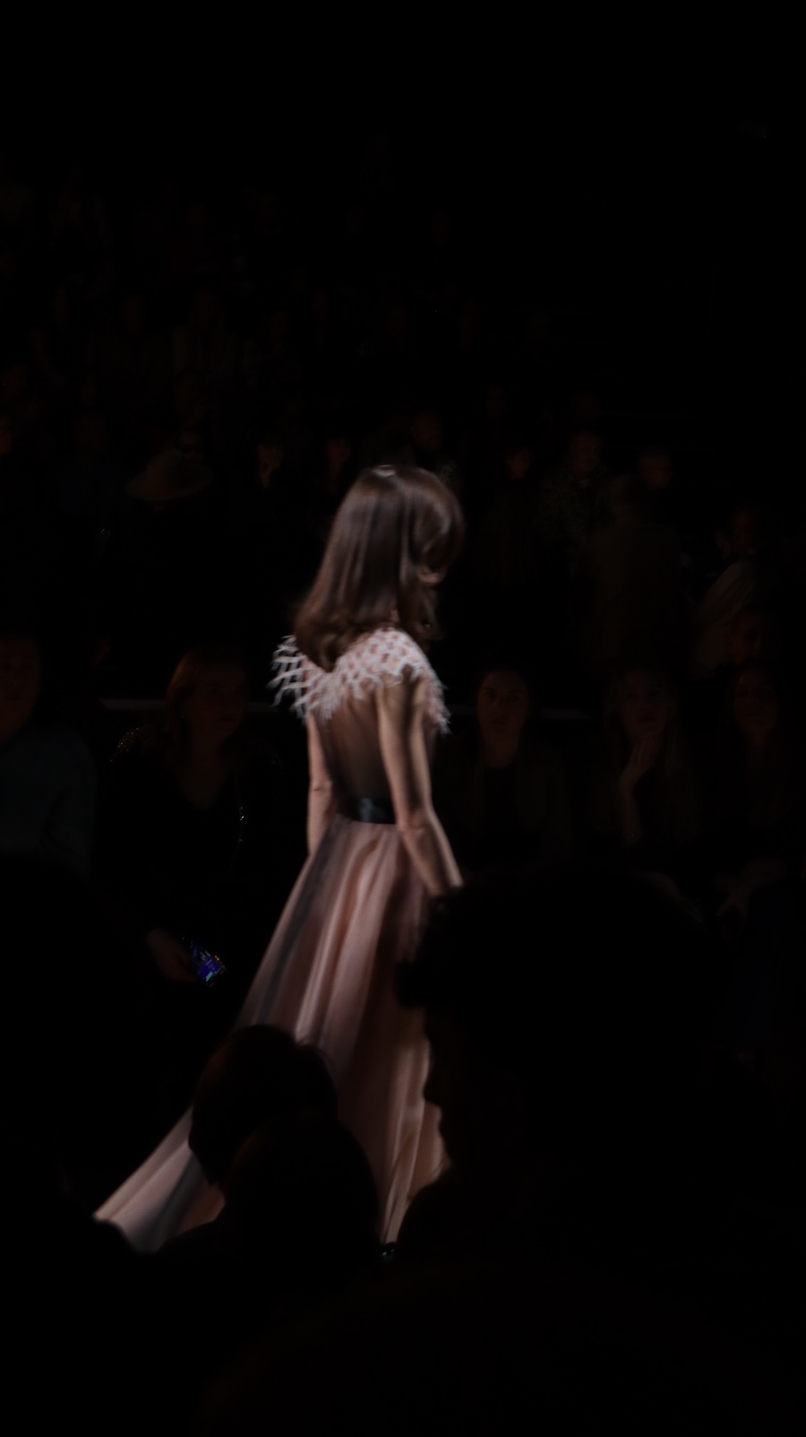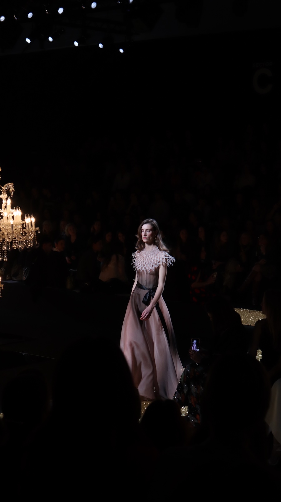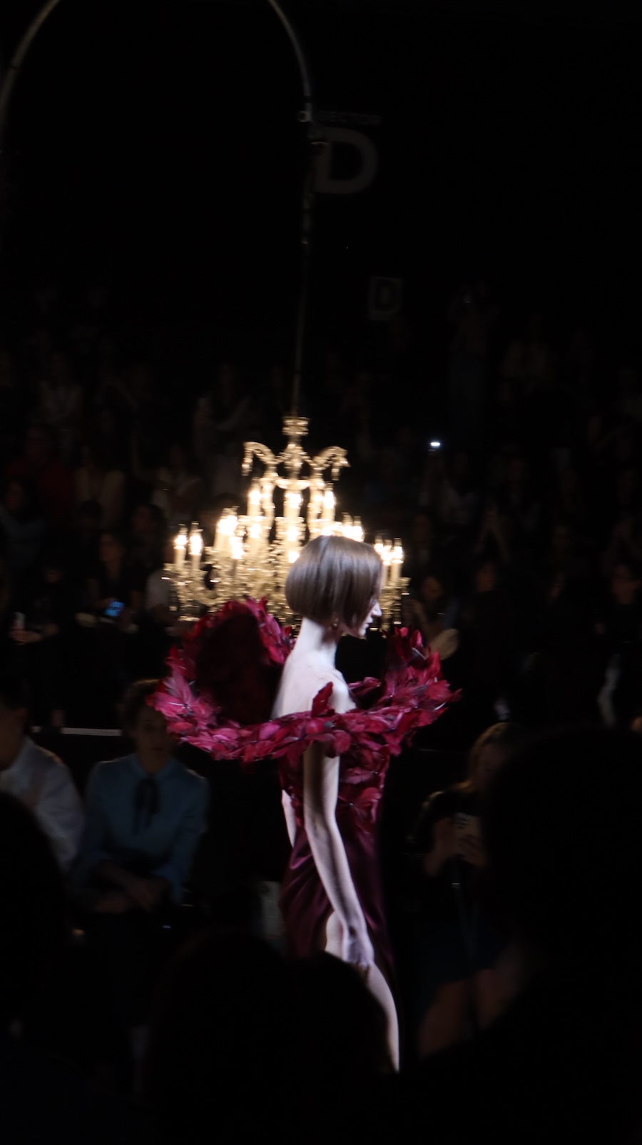 On the catwalk, the gasping is immediate as soon as these avant-garde technological designs are in sight, especially the white one with LED lights. The black moving rose is the last one to be shown, and the model takes her time to walk, as she stops from time to time to look at the audience and stare at us while the dress moves.