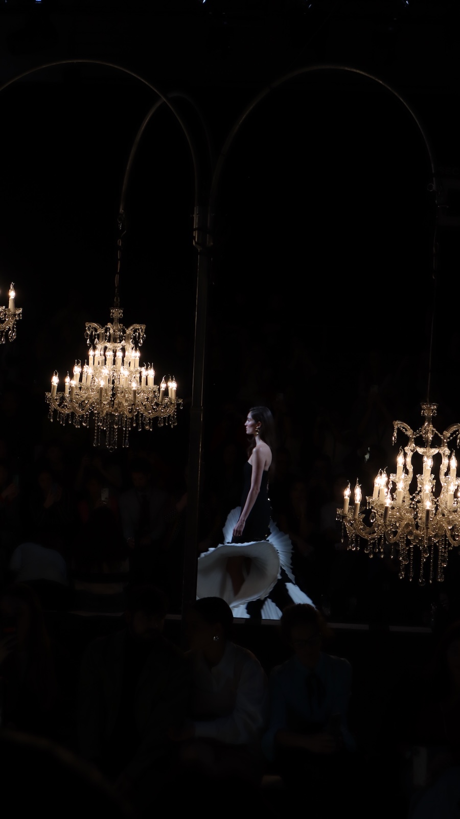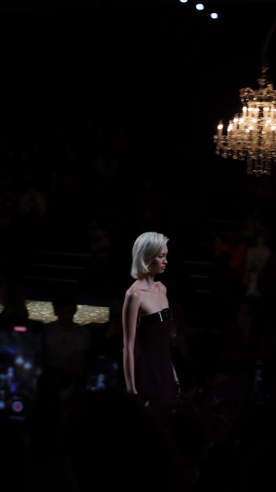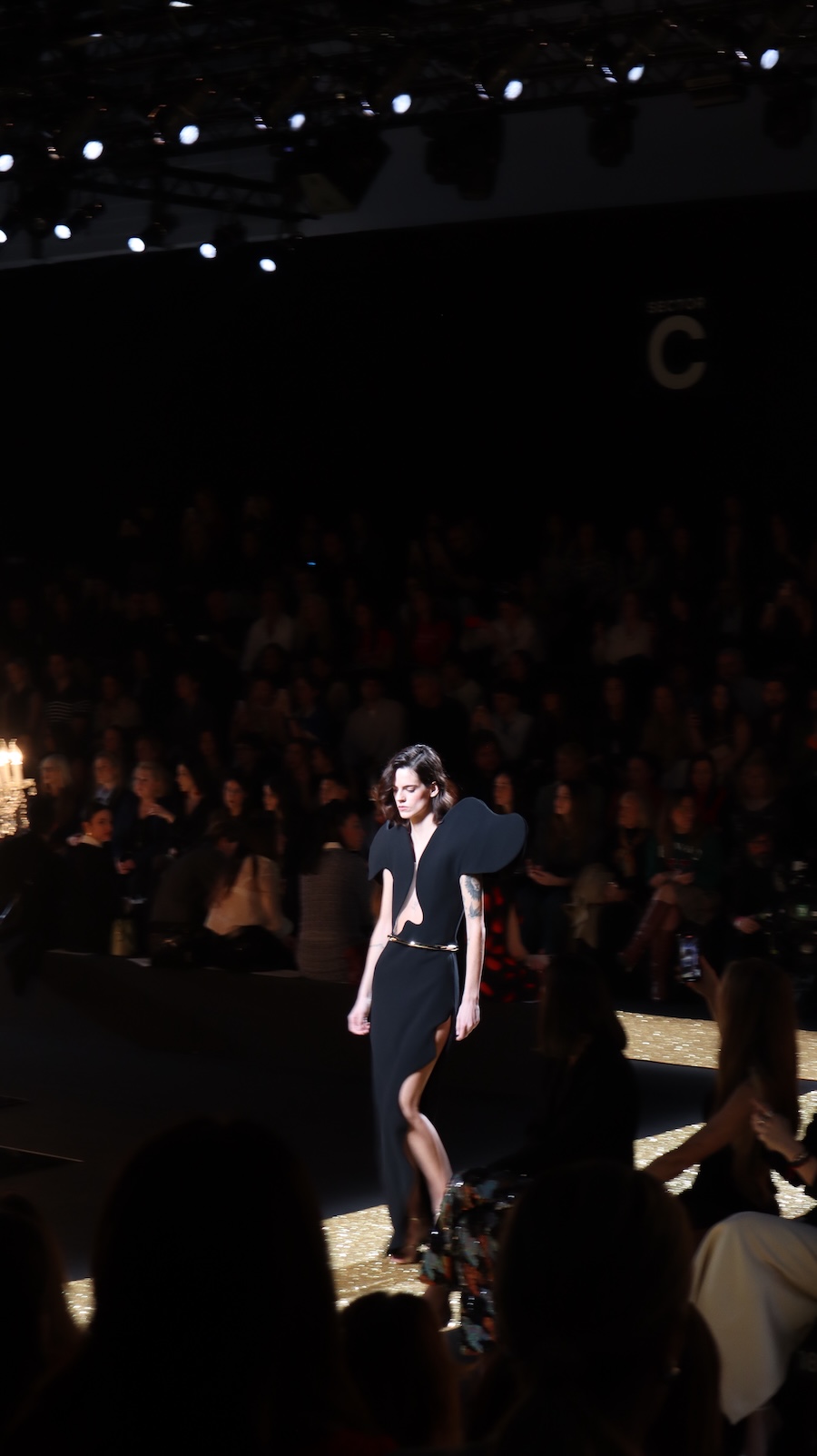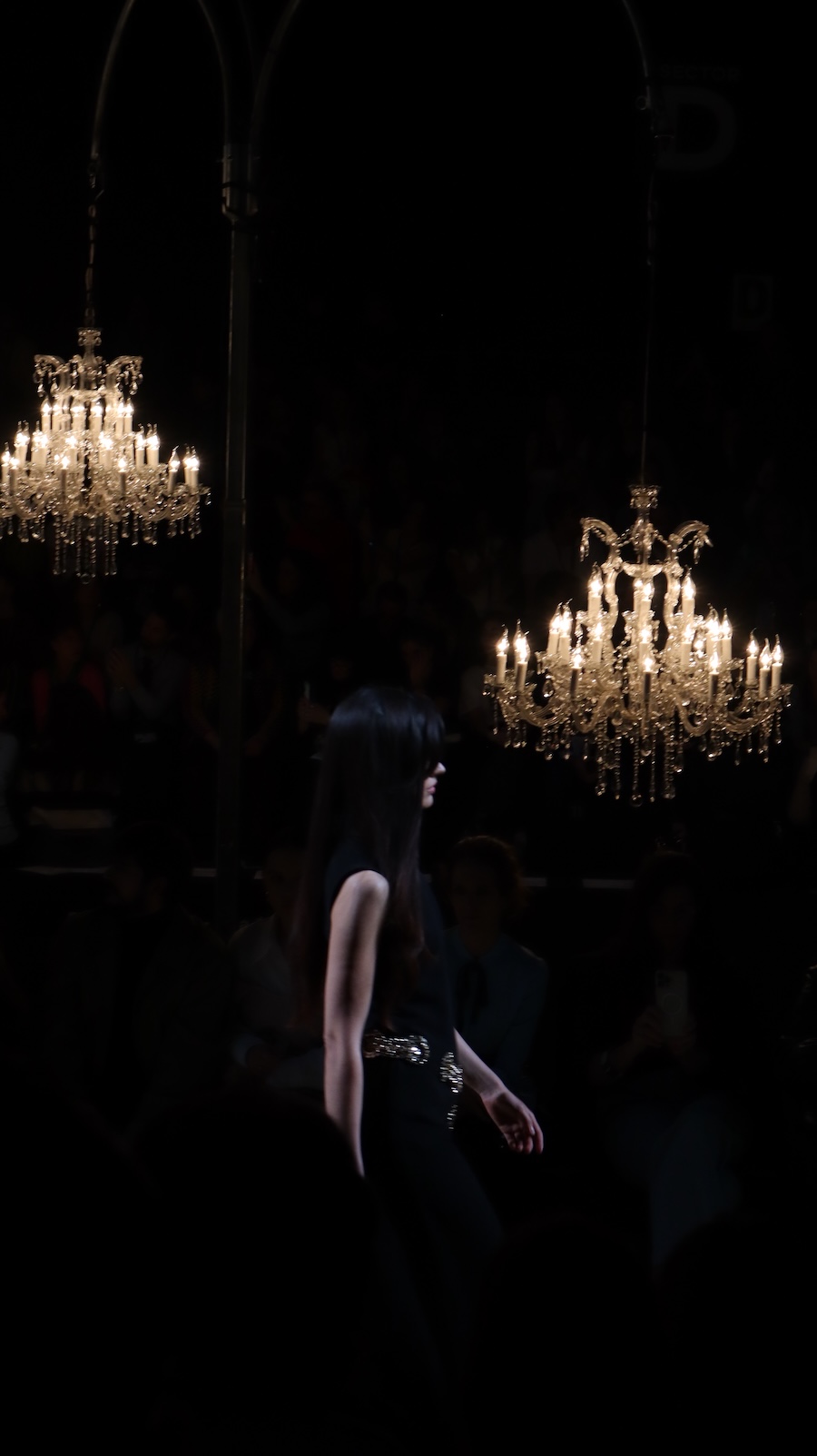 On the catwalk, the gasping is immediate as soon as these avant-garde technological designs are in sight, especially the white one with LED lights. The black moving rose is the last one to be shown, and the model takes her time to walk, as she stops from time to time to look at the audience and stare at us while the dress moves.
