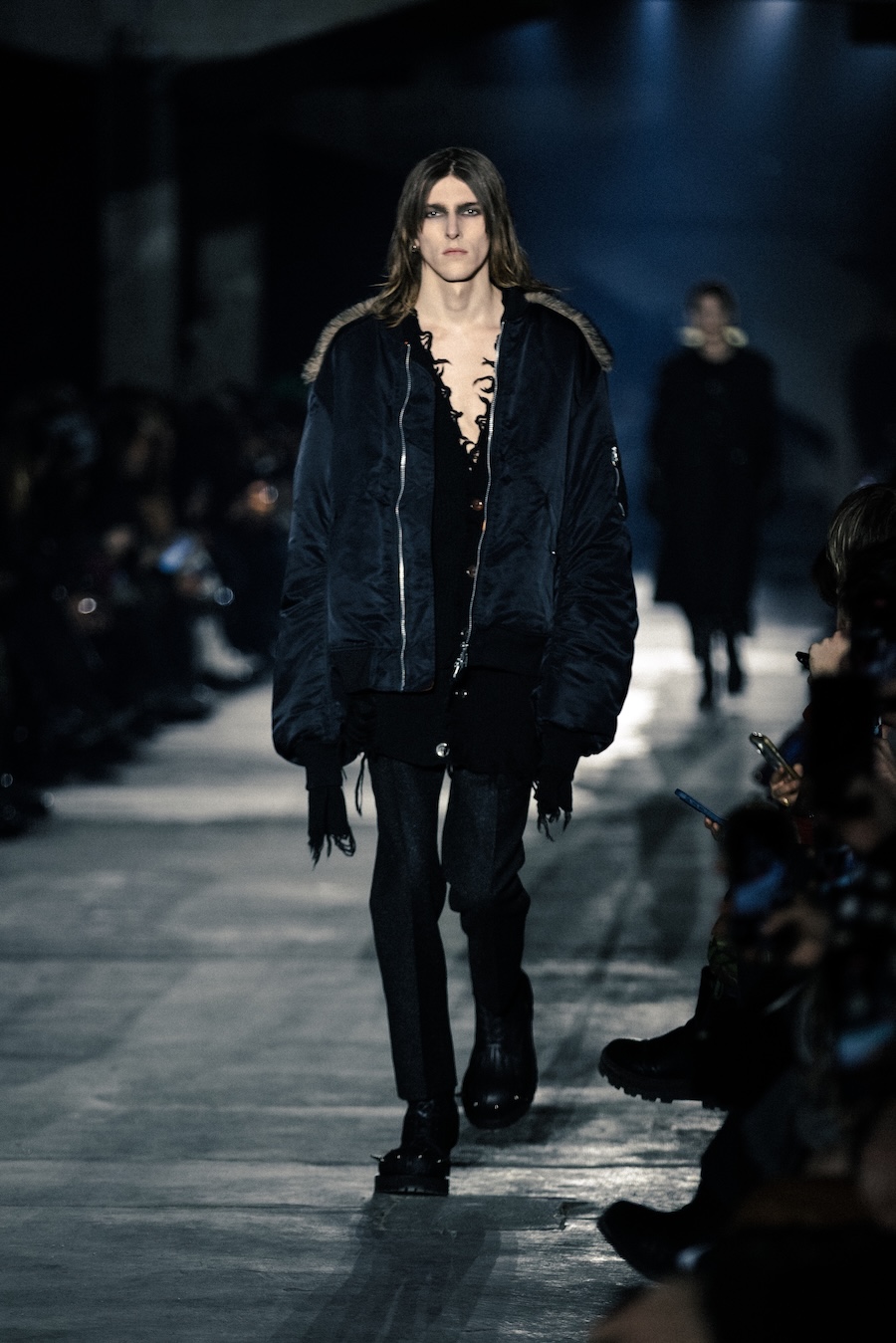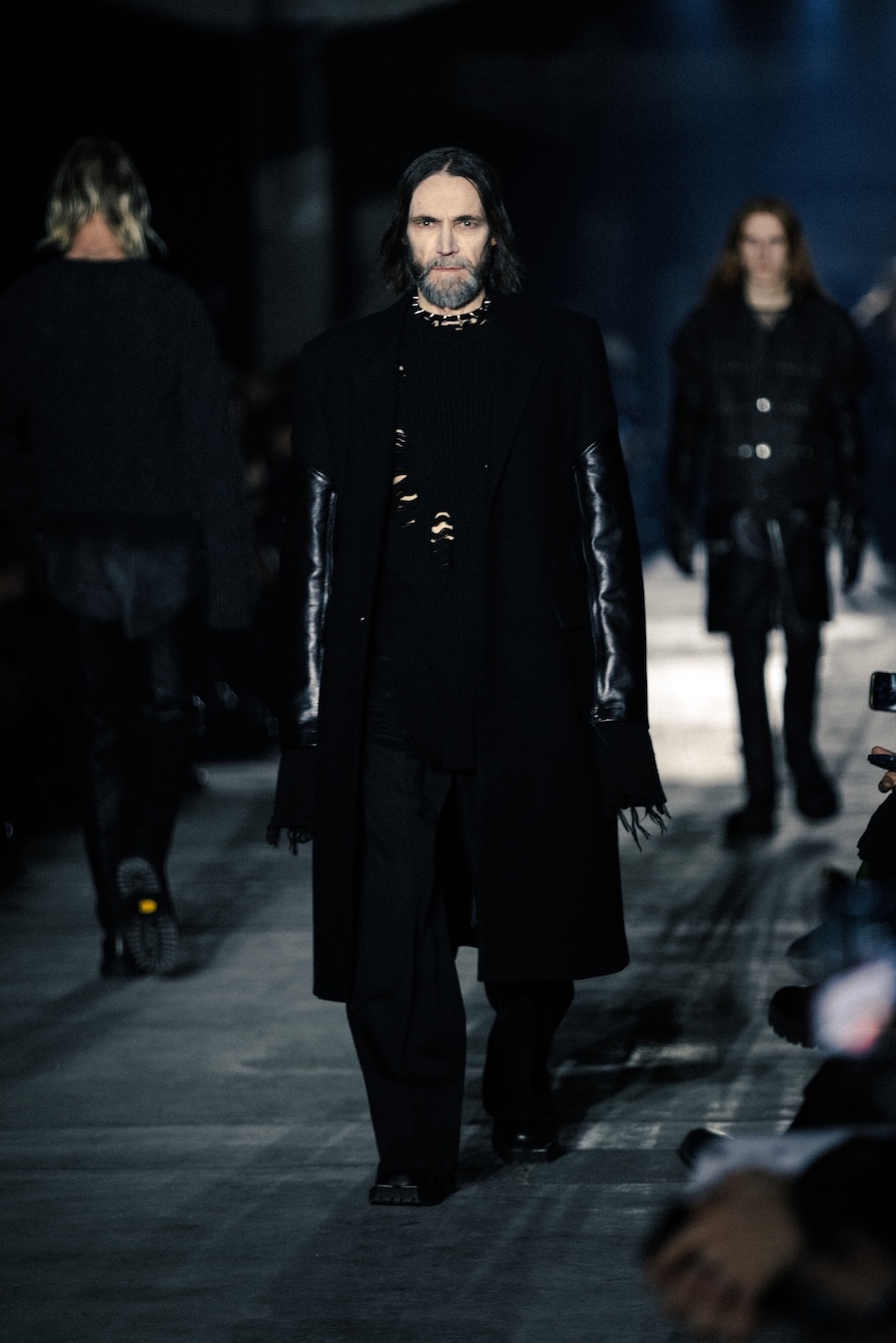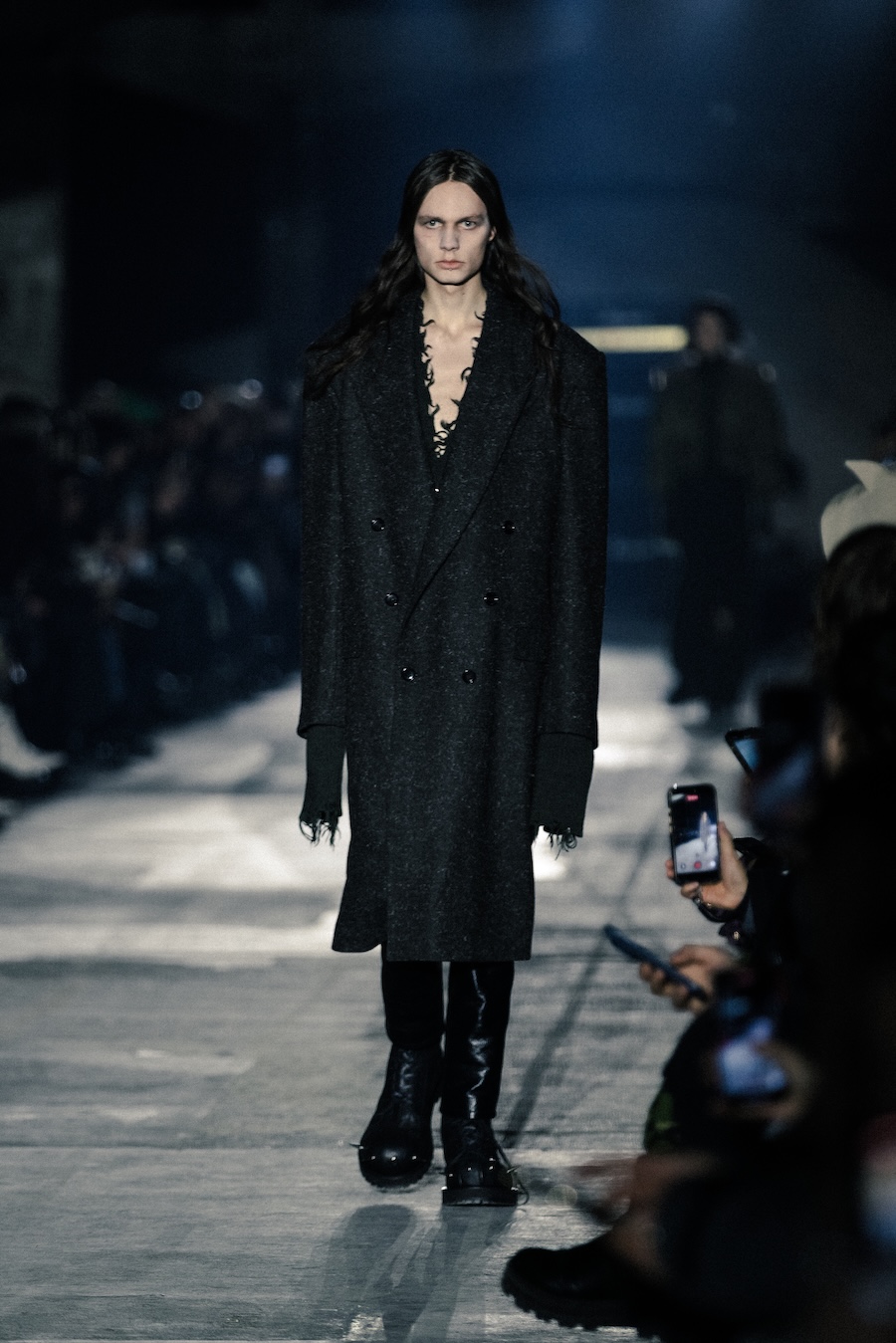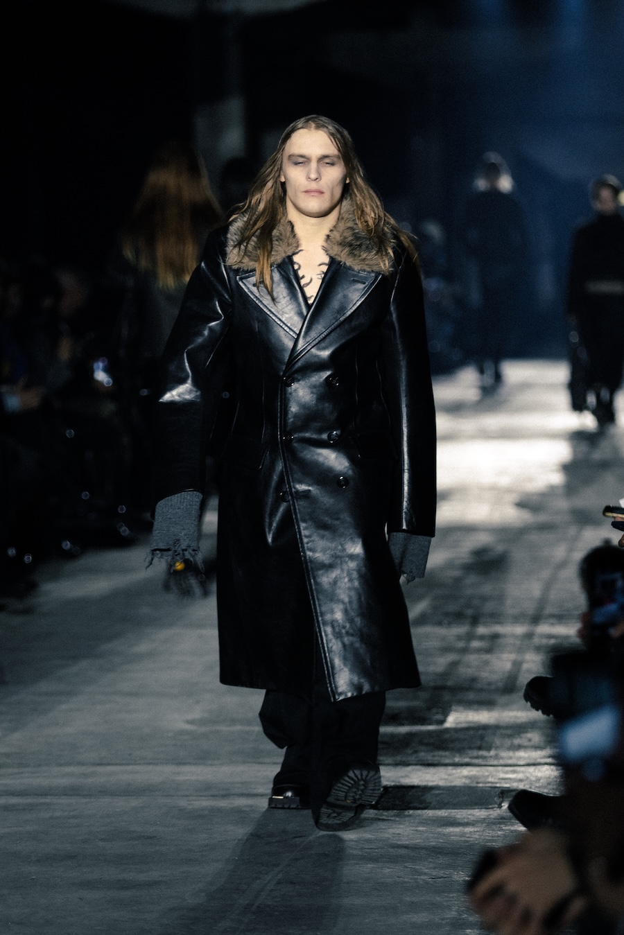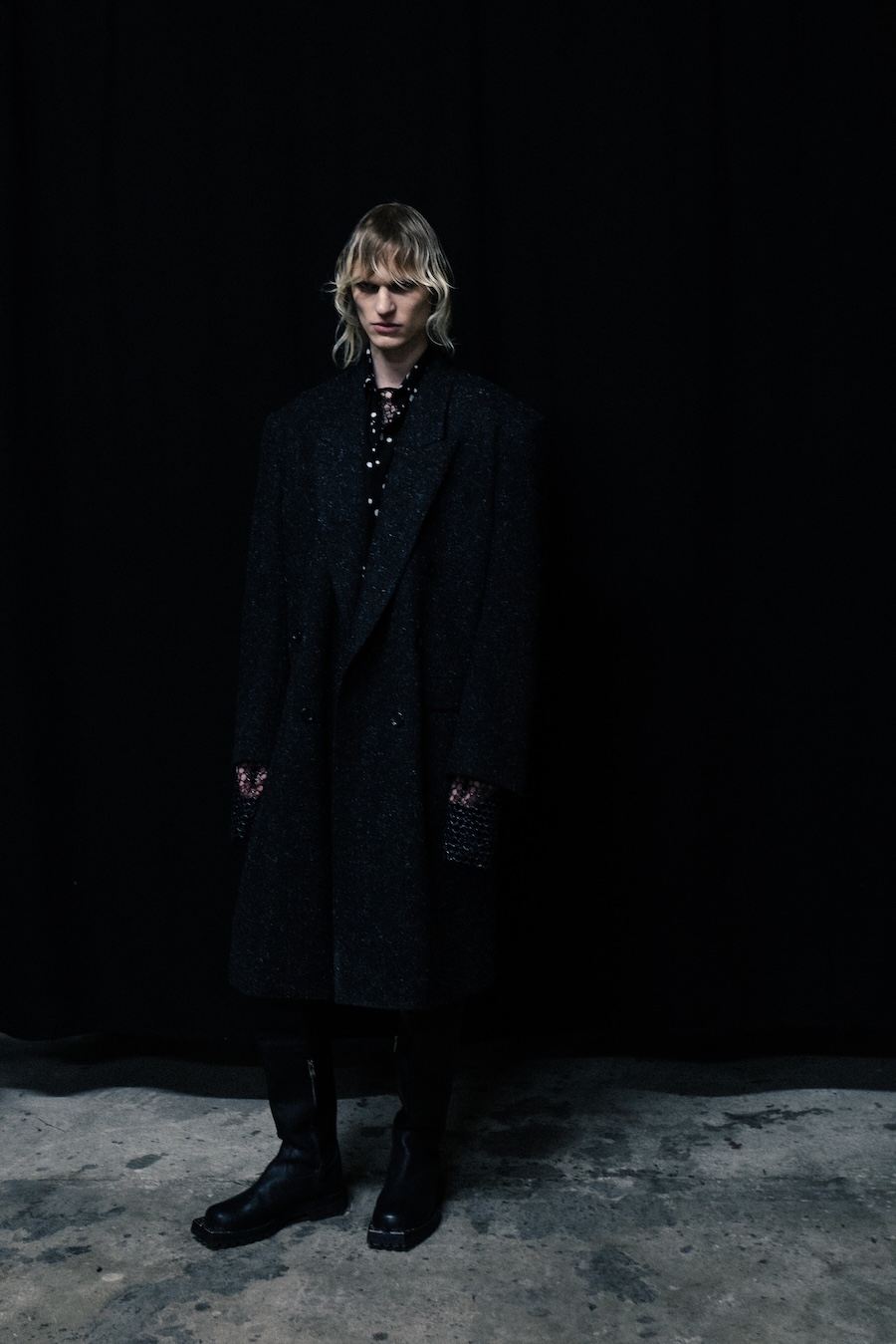 Hero pieces such as elongated coats, tailored jackets, bomber and biker jackets illustrate a silhouette that draws parallels to a boxer’s stance, forward-leaning and defensive. The innovative design features forward-set sleeves and exaggerated proportions, effectively shifting the wearer’s posture into a guarded, inward-facing position. This architectural approach serves to evoke an immediacy and tension that echoes the essence of combat.