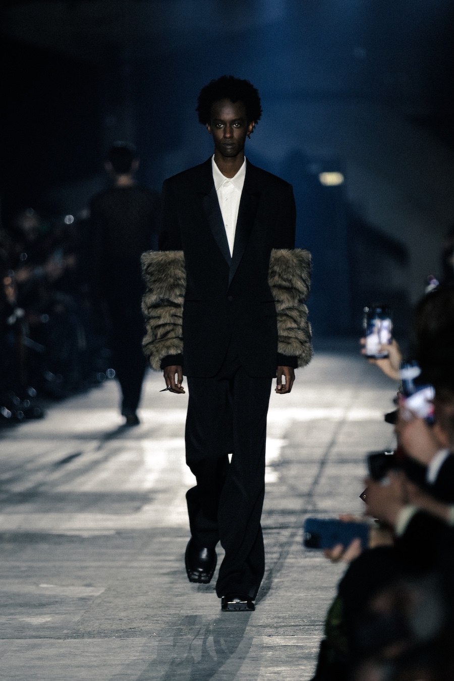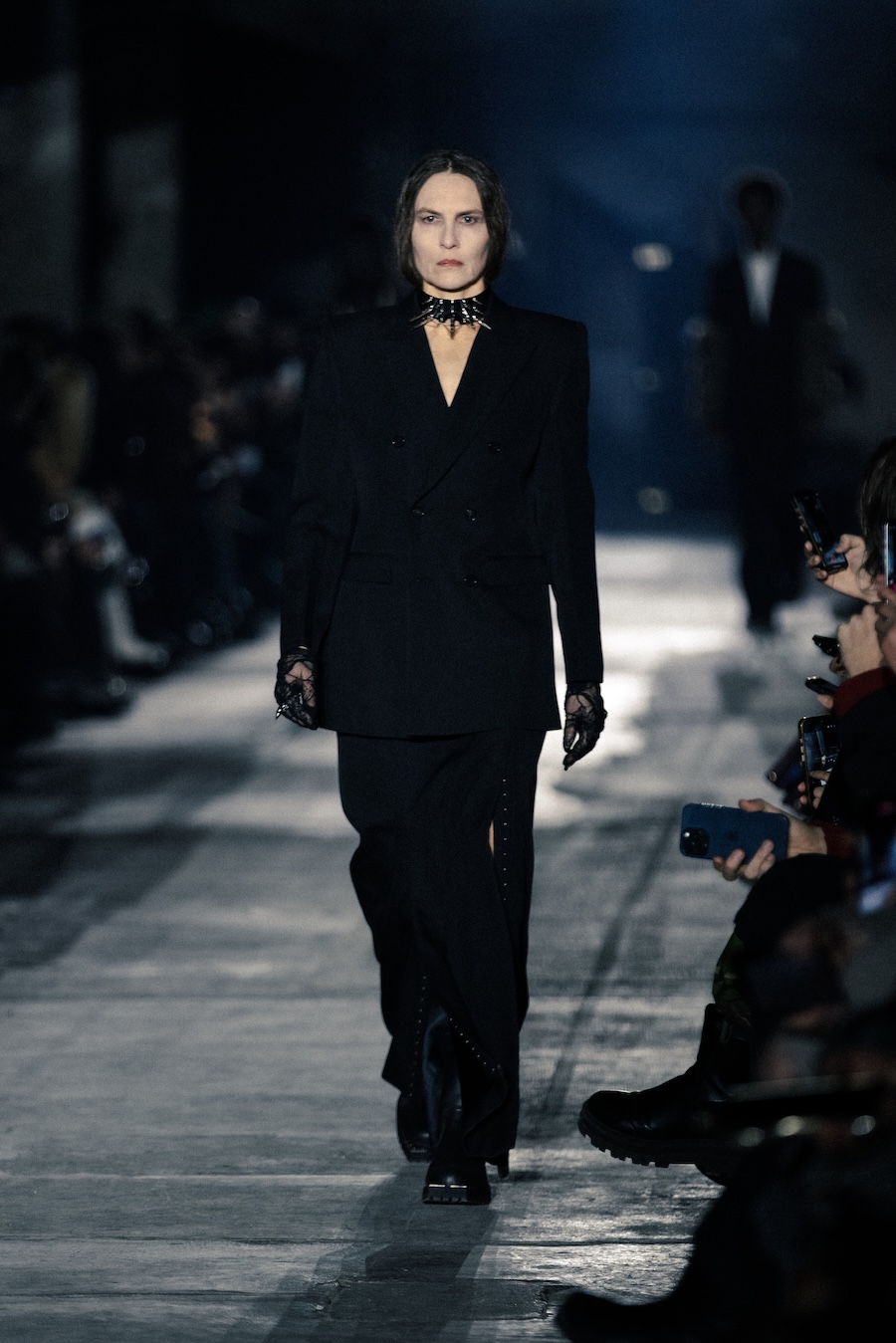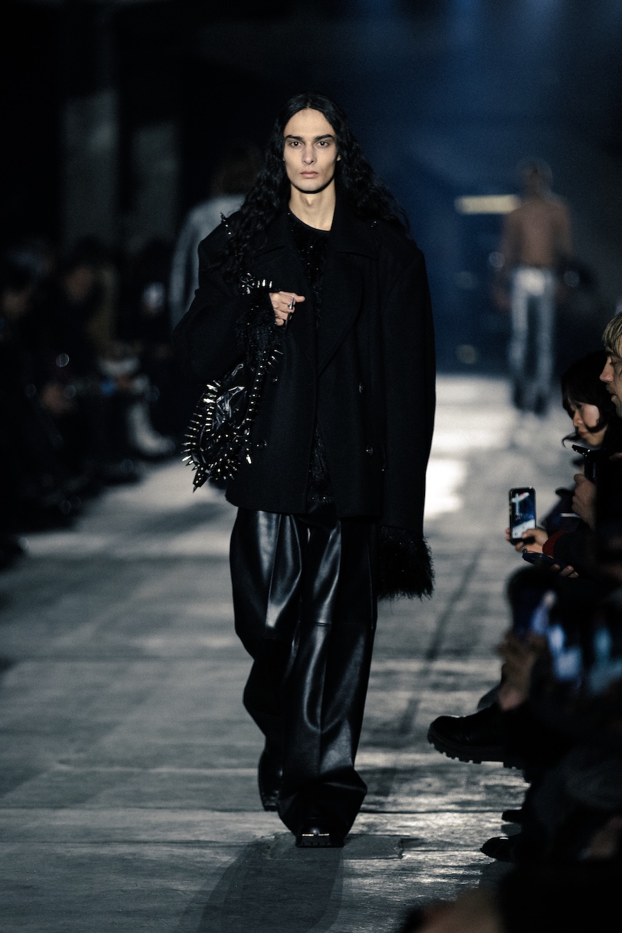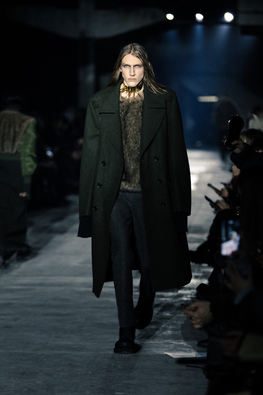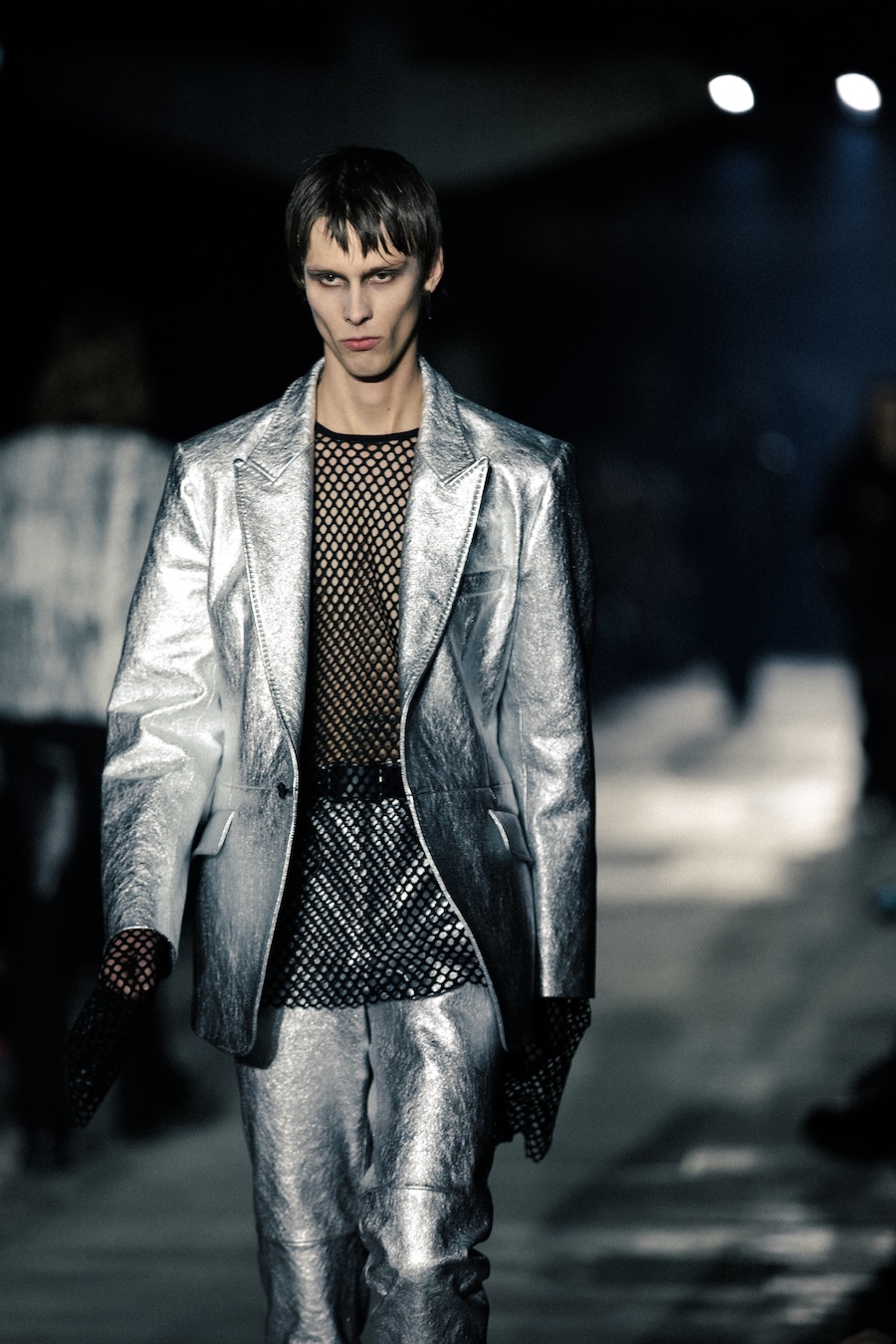 Hero pieces such as elongated coats, tailored jackets, bomber and biker jackets illustrate a silhouette that draws parallels to a boxer’s stance, forward-leaning and defensive. The innovative design features forward-set sleeves and exaggerated proportions, effectively shifting the wearer’s posture into a guarded, inward-facing position. This architectural approach serves to evoke an immediacy and tension that echoes the essence of combat.