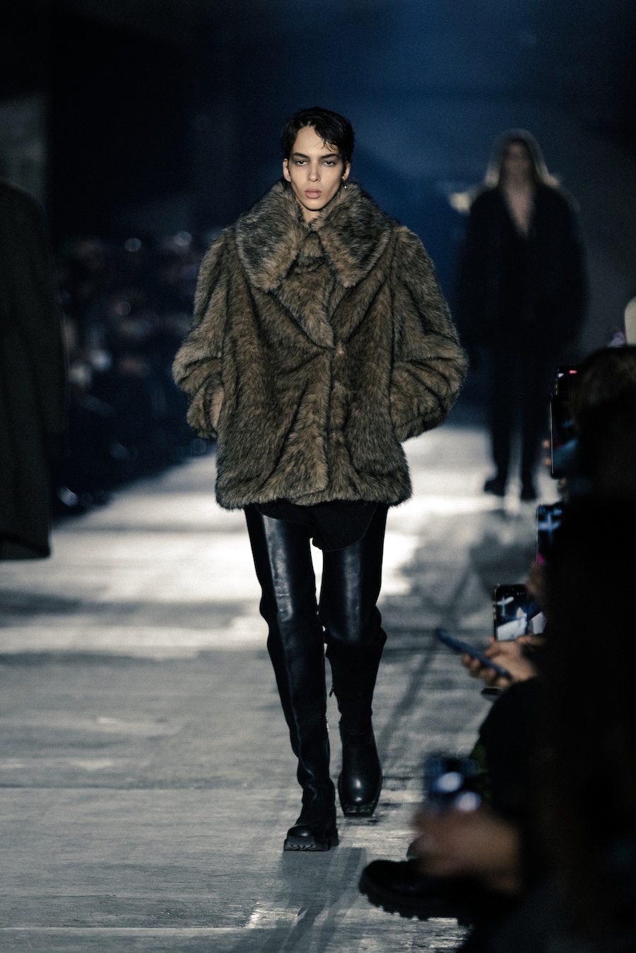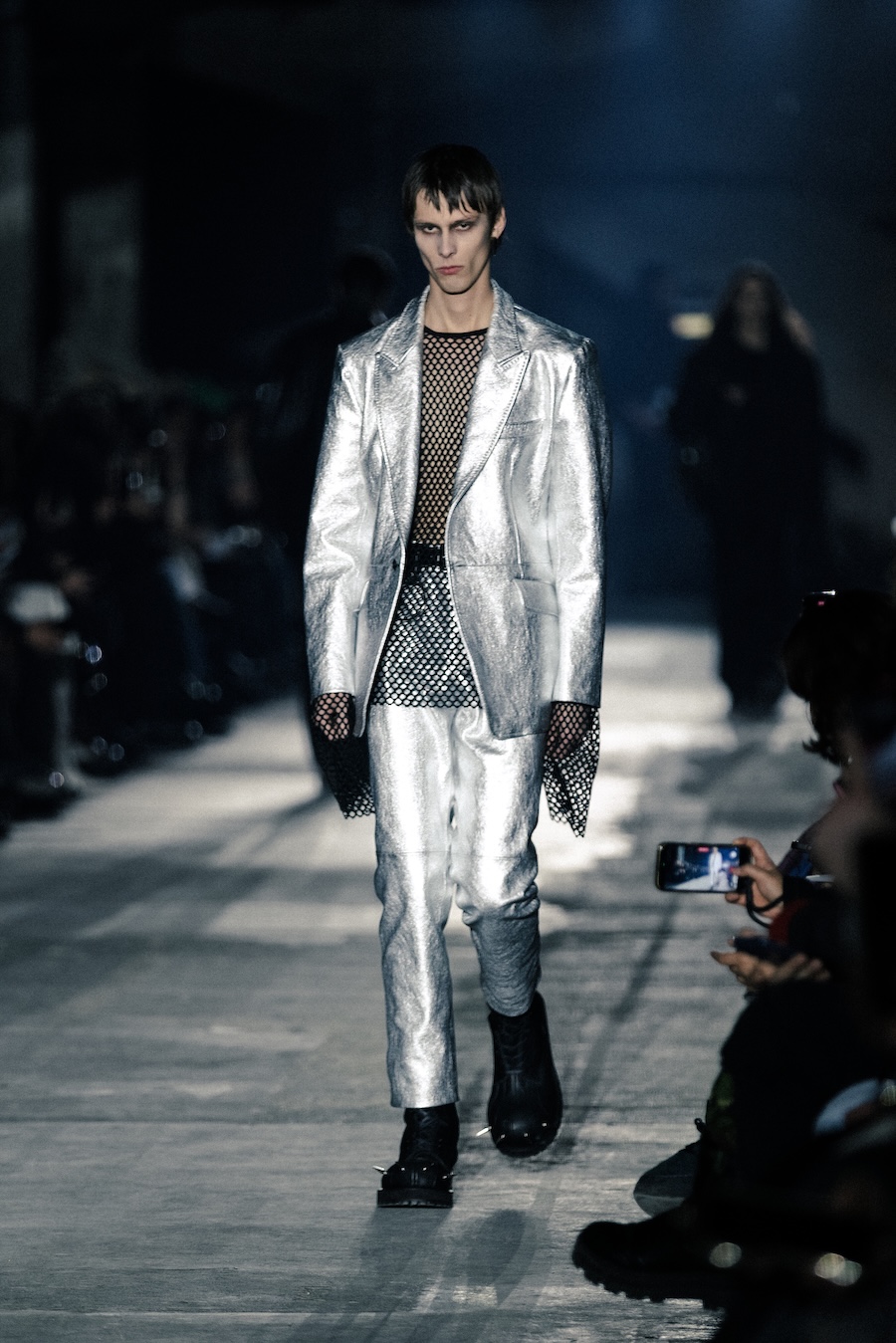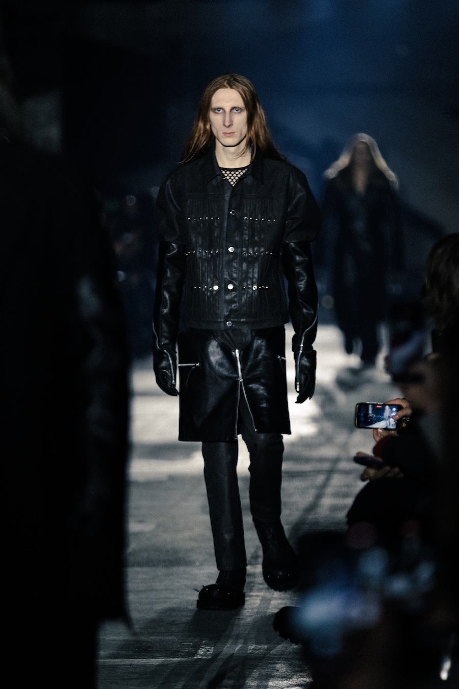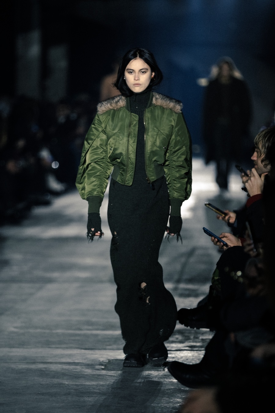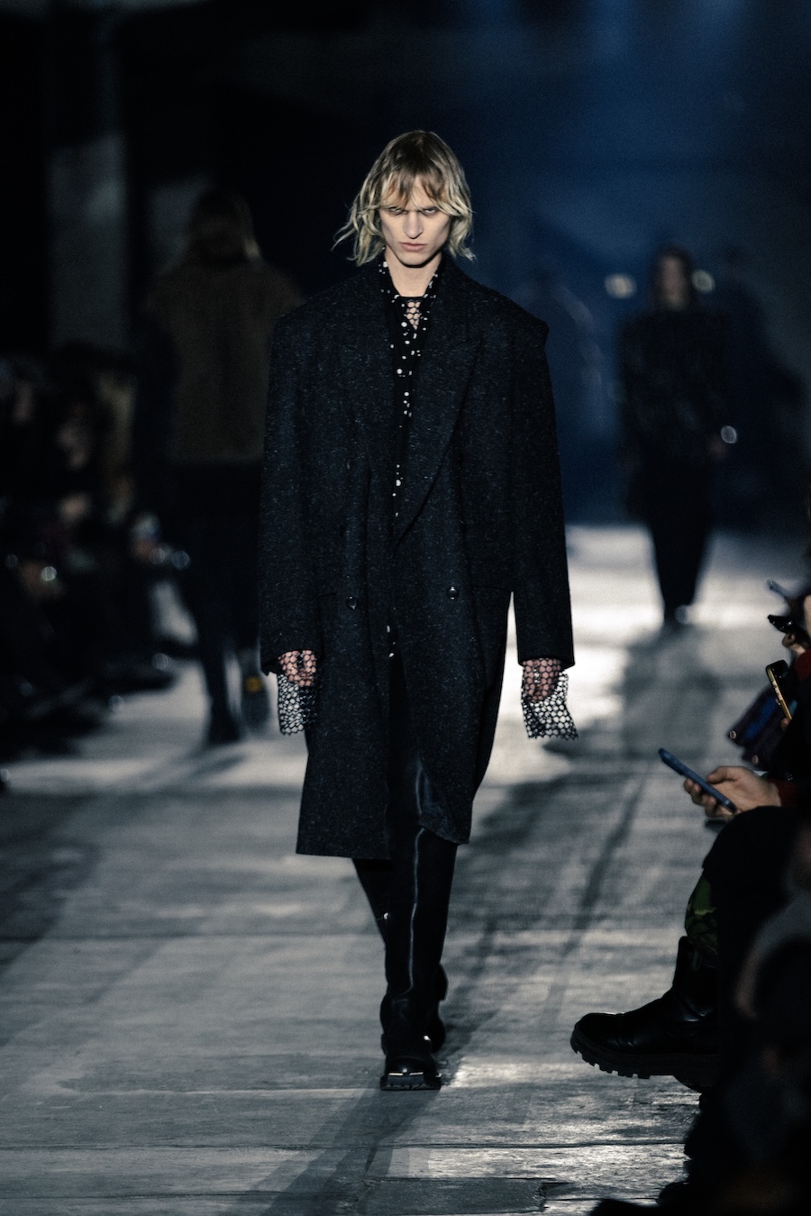 Hero pieces such as elongated coats, tailored jackets, bomber and biker jackets illustrate a silhouette that draws parallels to a boxer’s stance, forward-leaning and defensive. The innovative design features forward-set sleeves and exaggerated proportions, effectively shifting the wearer’s posture into a guarded, inward-facing position. This architectural approach serves to evoke an immediacy and tension that echoes the essence of combat.
