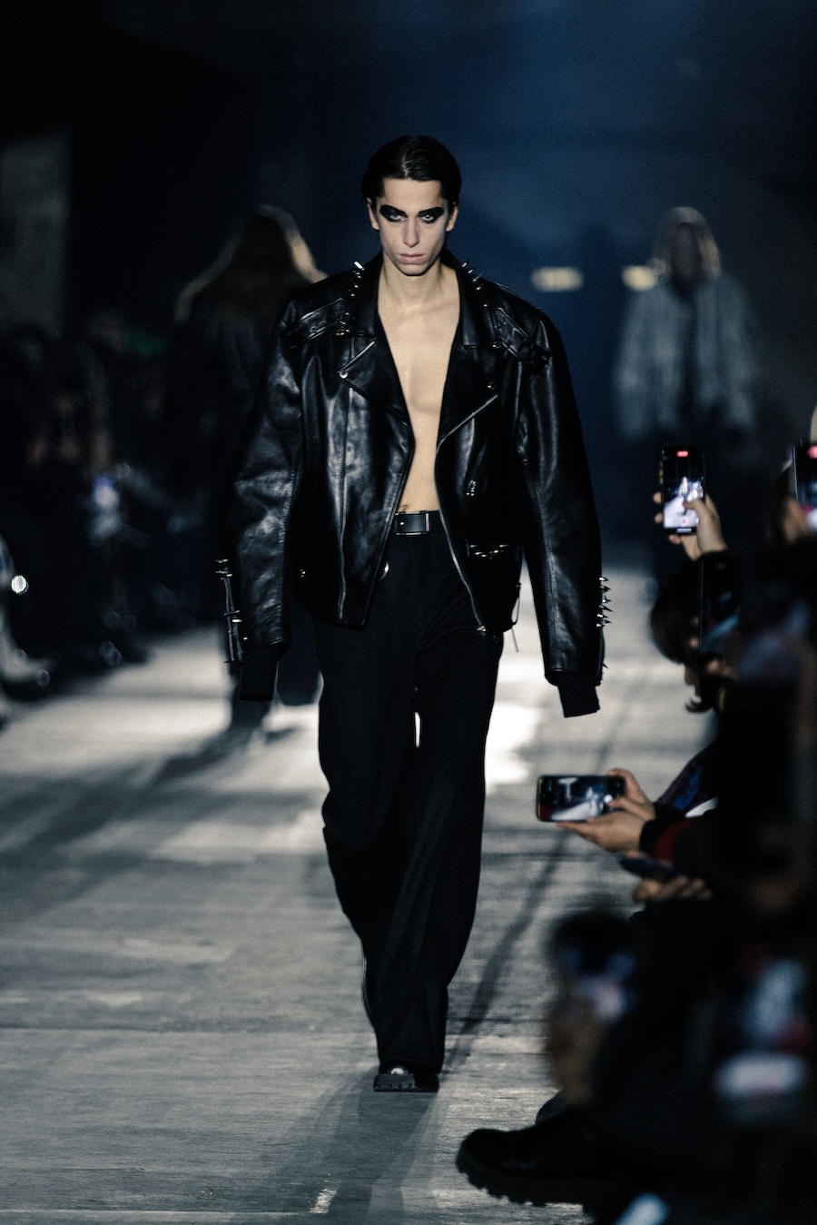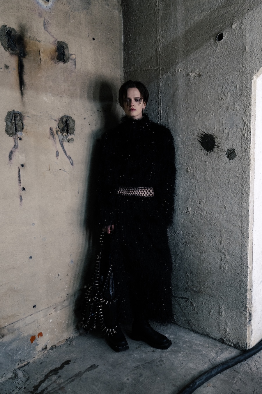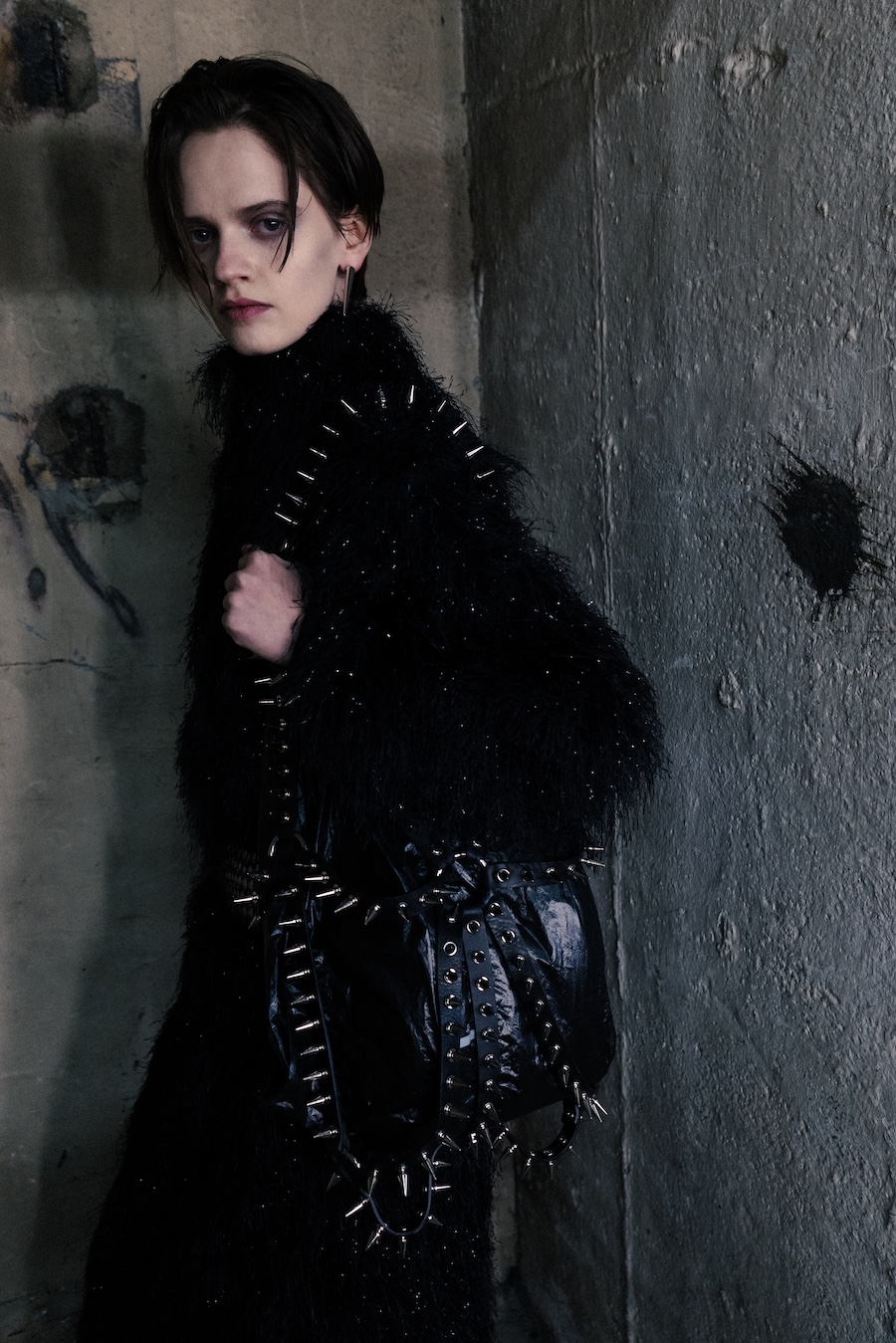 Accessories play a crucial role in this collection; their studded designs are not merely decorative but strategic in generating tension and asserting independence. Collaborations with YOSHiKO CREATiON and combat boots designed alongside KIDS LOVE GAITE further illustrate a commitment to both durability and style, utilising TEMPESTI’s Elbamatt Liscio leather and Vibram rubber soles.