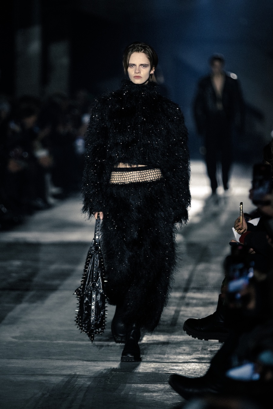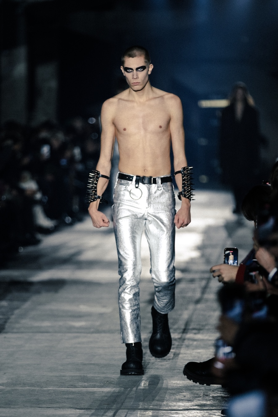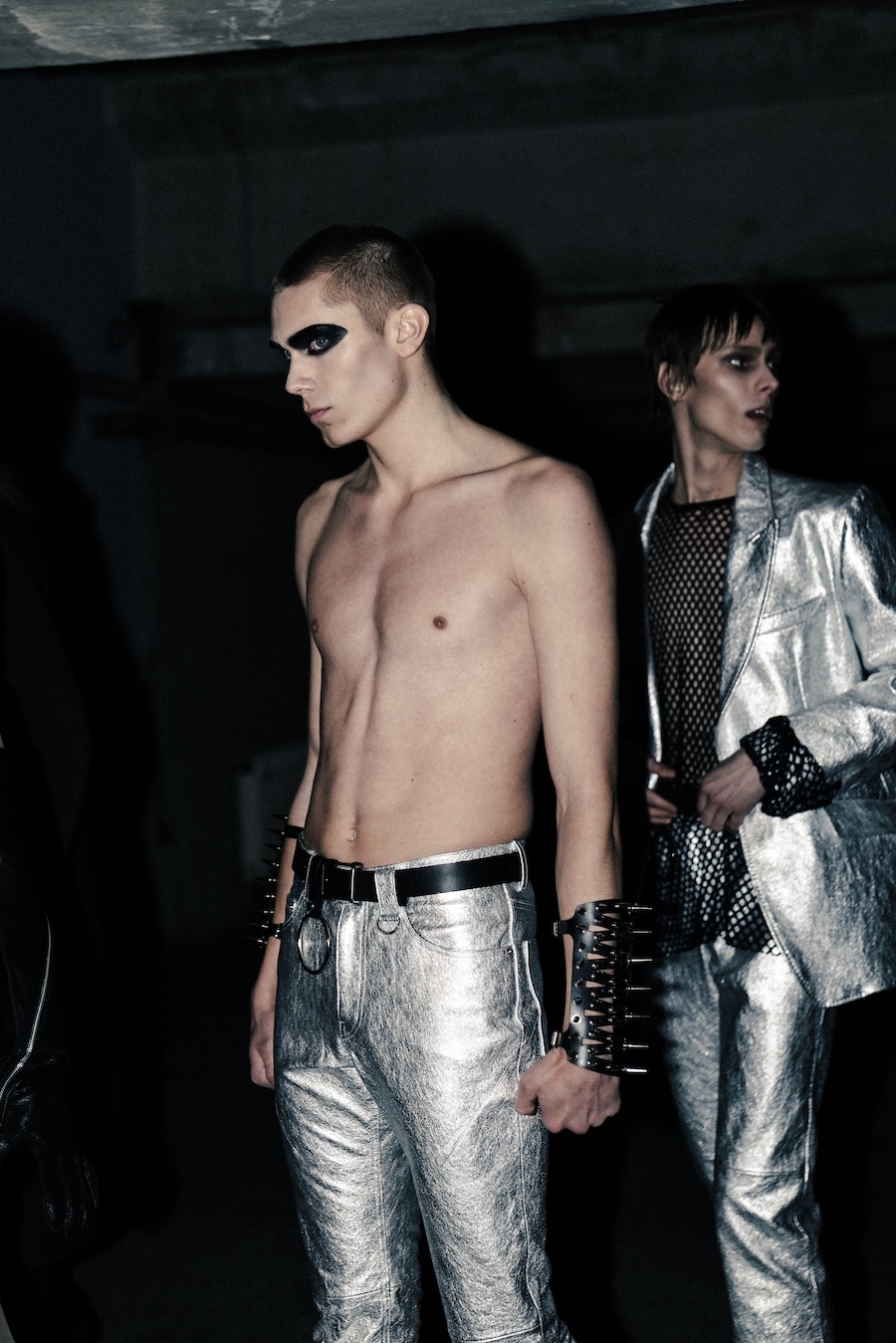 Accessories play a crucial role in this collection; their studded designs are not merely decorative but strategic in generating tension and asserting independence. Collaborations with YOSHiKO CREATiON and combat boots designed alongside KIDS LOVE GAITE further illustrate a commitment to both durability and style, utilising TEMPESTI’s Elbamatt Liscio leather and Vibram rubber soles.
