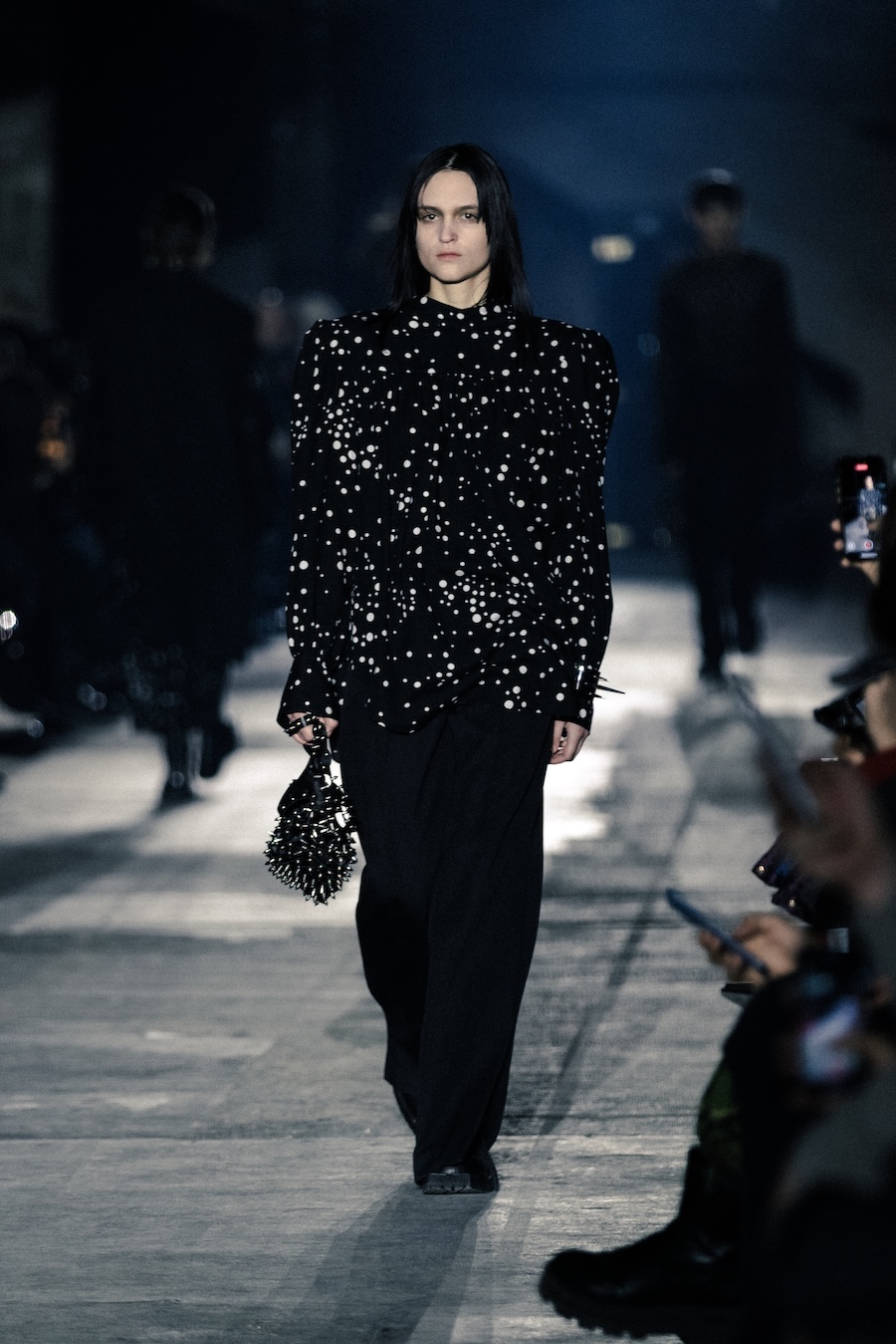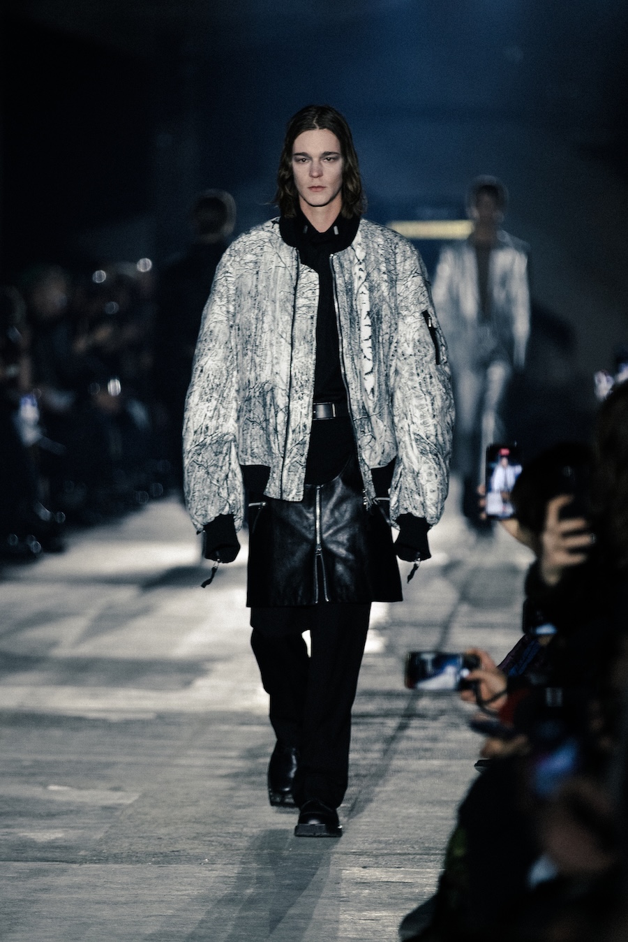 The collection’s textile choices, including second-skin leather, resilient melton wool, and a rich variety of materials like silk-nep flannel and icy silver lamé, function as protective membranes, amplifying bodily awareness while shielding against the outside world. An inspired colour palette dominated by deep blacks, crisp whites, and chill-inducing ice silvers creates a striking visual narrative, complemented by camouflage and dot prints that evoke the Nordic landscape.