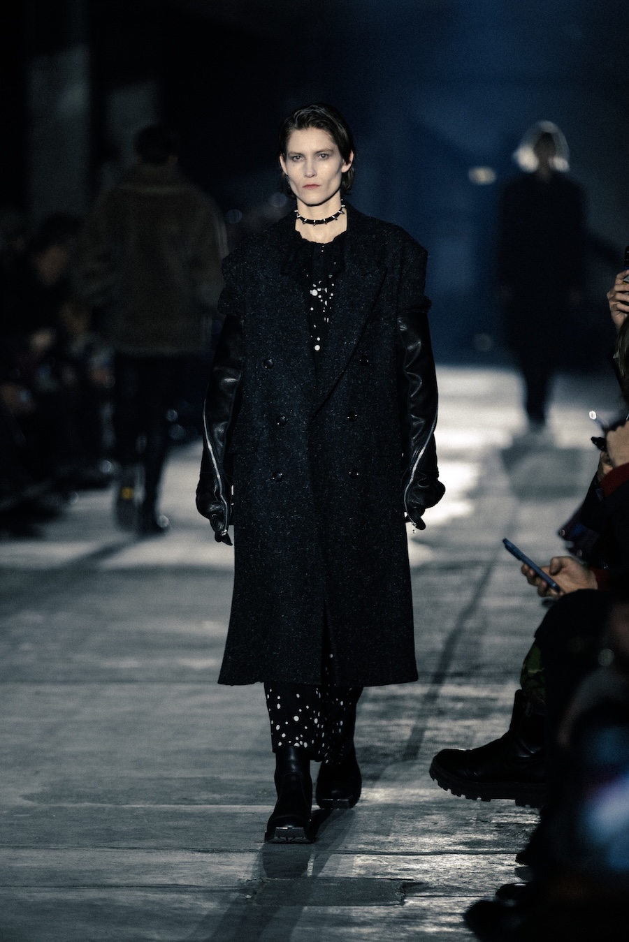 In women’s wear, the same thematic elements are echoed, with a focus on exaggerated shoulder silhouettes and the reinterpretation of masculine designs for the female form. This includes long denim skirts with tucks inspired by traditional Japanese biker uniforms, alongside coats that infuse lingerie elements into their construction.