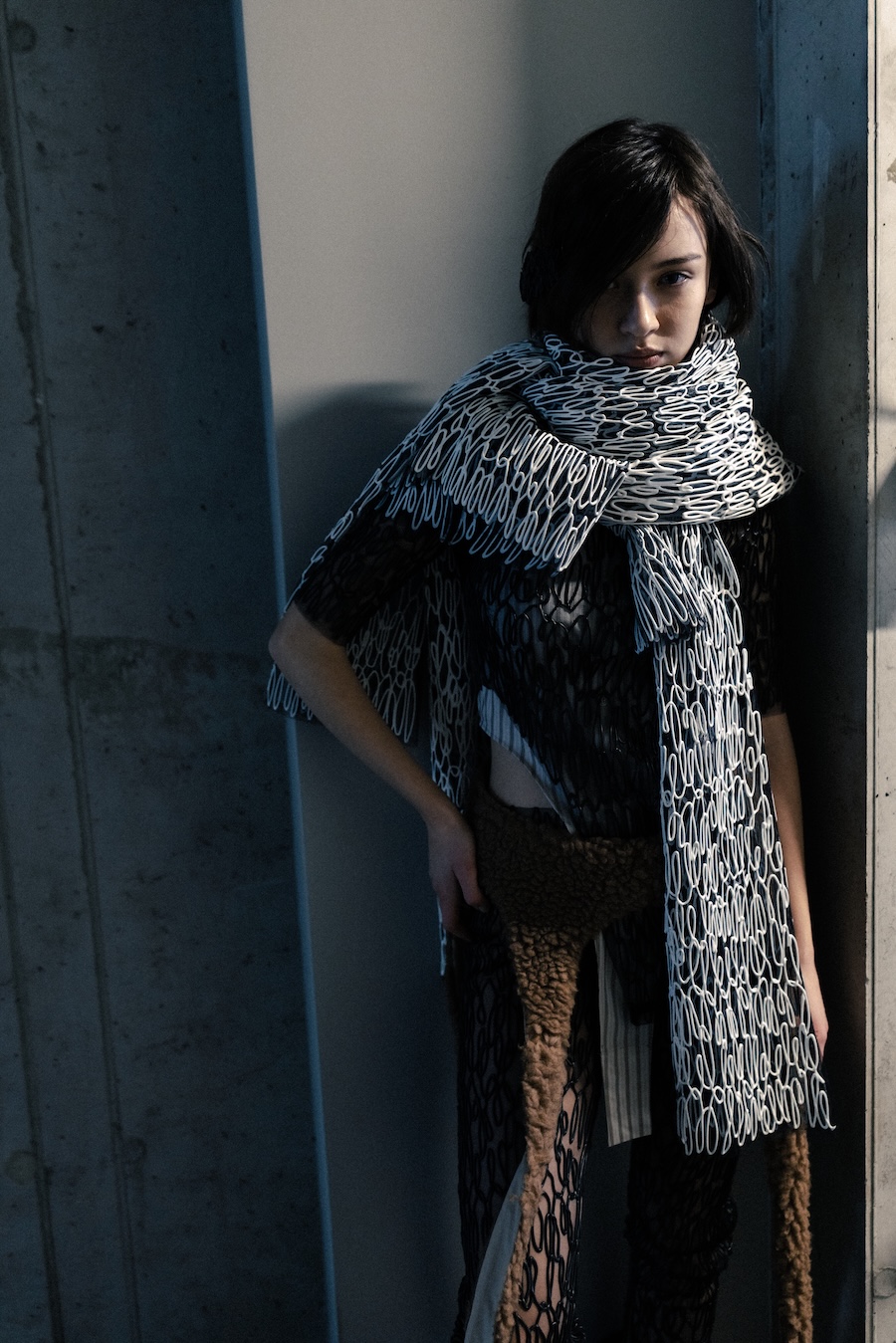 Kucharska’s collection resonates with the raw energy of female experience, reflecting anger towards the invisibility of emotional and physical labour often taken for granted within domestic spheres. This collective tension is powerfully represented through contrasting materials: black latex collides with soft pink plush, structured pinstripes meet fluid silhouettes, bringing forth a dialogue between seemingly opposing elements.