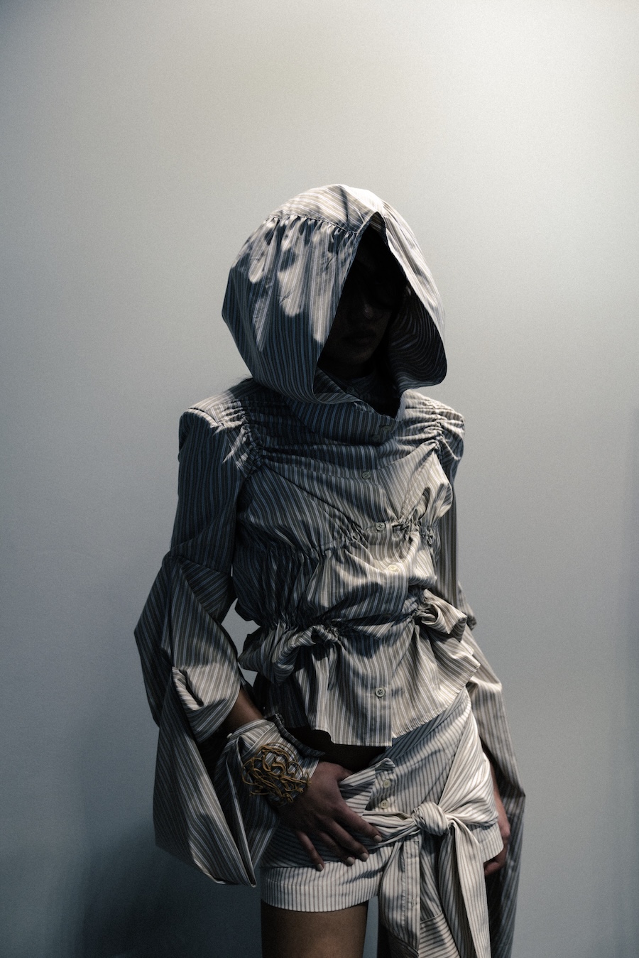 Central to the presentation is the innovative use of full-latex looks, which fragment and reinterpret these nostalgic figures, juxtaposed with a classic element, shirting. The shirt, a timeless and inherently intricate garment, is ingeniously deconstructed into modular, fast-to-wear pieces that cinch and tie rather than button. These designs cater to the modern woman, perpetually in motion and embodying multiple roles; her focus divided yet fueled by an undercurrent of love and simmering frustration.