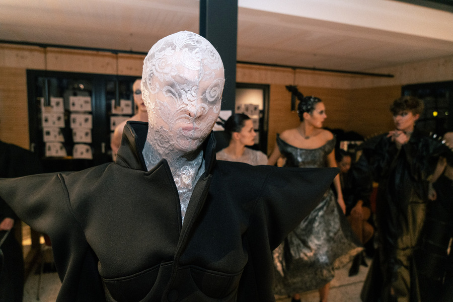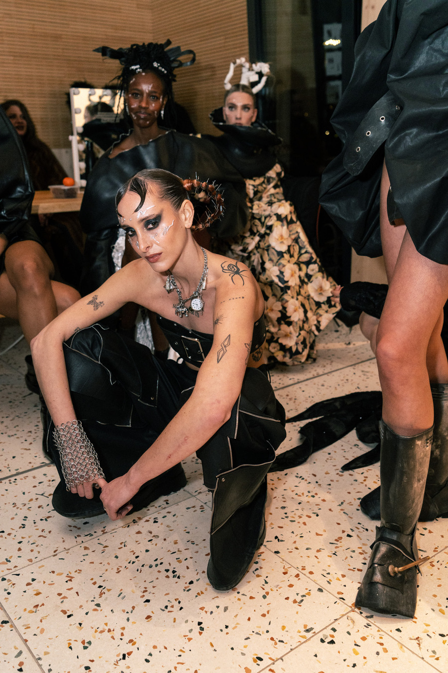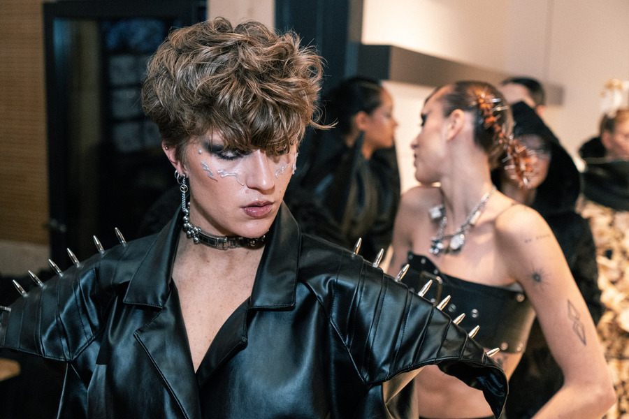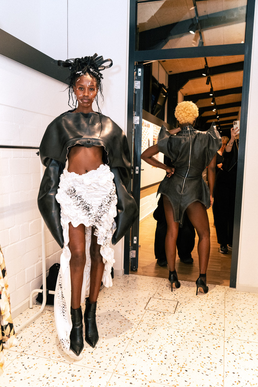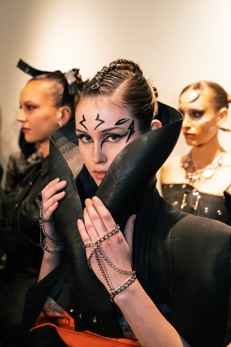 The jewellery in this collection, created by Genevieve-The Label and St. Grillz, along with hair and makeup accessories, utilize deadstock fabric and discarded tyre tubes. Accessories incorporate advanced 3D technology, developed by a talented team including Reem Jarhum, Chie Yamamoto, Takuya Usami, and Béanne Da Costa. Our hair and makeup designs also promote our commitment to upcycling and creativity. Additionally, the culinary offerings for the cast and crew reflect thoughtfulness, featuring organic, vegetarian, and vegan menus curated by Home of Dumpling and Spree Fumée. The venue supports sustainability with refillable drinking water faucets, minimizing single-use plastics. Accessibility is prioritized in the show design, including features such as a quiet zone to accommodate diverse needs.