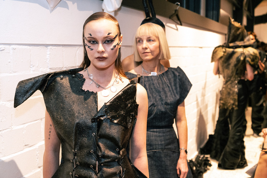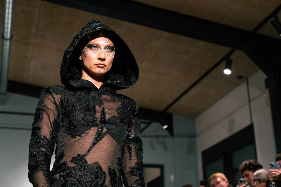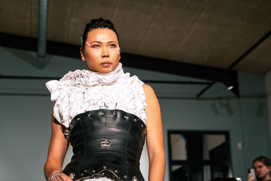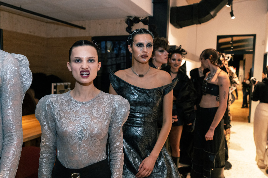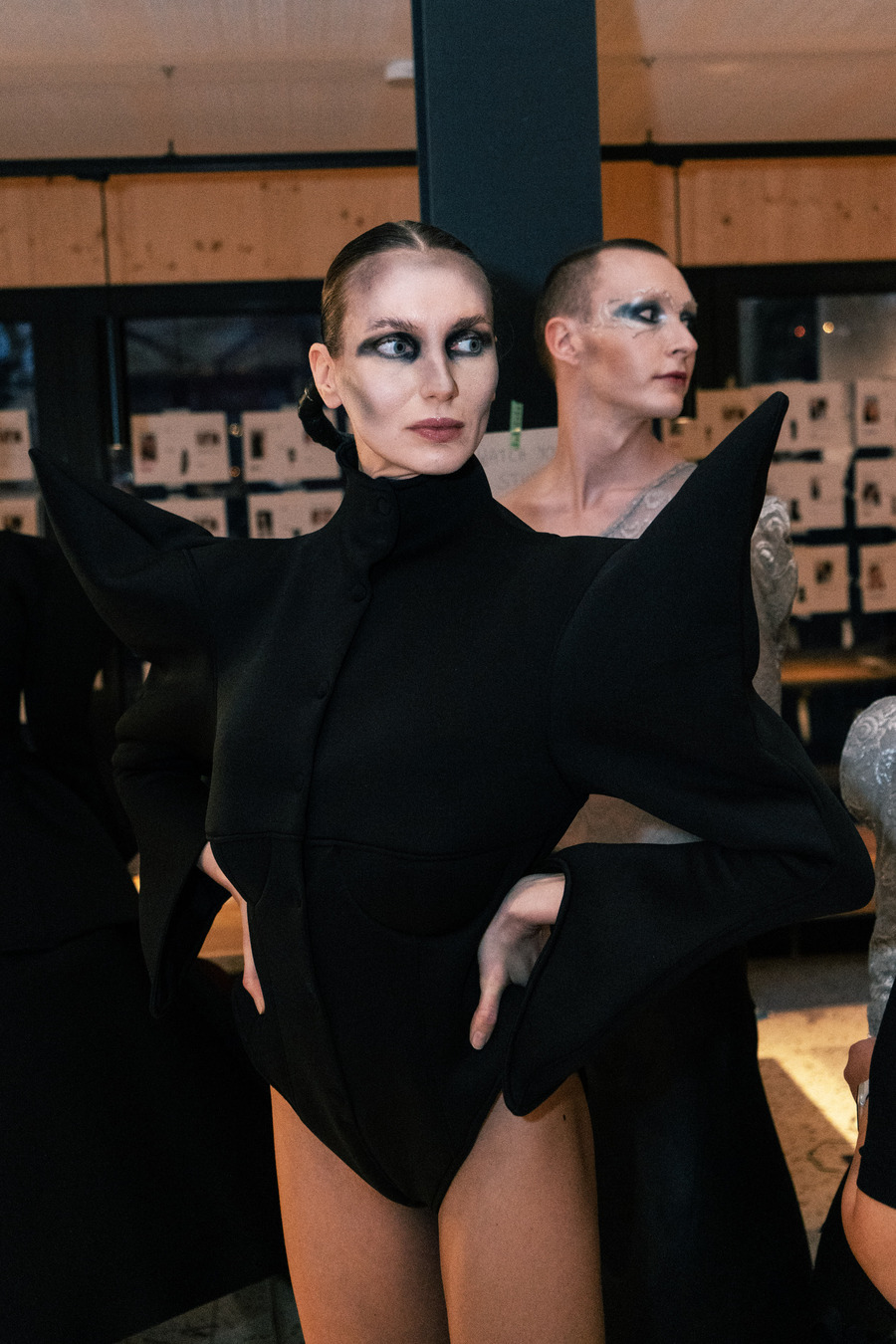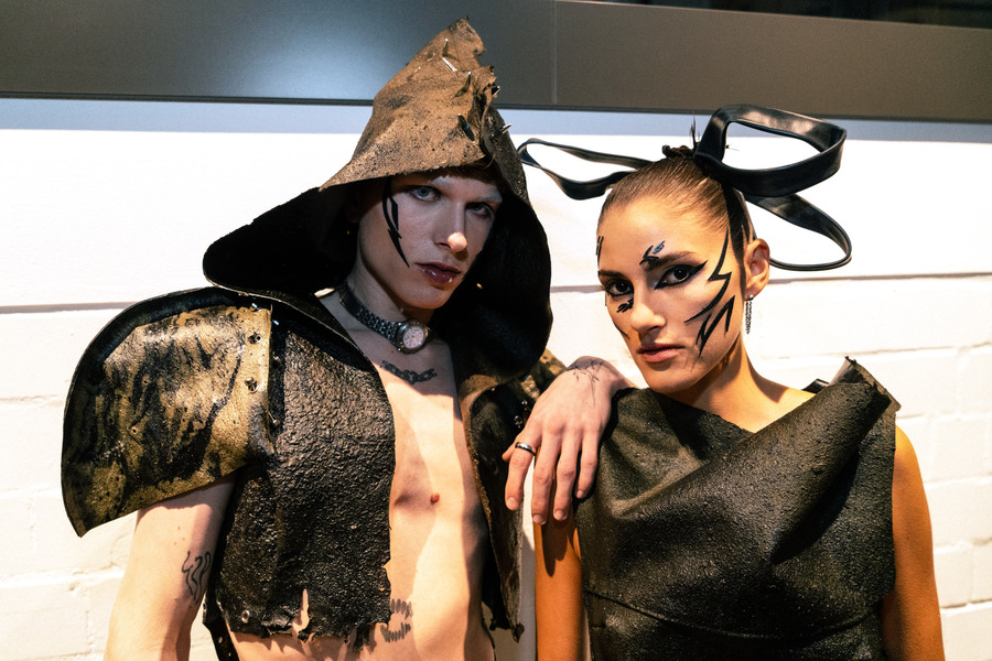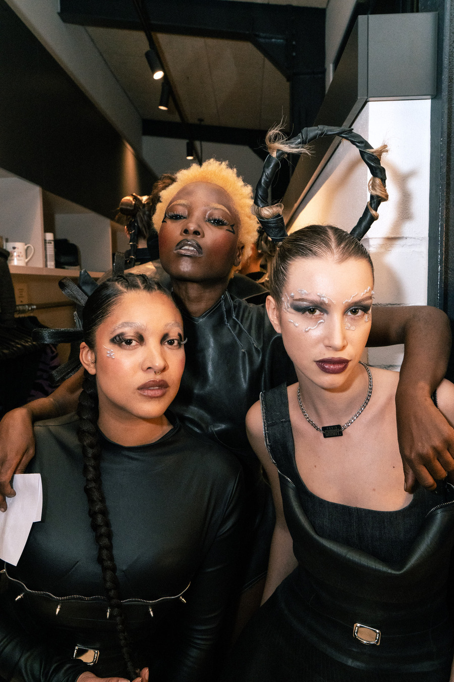 The jewellery in this collection, created by Genevieve-The Label and St. Grillz, along with hair and makeup accessories, utilize deadstock fabric and discarded tyre tubes. Accessories incorporate advanced 3D technology, developed by a talented team including Reem Jarhum, Chie Yamamoto, Takuya Usami, and Béanne Da Costa. Our hair and makeup designs also promote our commitment to upcycling and creativity. Additionally, the culinary offerings for the cast and crew reflect thoughtfulness, featuring organic, vegetarian, and vegan menus curated by Home of Dumpling and Spree Fumée. The venue supports sustainability with refillable drinking water faucets, minimizing single-use plastics. Accessibility is prioritized in the show design, including features such as a quiet zone to accommodate diverse needs.