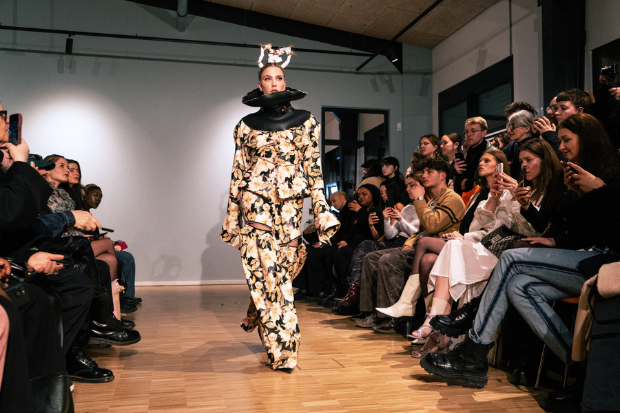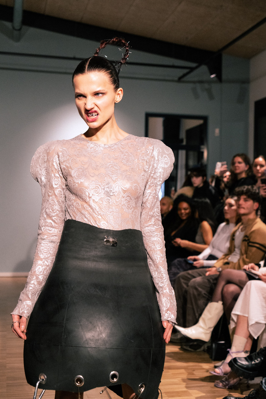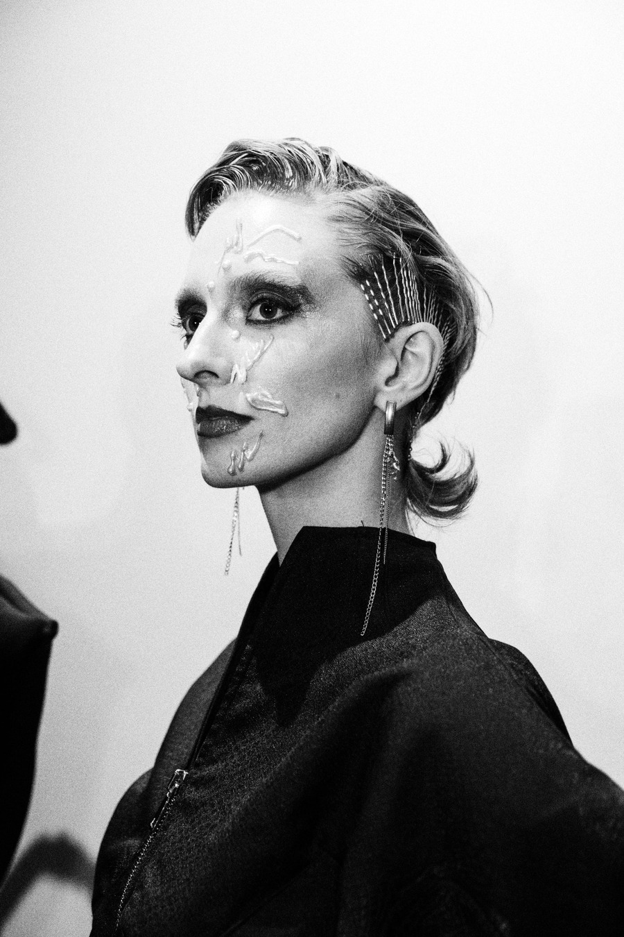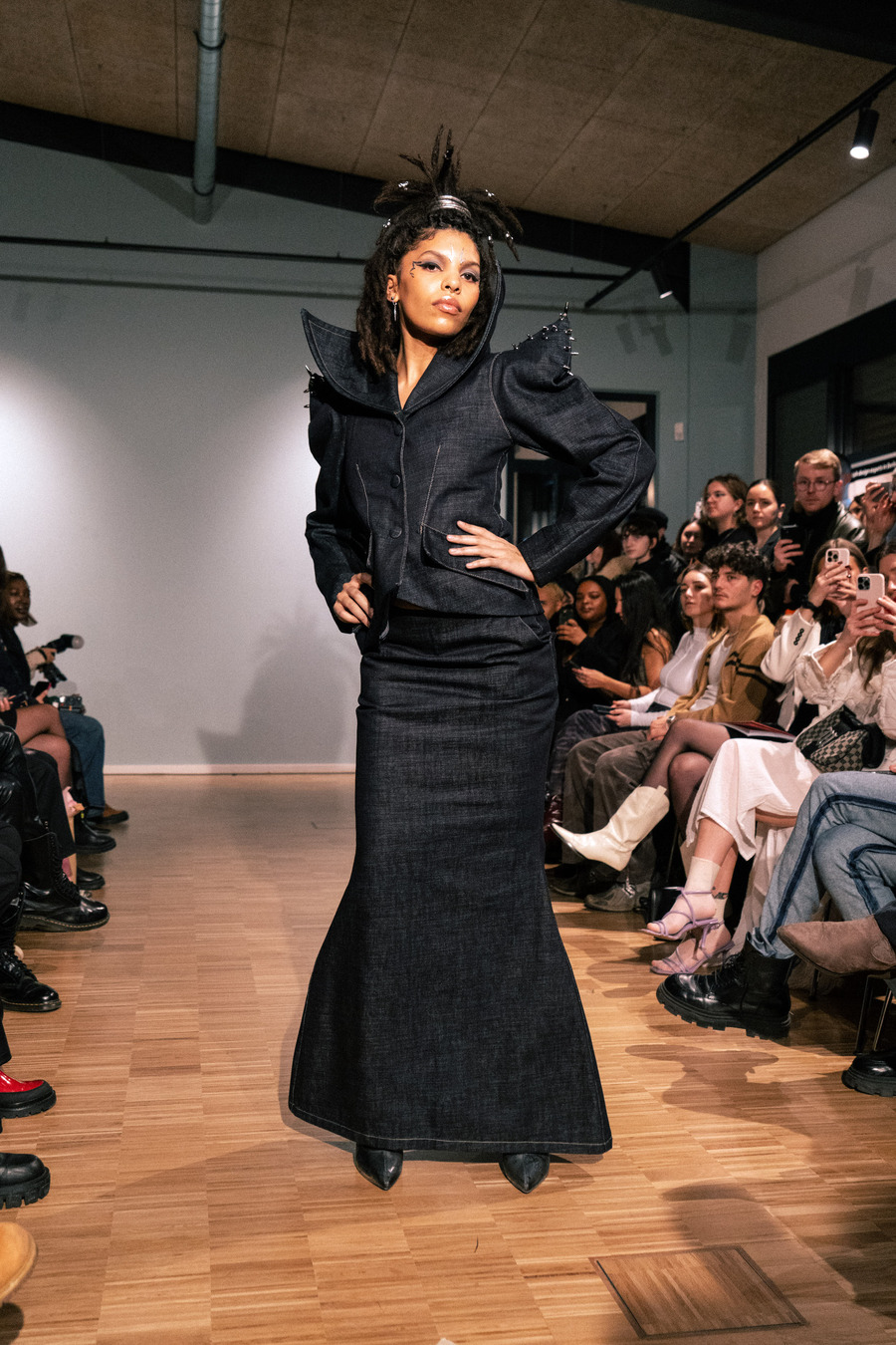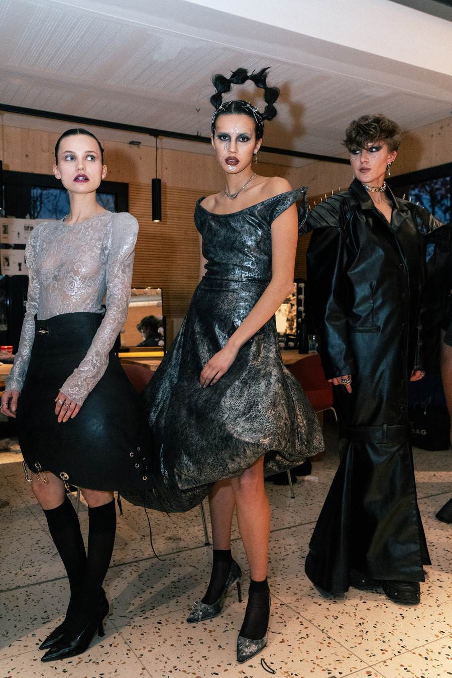 The jewellery in this collection, created by Genevieve-The Label and St. Grillz, along with hair and makeup accessories, utilize deadstock fabric and discarded tyre tubes. Accessories incorporate advanced 3D technology, developed by a talented team including Reem Jarhum, Chie Yamamoto, Takuya Usami, and Béanne Da Costa. Our hair and makeup designs also promote our commitment to upcycling and creativity. Additionally, the culinary offerings for the cast and crew reflect thoughtfulness, featuring organic, vegetarian, and vegan menus curated by Home of Dumpling and Spree Fumée. The venue supports sustainability with refillable drinking water faucets, minimizing single-use plastics. Accessibility is prioritized in the show design, including features such as a quiet zone to accommodate diverse needs.