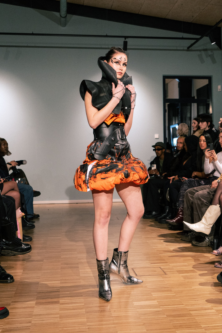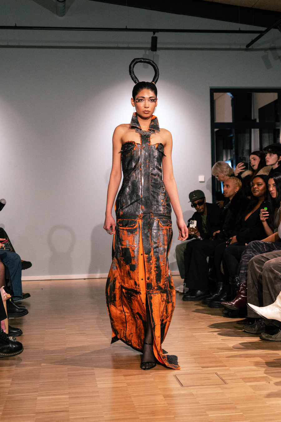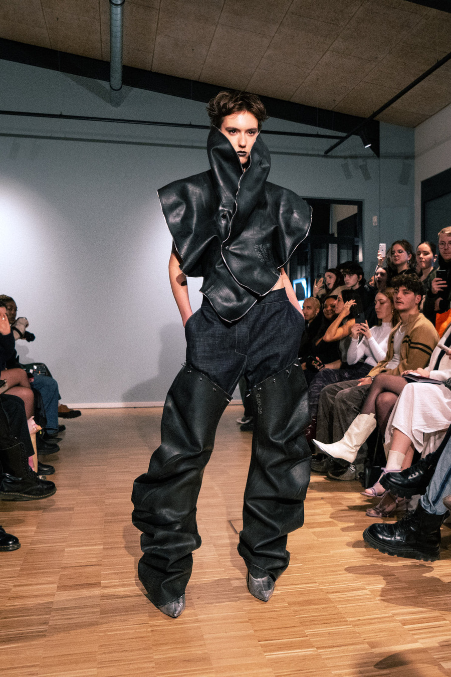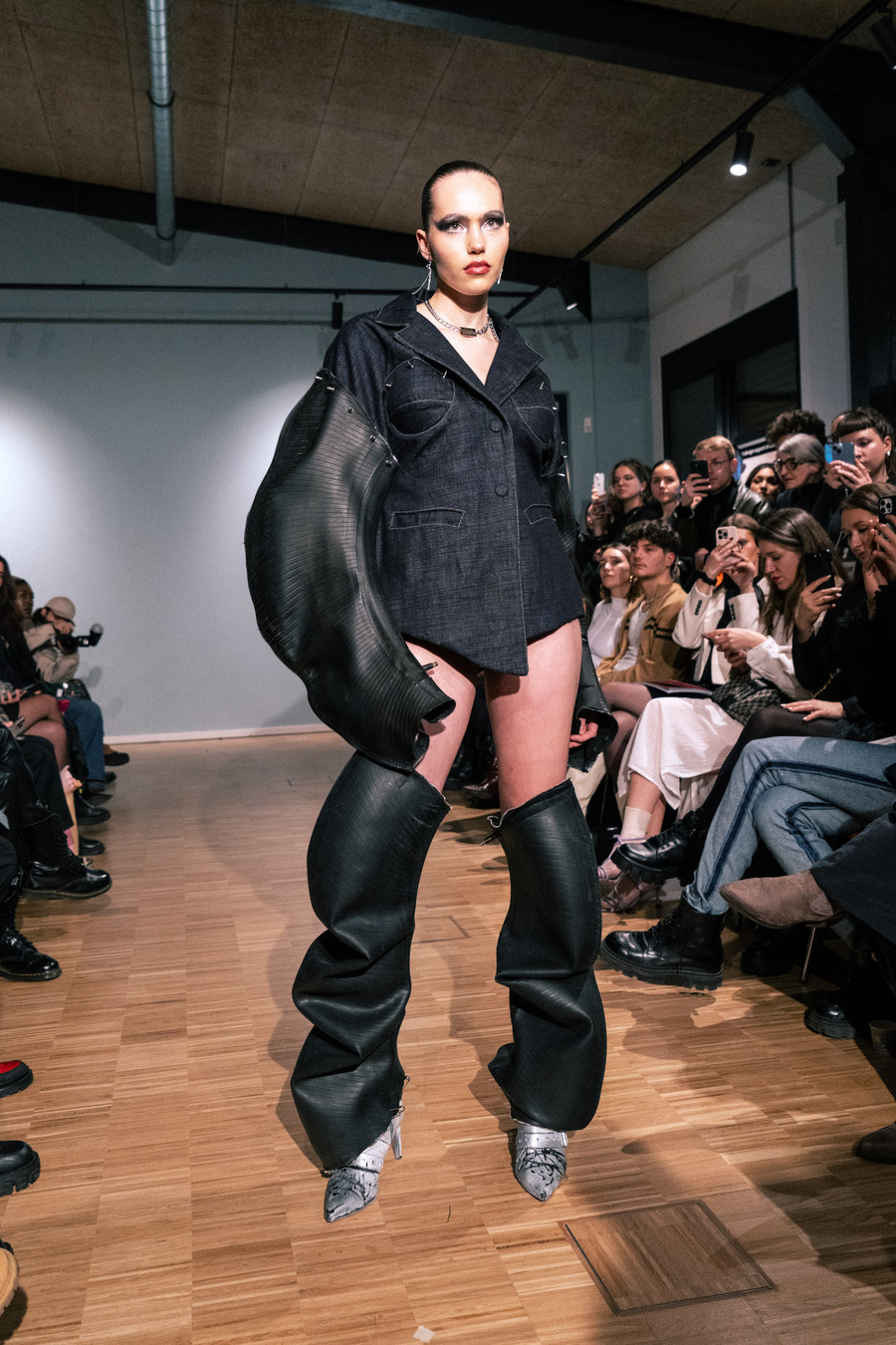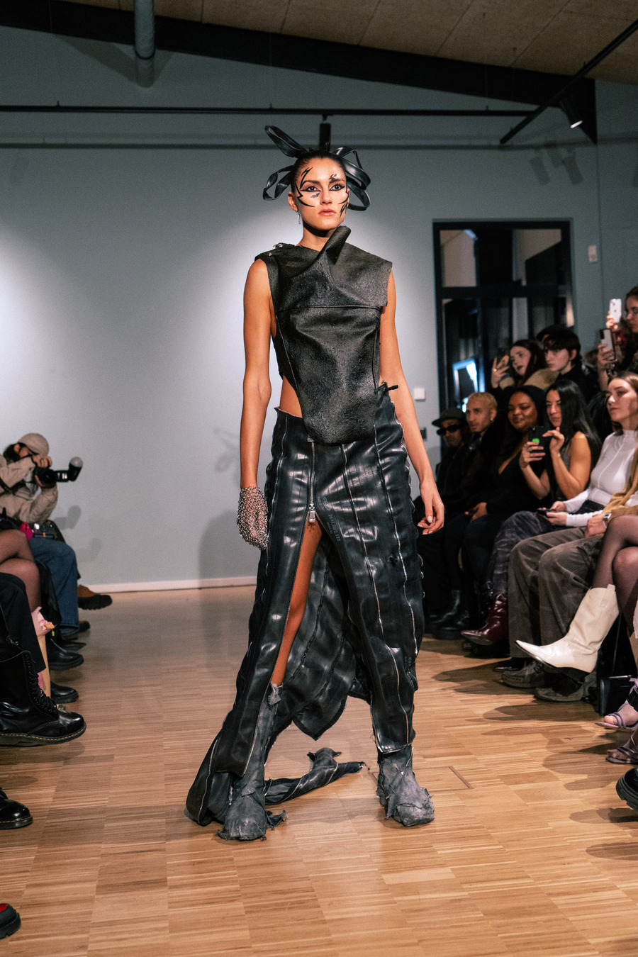 Berlin Fashion Week! ELYSIUM by Maria Chany is an innovative collection that emphasizes the transformation of waste into conscious fashion garments and accessories. This collection includes jackets, dresses, outerwear, and statement pieces made from reclaimed rubber, bio-materials derived from nuts, and deadstock fabrics. ELYSIUM merges rugged industrial elements with sleek, modern silhouettes, showcasing Maria Chany’s forward-thinking design aesthetic.