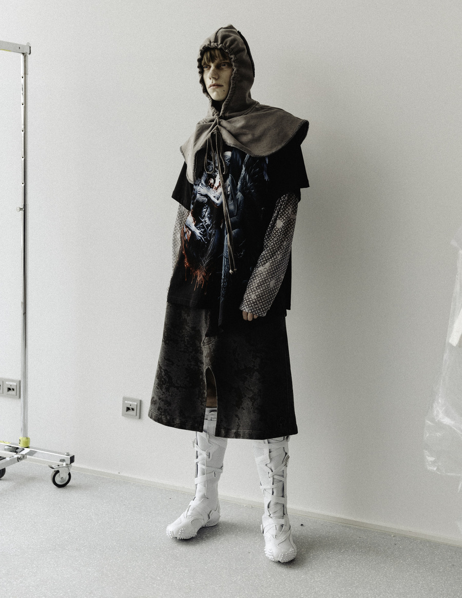 Inspired by the concept of “friendly stalking” and the existential feeling of entrapment, The Shell marries historical aesthetics with an underground vibe. Picture the opulence of 19th-century tapestries, intricate curtains, and carpet prints, all reinvigorated with a pulsating, rave-like energy. This collection evokes the haunting grandeur of a dilapidated castle, promising a feast for the senses.