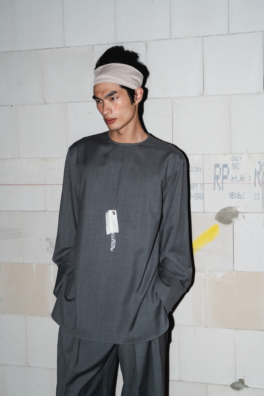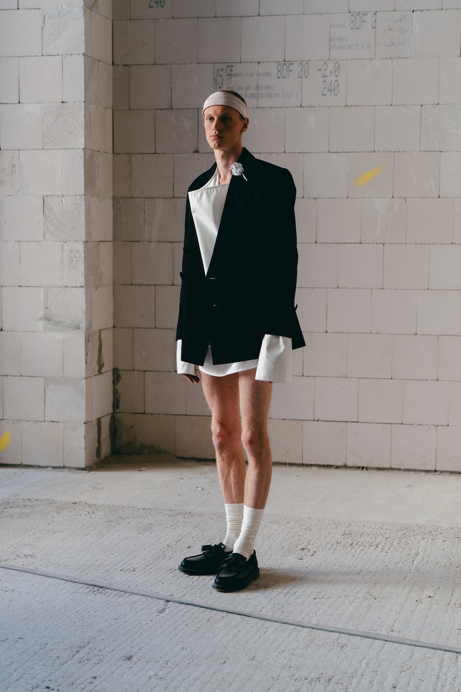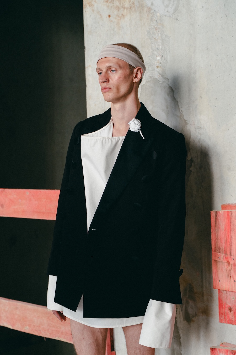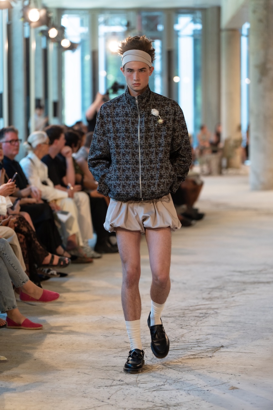 A restrained palette, black, white, pigeon blue, charcoal, grey, and soft rosé, frames the emotional landscape of the collection, grounded by textiles that oscillate between protection and vulnerability. The mix of cotton/silk and wool/silk tailoring flows seamlessly into the softness of washed denim and jersey. Prints echo the botanical melancholy of Redouté, interweaving queer longing with the quiet persistence of the natural world.