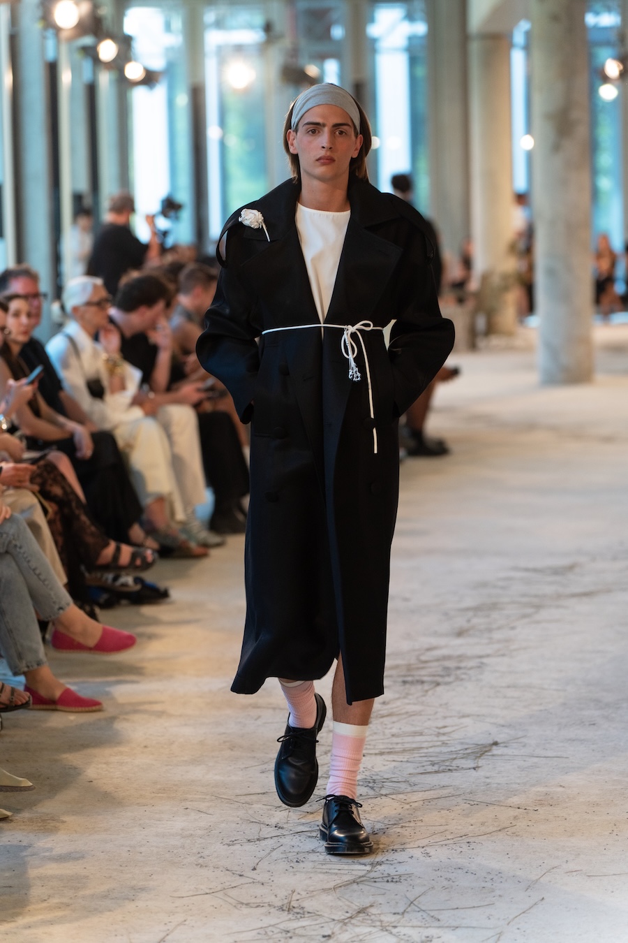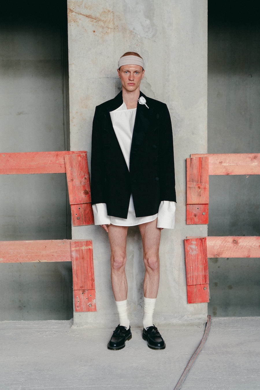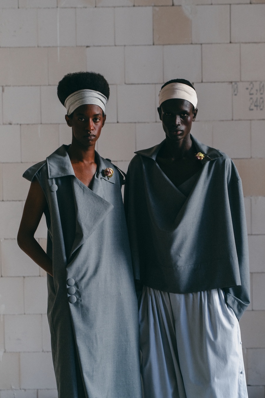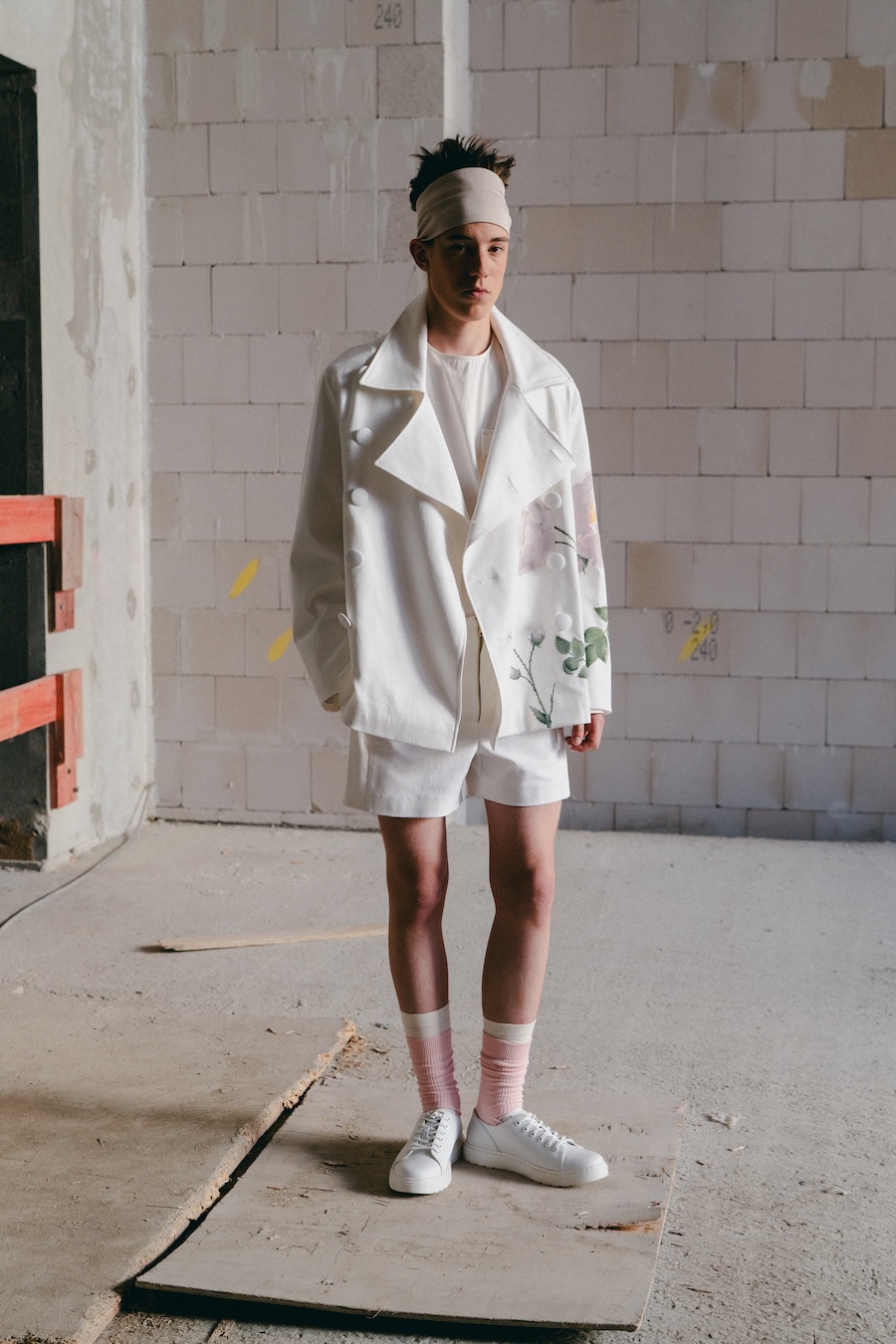 A restrained palette, black, white, pigeon blue, charcoal, grey, and soft rosé, frames the emotional landscape of the collection, grounded by textiles that oscillate between protection and vulnerability. The mix of cotton/silk and wool/silk tailoring flows seamlessly into the softness of washed denim and jersey. Prints echo the botanical melancholy of Redouté, interweaving queer longing with the quiet persistence of the natural world.