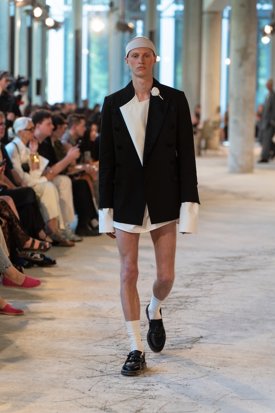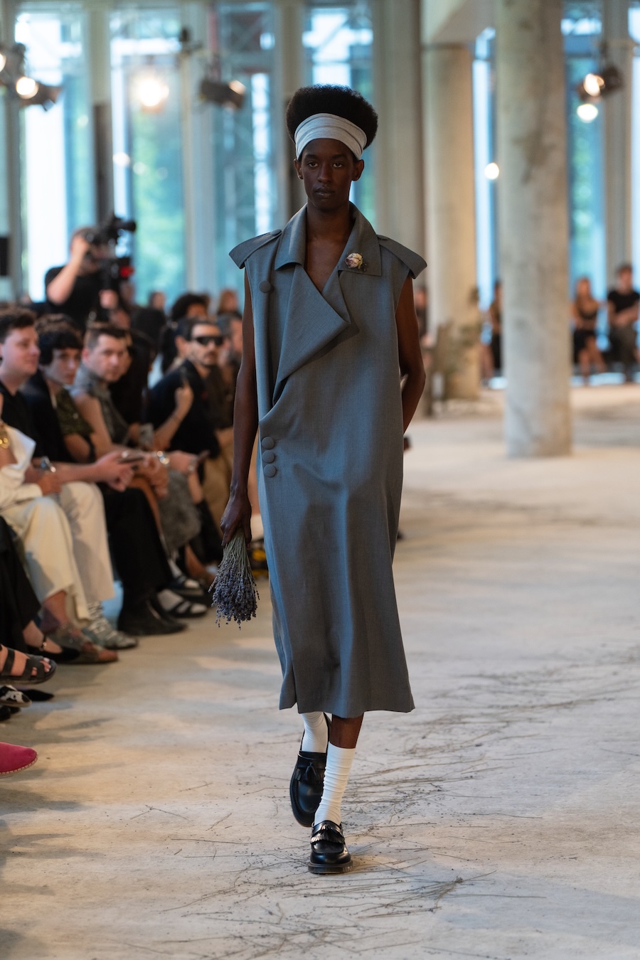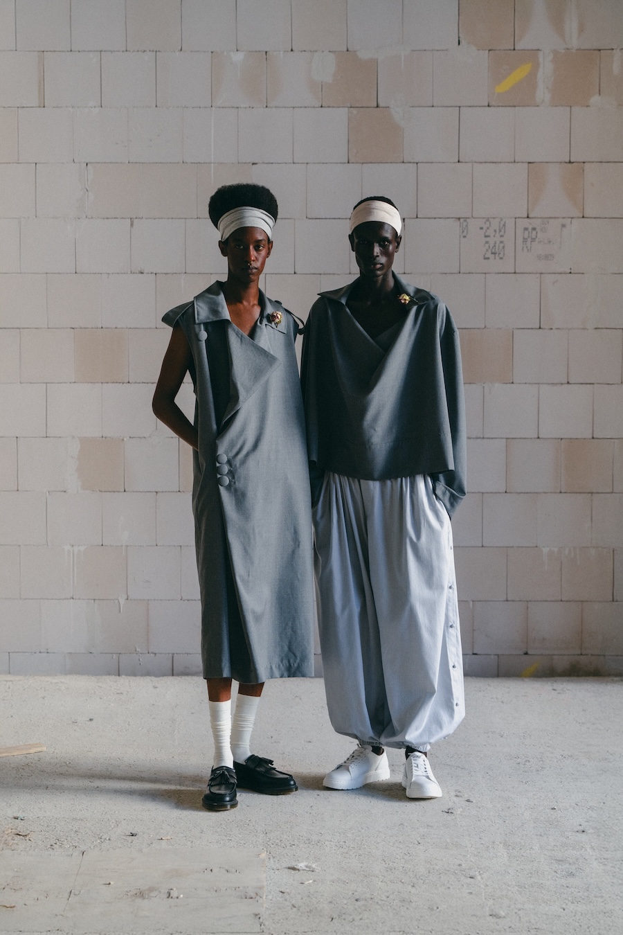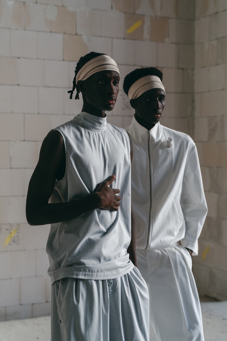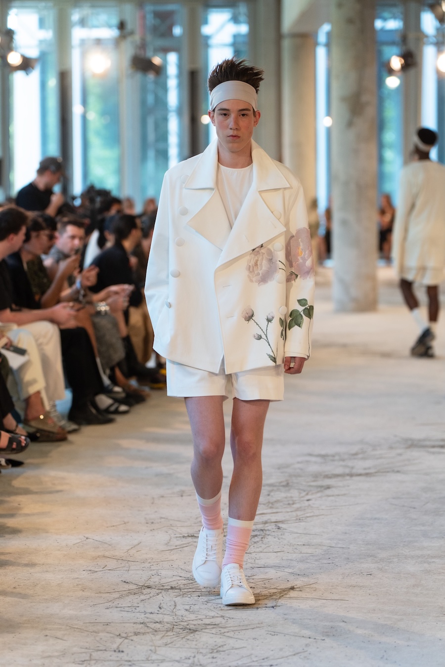 A restrained palette, black, white, pigeon blue, charcoal, grey, and soft rosé, frames the emotional landscape of the collection, grounded by textiles that oscillate between protection and vulnerability. The mix of cotton/silk and wool/silk tailoring flows seamlessly into the softness of washed denim and jersey. Prints echo the botanical melancholy of Redouté, interweaving queer longing with the quiet persistence of the natural world.