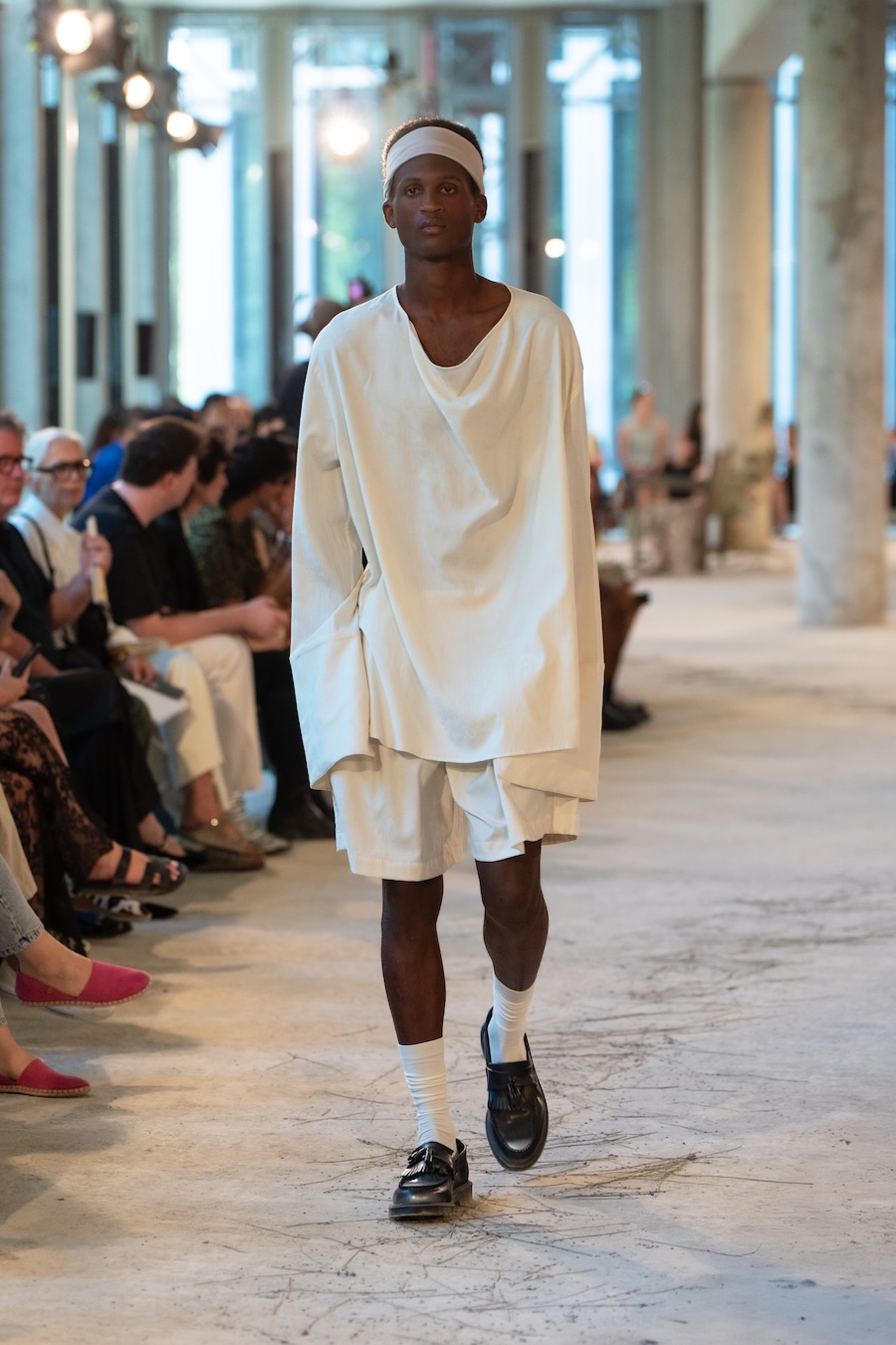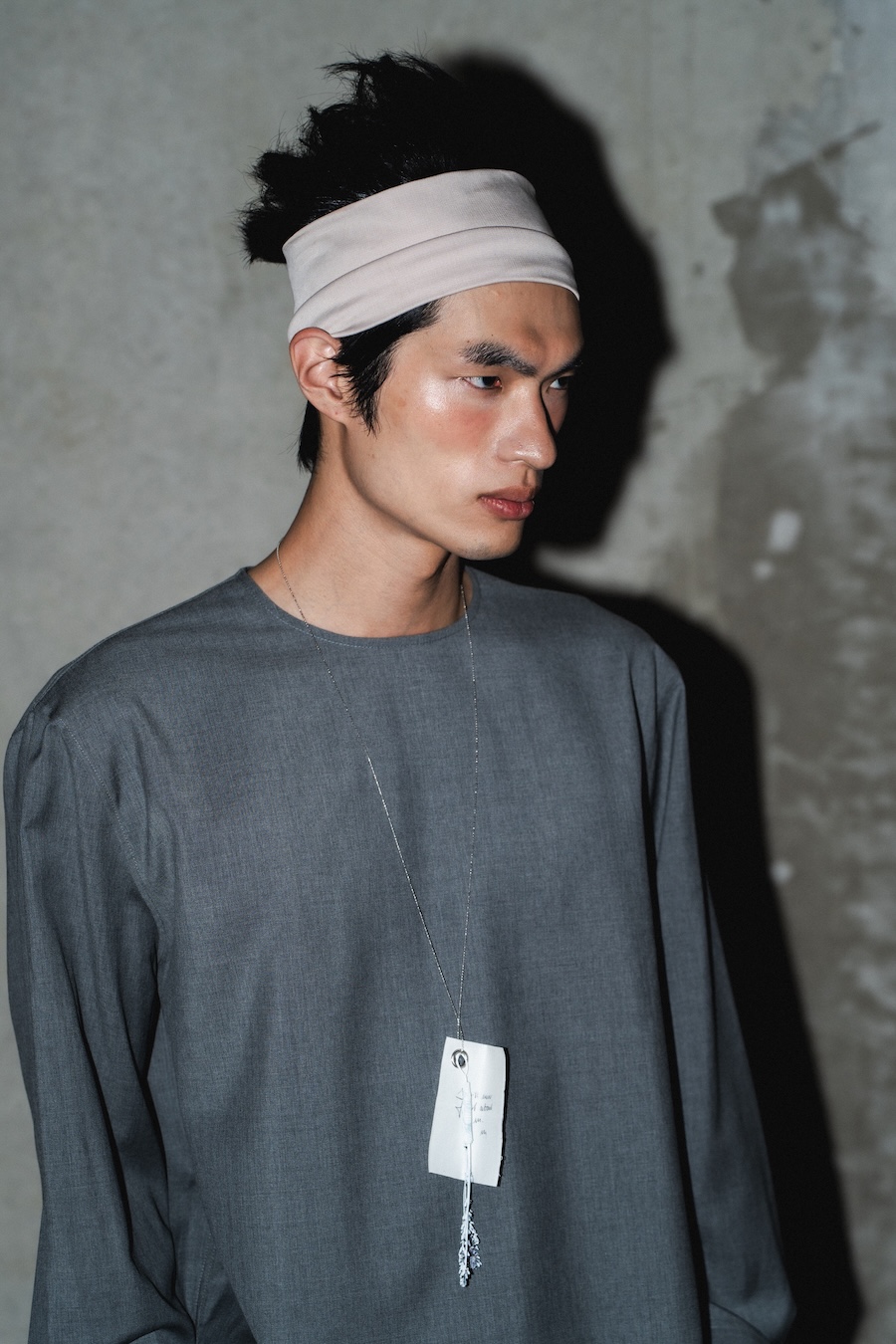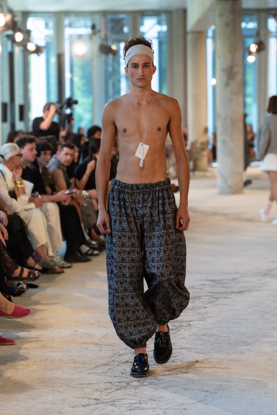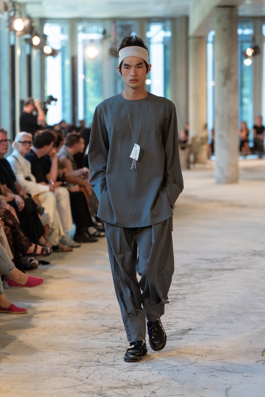 A restrained palette, black, white, pigeon blue, charcoal, grey, and soft rosé, frames the emotional landscape of the collection, grounded by textiles that oscillate between protection and vulnerability. The mix of cotton/silk and wool/silk tailoring flows seamlessly into the softness of washed denim and jersey. Prints echo the botanical melancholy of Redouté, interweaving queer longing with the quiet persistence of the natural world.
