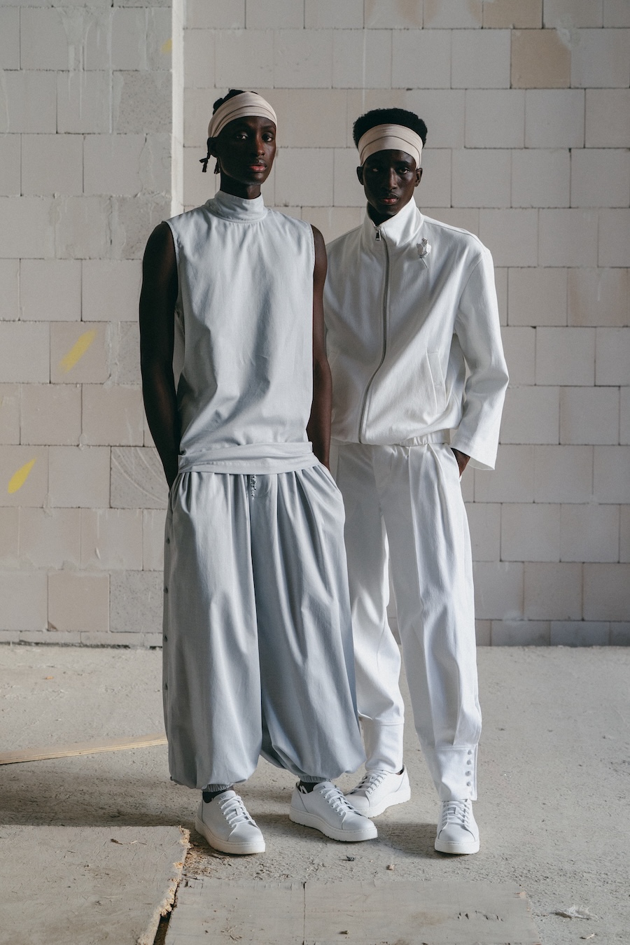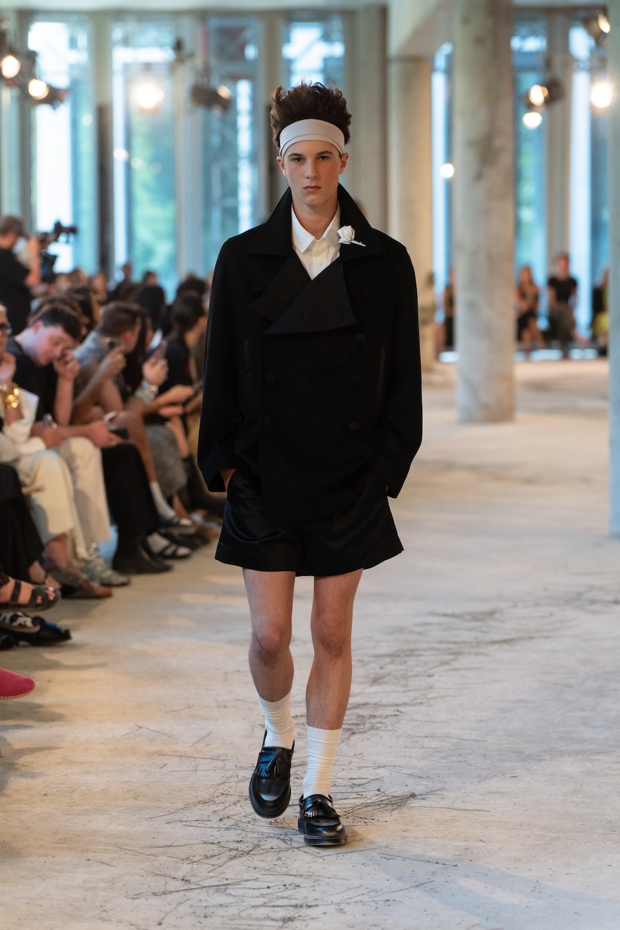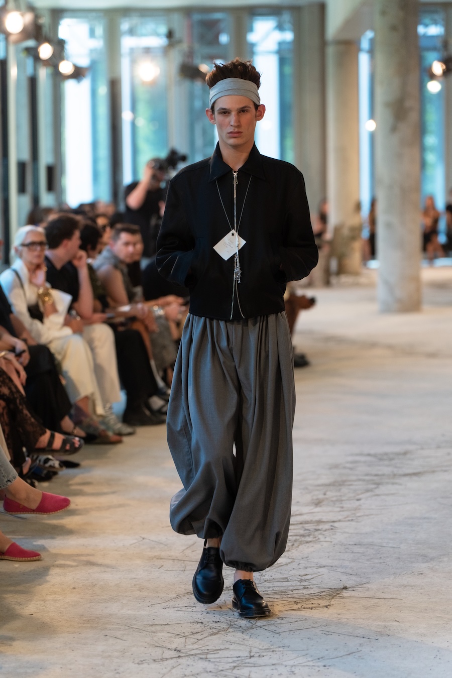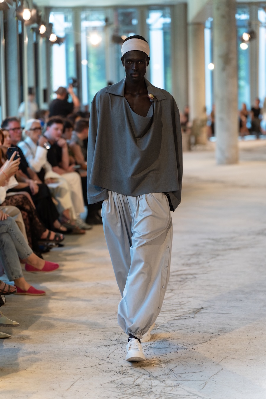 A restrained palette, black, white, pigeon blue, charcoal, grey, and soft rosé, frames the emotional landscape of the collection, grounded by textiles that oscillate between protection and vulnerability. The mix of cotton/silk and wool/silk tailoring flows seamlessly into the softness of washed denim and jersey. Prints echo the botanical melancholy of Redouté, interweaving queer longing with the quiet persistence of the natural world.